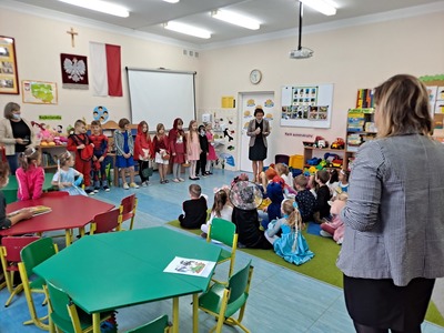 Nie zabrakło w tym ważnym dla naszego przedszkola dniu odśpiewania hymnu „Witajcie w naszej bajce”.