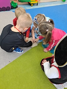 Przedszkolaków odwiedził również niezwykły gość a mianowicie Baba Jaga, którą dzieci zaraz odgadły z bajki Jaś i Małgosia. Dzieci otrzymały od Baba Jagi naszyjniki szczęścia oraz słodki upominek.