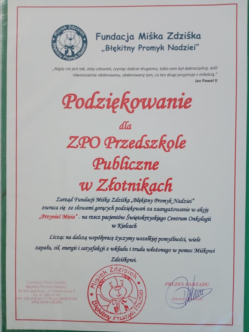 Fundacja Miśka Zdziśka „Błękitny Promyk Nadziei” składa serdeczne podziękowania dzieciom , które przyłączyły się do akcji Przynieś Misia.