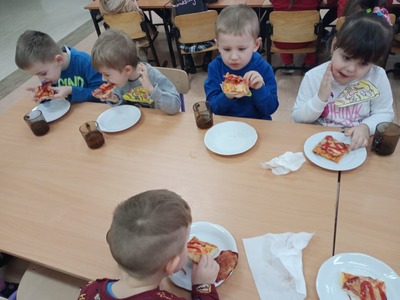 9 lutego Słoneczka obchodziły Międzynarodowy Dzień Pizzy. Tego dnia, nasza stołówka zamieniła się w prawdziwą włoską pizzerię, a dzieci wcieliły się w rolę włoskich kucharzy i przygotowały pizzę. Wielką frajdę sprawiły już same przygotowania: nakładanie sosu pomidorowego, ulubionych składników oraz posypywanie serem. Gdy wszystko było gotowe, pizza powędrowała do piekarnika, który sfinalizował całą pracę. Zapach pizzy unosił się po całym przedszkolu i nie sposób było jej się oprzeć. Było pysznie, zdrowo i kolorowo. Cały dzień upłynął w miłej i radosnej atmosferze. Dzięki tej imprezie dzieci poznały historię pizzy, dowiedziały się z którego kraju pochodzi oraz wspólnie stwierdziły, że własnoręcznie zrobiona pizza jest o wiele smaczniejsza i zdrowsza.