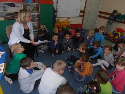 Już po raz drugi odwiedziła nas Pani Beata Drdzeń, która na co dzień pracuje, jako pielęgniarka w Szpitalu w Jędrzejowie, a prywatnie mama naszego przedszkolaka - Bartusia. Dzieci dowiedziały się, w jaki sposób możemy zapobiegać infekcjom. Odbyło się praktyczne zakładanie opatrunku....