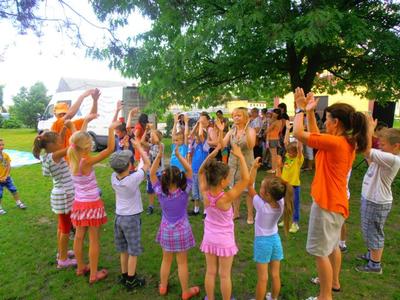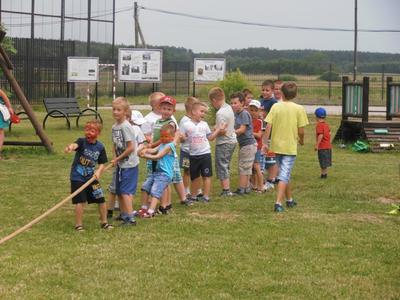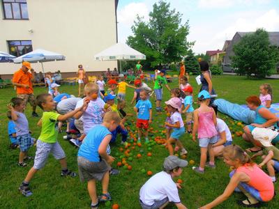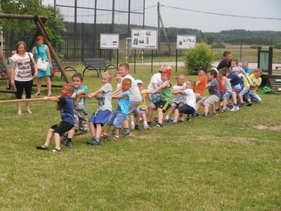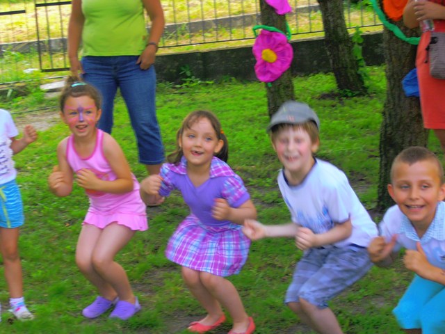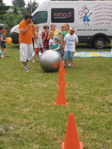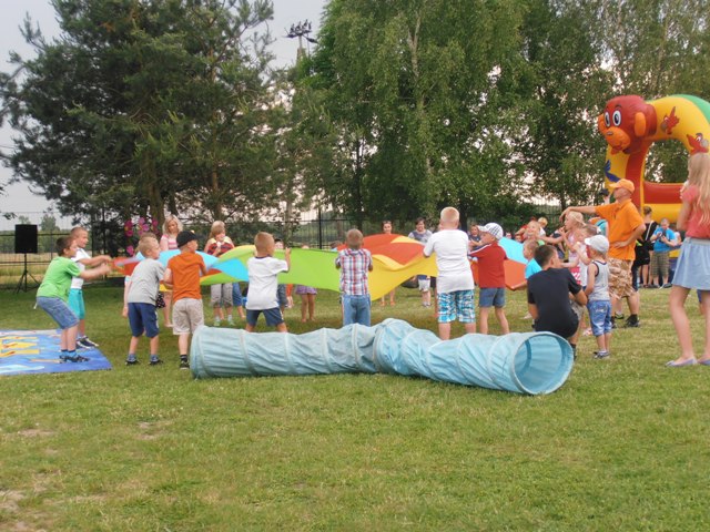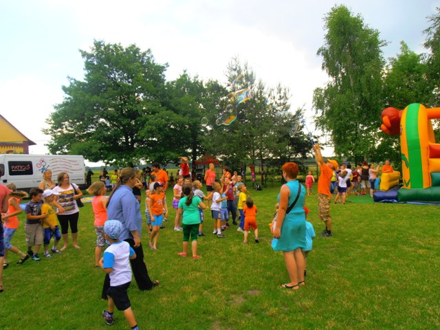 Wspólną zabawę poprowadzili animatorzy Agencji Artystycznej PATIGO. Było mnóstwo atrakcji m.in. malowanie twarzy, które zmieniało naszych przedszkolaków w bajkowych bohaterów oraz motylki, kotki, koty, tygryski… łowienie złotej rybki, pokonywanie tunelu czy szaleństwo na dmuchanym zamku. Świetnie bawiliśmy się podczas śpiewu i tańca, bitwy na piłeczki, przeciągania liny (wygrali chłopcy), którym z pomocą pośpieszyli tatusiowie, budowanie kolorowego muru z mega - klocków (wygrały dziewczyny), czy przewożenia dzieci w wagonikach, tutaj prym wiodły mamy. Zawody w chwytaniu ulotnych, kolorowych baniek mydlanych, czy też zabawy z chustą animacyjną. Na Festynie nie mogło zabraknąć ciasteczek, lodów oraz waty cukrowej.