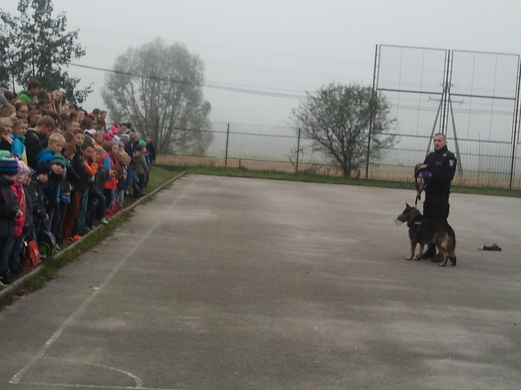 27 października br. (poniedziałek) przedszkolaków po raz drugi odwiedzili policjanci z Komendy Policji w Małogoszczu. Dzielnicowy Marek Żarski oraz sierżant sztabowy Łukasz Gierczak - przewodnik psa policyjnego o imieniu Bongo, który przeprowadził pokaz związany z posłuszeństwem i wykonywaniem komend przez czworonoga. Udzielił dzieciom wskazówek, jak zachować się, gdy zaatakuje groźny pies. Podczas wrześniowego spotkania dzielnicowy rozmawiał z dziećmi nt; prawidłowych, racjonalnych zachowań w różnych niebezpiecznych sytuacjach zagrażających ich życiu i zdrowiu. Mowa była o bezpiecznym miejscu do zabawy, zasadach bezpiecznego poruszania się po drodze, prawidłowego przechodzenia przez jezdnię, jak zachować się w sytuacji, gdy zaczepi nas ktoś obcy. Przypomniał o konieczności noszenia ubrań lub obuwia posiadającego elementy odblaskowe. Największym zainteresowaniem wśród maluchów cieszyły się opowieści o codziennej pracy Policji oraz demonstracja sprzętu policyjnego.