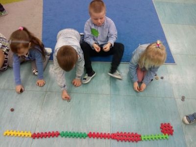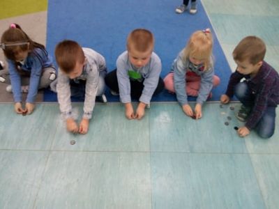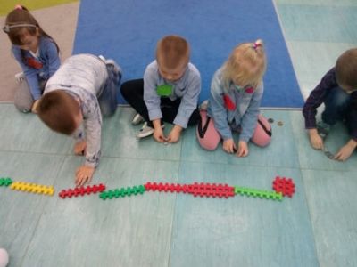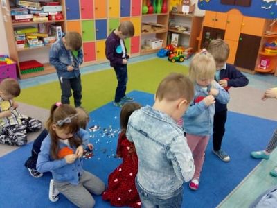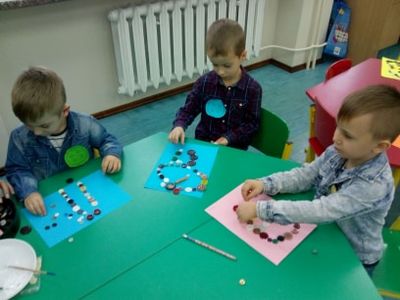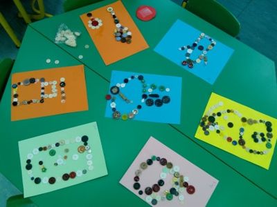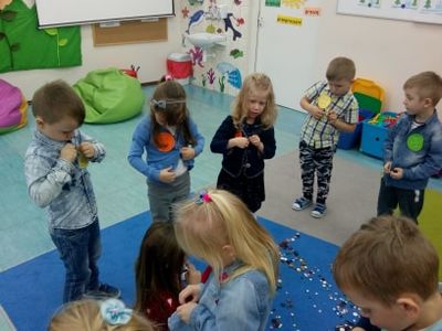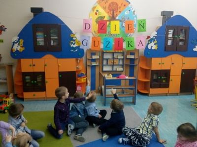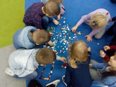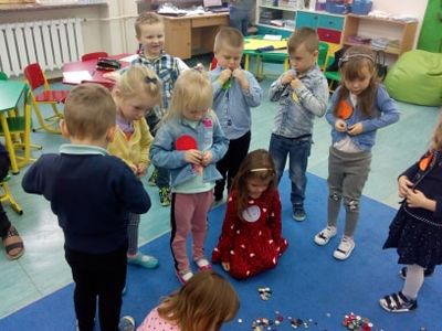 Dnia 14 grudnia 2020 r. grupa "Słoneczka"obchodziła kolejny nietypowy dzień, tym razem "Dzień Guzika". Tego dnia każdy przedszkolak posiadał na sobie jakiś element garderoby zapinany na guziki. Do zaczarowanej krainy guzików dzieci zostały wprowadzone zabawą - powitalną "Guzik tu ..." Następnie wysłuchały : "Bajkę o zaczarowanym guziku", tworzyły własą kompozycję plastyczną "Guzikowy obrazek", poznały również zabawy, które można organizować za pomocą guzików - guzikowe pchełki, rzuty do celu skoki guzików ... Najwięcej jednak czasu pochłonęła guzikowa matematyka: układanie, segregowanie, klasyfikowanie, przeliczanie i kodowanie. Wszystkie dzieci z wielkim zaangażowaniem uczestniczyły w proponowanych aktywnościach. Dowiedziały się, że guzikami można bawić się na wiele różnych sposobów. Na pamiątkę każde dziecko otrzymało guzikowy medal.