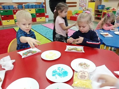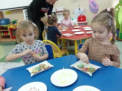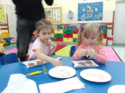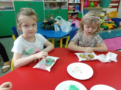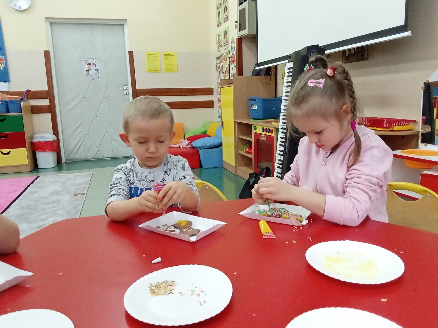 Pierniczki to nieodzowny symbol Świąt Bożego Narodzenia. W tym roku dzieci dekorowały już upieczone pierniki, a także zakupione przez rodziców. Miały różne kształty, były bałwanki, gwiazdki, serduszka, dzwoneczki, choinki. Ochoczo smarowały pierniki lukrem i posypywały kolorowymi dekorkami. Wszystkie ciasteczka były pięknie udekorowane, dzieci zabrały je do domów z myślą ,że znajdą się one na świątecznym stole lub na choince. Rodzicom dziękujemy za pisaki do dekoracji, posypkę w różnych kolorach oraz pierniczki. Zajęcia te były dla dzieci frajdą.