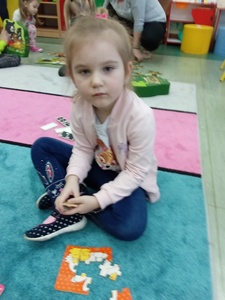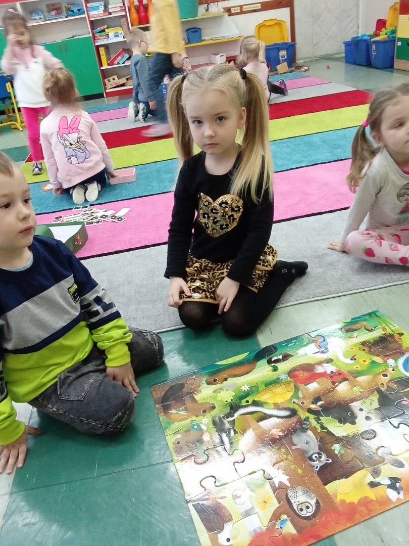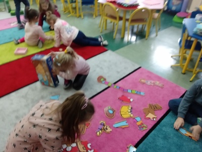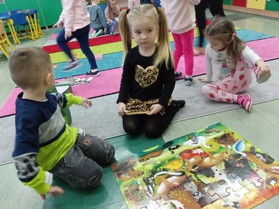 W kalendarzu uroczystości znajdujemy wiele nietypowych „świąt” do nich można zaliczyć Dzień Puzzli, który w grupie Misie obchodzony był 1 lutego. Zabawa puzzlami towarzyszy dzieciom każdego dnia. W tym dniu dzieci oprócz układania ich poznały z czego są one wykonane, porównywały ich wielkości, kształty. Układanie puzzli uczy dzieci spostrzegawczości, cierpliwości współdziałania, rozwija analizę i syntezę wzrokową. Nie zabrakło łamigłówek matematycznych, które były okazją do przypomnienia i utrwalania pojęcia para ,takie same, określeń wielkości przedmiotów a także przeliczania ich. Dużo radości dostarczyło dzieciom wykonywanie pieska metodą orgiami w czasie tej pracy dzieci ćwiczyły umiejętność wycinania, koncentrację uwagi. Dla tak wielu walorów edukacyjnych warto było zorganizować ten dzień.