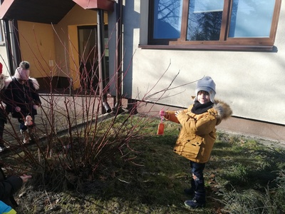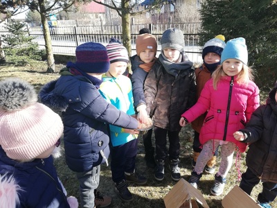 Dzieci z grupy Krasnale dbają o to, aby ich skrzydlaci przyjaciele podczas tegorocznej, mroźnej zimy nie były głodne. Z radością wyszły więc na zewnątrz aby zawiesić słoninkę, jabłka, powiesić karmniki wsypując do nich ziarna zbóż, słonecznika oraz okruszki chleba. Ptaki na pewno podziękują nam pięknym śpiewem, pomachają skrzydełkami, przycupną na parapecie. Miło jest patrzeć na ptasią stołówkę.