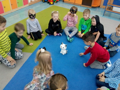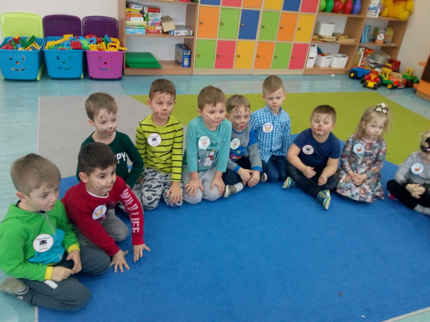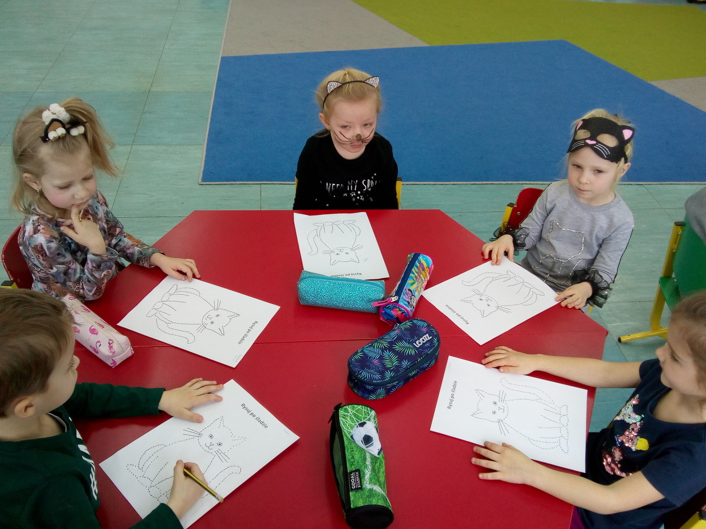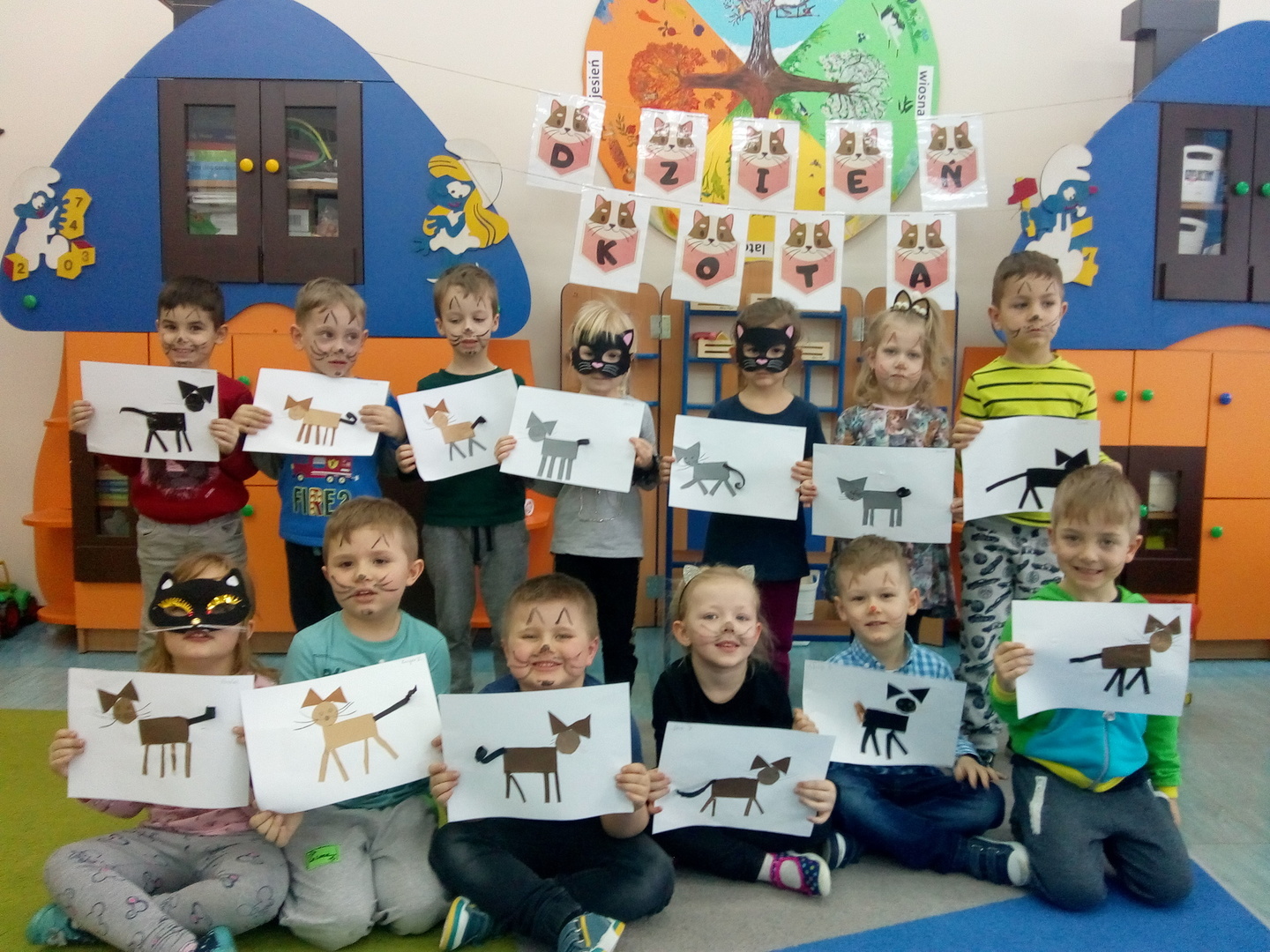 17 luty - czyli Światowy Dzień Kota, do którego obchodów aktywnie włączyła się grupa "Słoneczka". Zarówno nauczycielki, jak i dzieci miały na sobie "kocie akcenty" - kostiumy, maski, dorysowane wąsy oraz uszy. Głównym przesłaniem tego święta było podkreślenie znaczenia kotów w życiu człowieka, uwrażliwienie dzieci na los porzuconych i bezdomnych kotów. W oparciu o prezentację multimedialną poznawały rasy kotów i ich obyczaje. Były też wesołe "kocie" piosenki i zabawy połączone z ćwiczeniami artykulacyjnymi i zręcznościowymi, prace plastyczne, grafomotoryczne. Następnie udaliśmy się do biblioteki szkolnej, gdzie dzieci rozpoznawały sylwety bajkowych kotów, słuchały krótkich wierszyków z kotem w roli głównej zaprezentowanych przez uczniów klasy III, a także oglądały wystawkę książeczek i prac konkursowych. Na zakończenie otrzymały pamiątkowe odznaki i dyplomy "Przyjaciel kotów" oraz koci przysmak - mleko. Był to dzień pełen zabaw i pozytywnej energii.