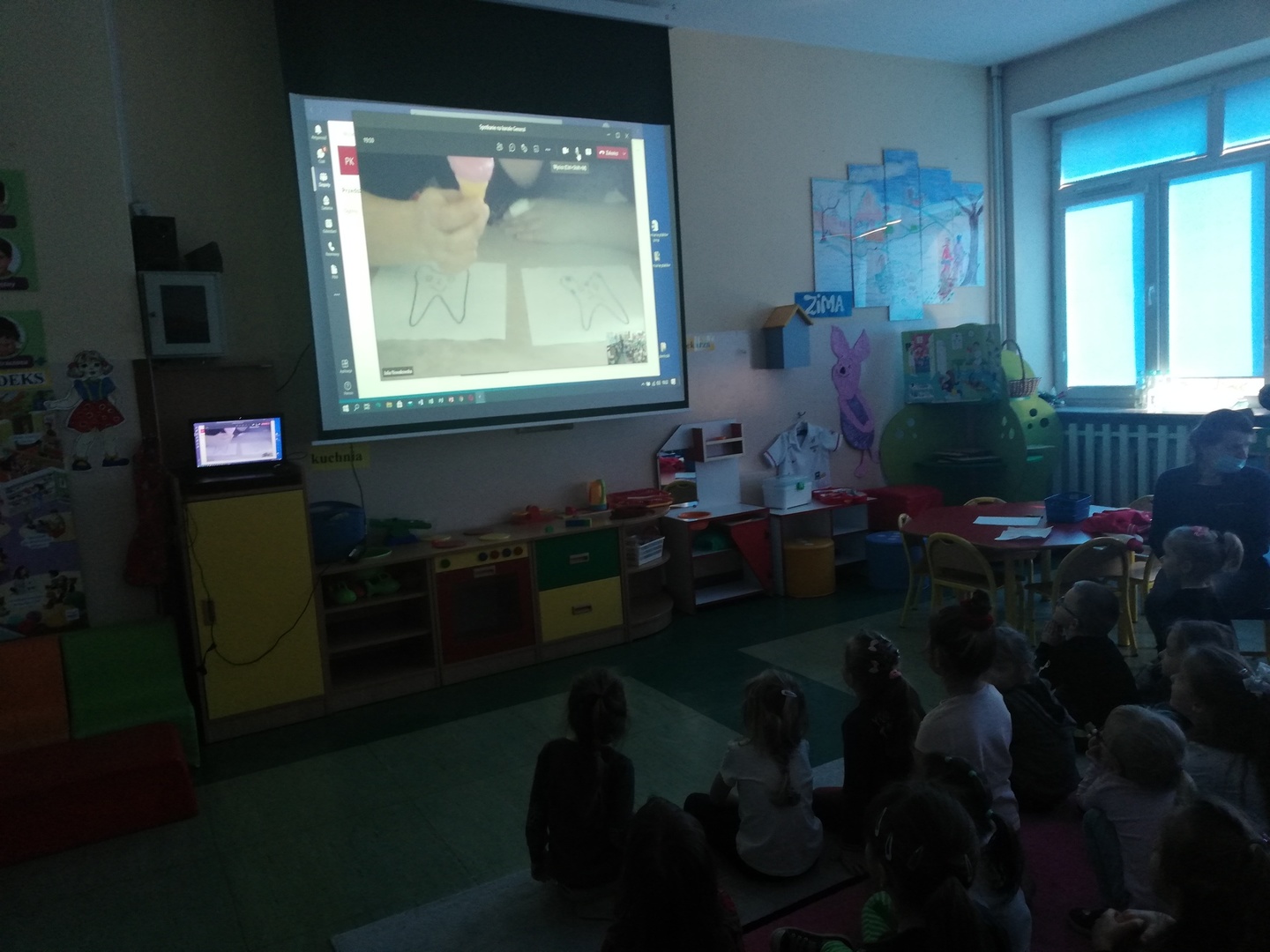 Wszystkie przedszkolaki wiedzą jak dbać o zęby, ale tej wiedzy nigdy za mało. W związku z tym zaprosiliśmy do naszego przedszkola przez platformę TEAMS panią Malwinę Nowakowską pomoc dentystyczną , a zarazem mamę córek uczęszczających do gr.I i III. Celem spotkania było przybliżenie sylwetki pomocy stomatologicznej, zapoznanie ze sposobami dbania o zęby, zmniejszenie obawy przed wizytą w gabinecie dentystycznym oraz zachęcania dzieci do kontroli zębów. Pani Malwina tłumaczyła dzieciom, jak należy dbać o higienę jamy ustnej, w jaki sposób i ile czasu należy czyścić zęby. Przedszkolaki dowiedziały się, że słodycze można jeść bez większej szkody dla zębów, ale…..raz w jednej porcji. Potem należy je oczywiście porządnie wyszorować. Wielkim zainteresowaniem dzieci cieszył się model pokazanej szczęki. Dzieci zapoznały się także z rodzajami szczoteczek do zębów. Mamy nadzieję, że od tej pory już nikt z przedszkolaków nie będzie bał się wizyty u stomatologa, a jak należy dbać o zęby zapamięta na zawsze. Na zakończenie dzieci otrzymały od pani Malwiny sporo gadżetów, dyplomy , a w zamian podziękowały pani machając jej do ekranu.