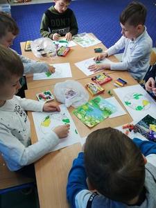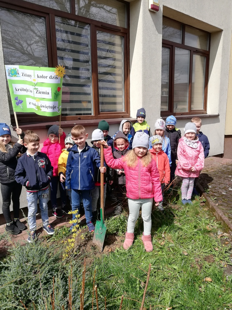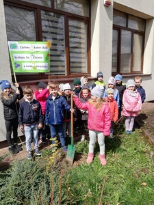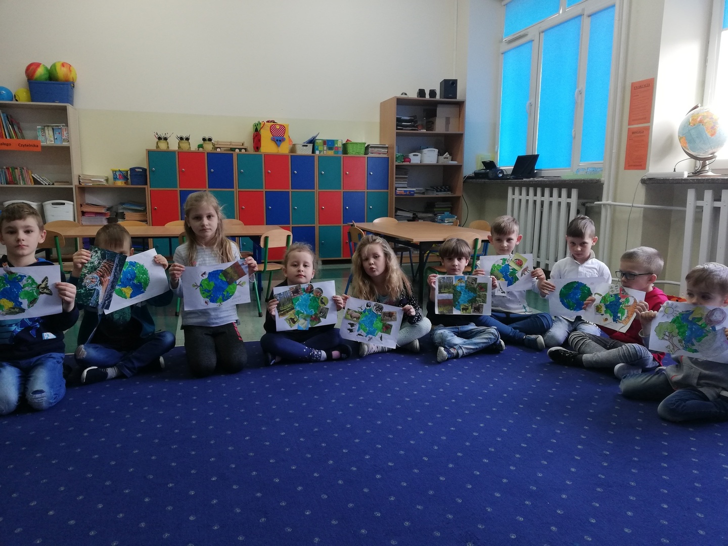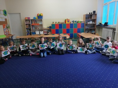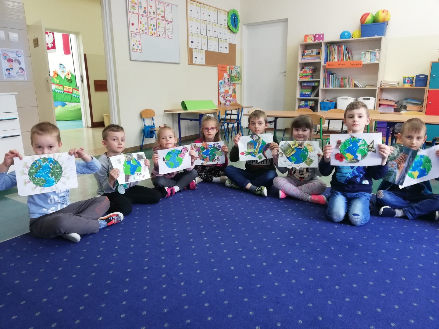 Z okazji Międzynarodowego Dnia Ziemi w grupie Krasnali odbyły się zajęcia, które miały na celu zrozumienie przez dzieci znaczenia ochrony przyrody. Przedszkolaki dowiedziały się o niebezpieczeństwach grożących środowisku przyrodniczemu ze strony człowiek. Poznali ekologiczny sposób wyrzucania śmieci czyli segregacji odpadów. Dzieci wysłuchały listu skierowanego do nich od naszej planety Ziemi. Układały również napis Dzień Ziemi z poznawanych liter. Następnie wykonały pracę plastyczną podsumowującą ten dzień. Zrobiły również pierwszy krok w kierunku dbania o planetę, a mianowicie na placu szkolnym posadziły drzewko.