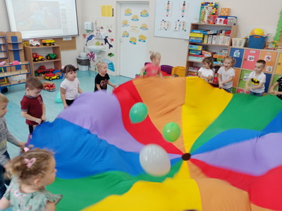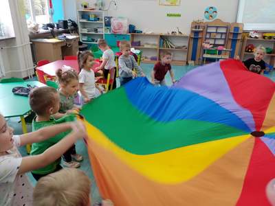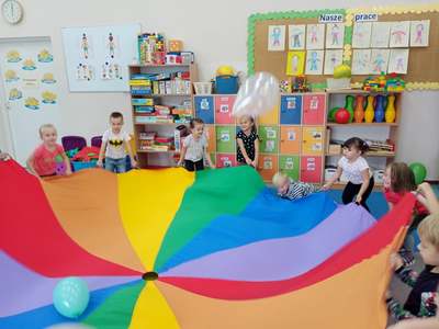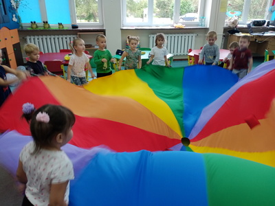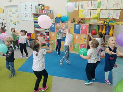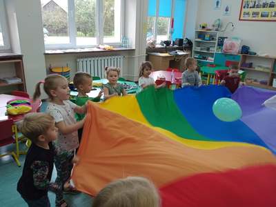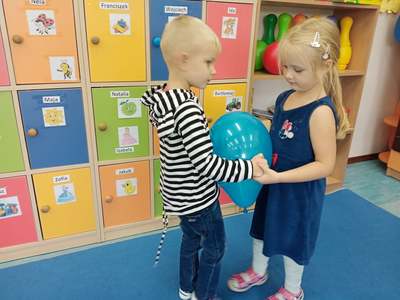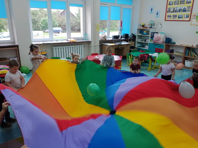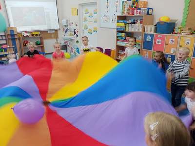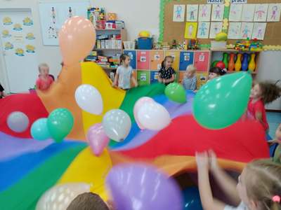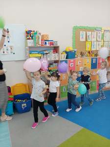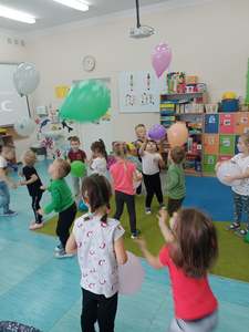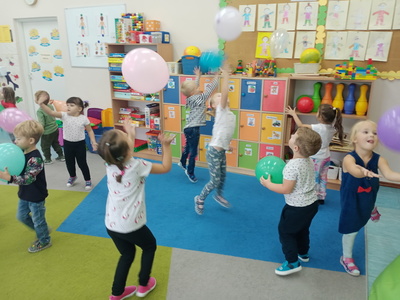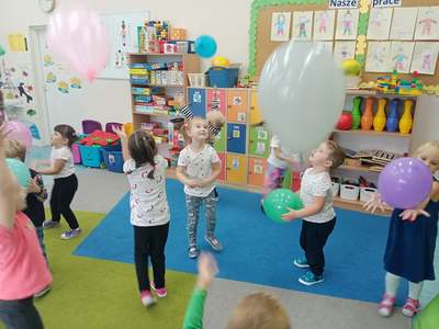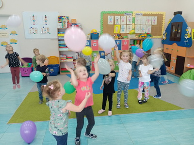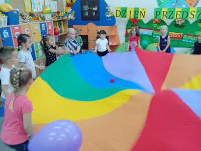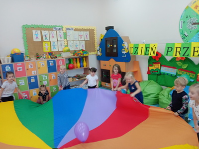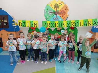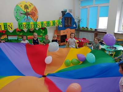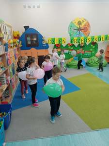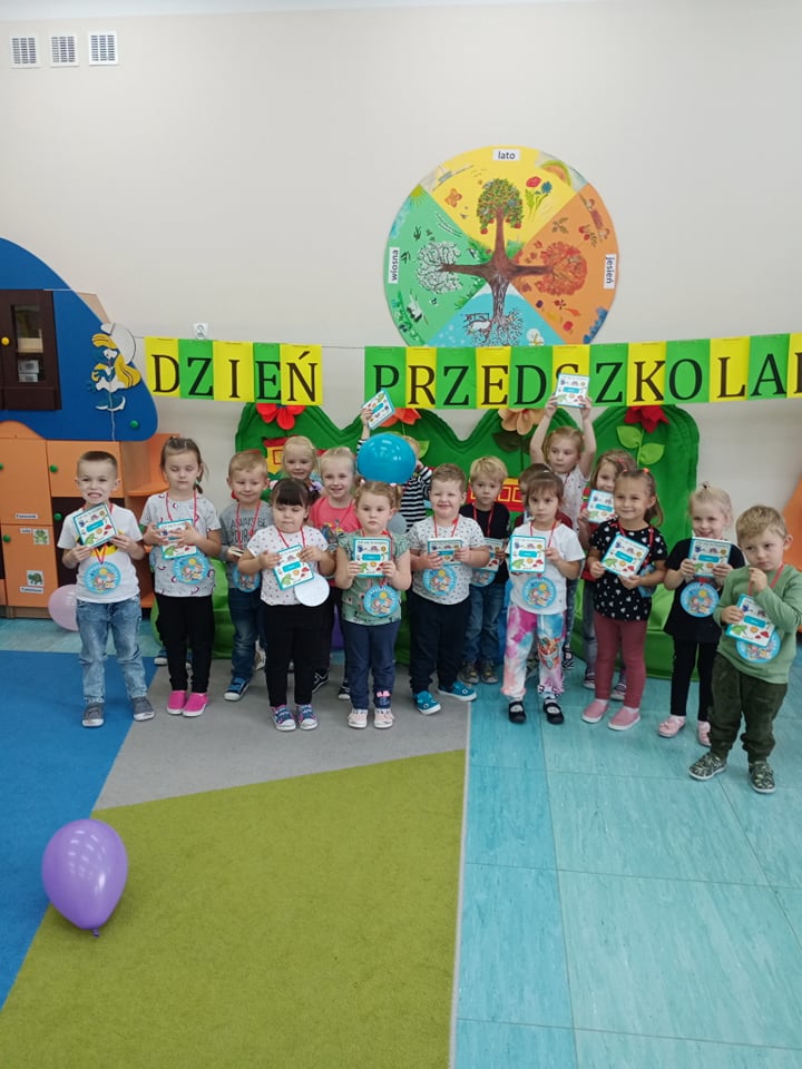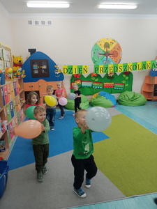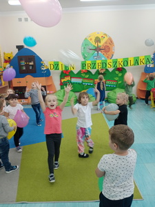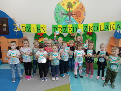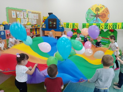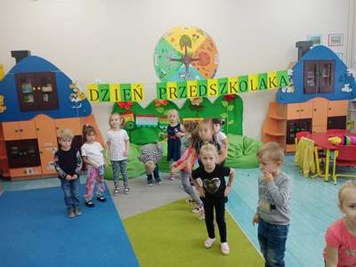 20 września grupa ,,Słoneczka" uroczyście obchodziła Ogólnopolski Dzień Przedszkolaka. Ten dzień przepełniony był atrakcjami i dobrą zabawą. W naszej sali rozbrzmiewała wesoła muzyka, dzieci tańczyły z balonami, bawiły się w balonową stonogę. Uroczystość obfitowała także w zabawy muzyczno-ruchowe z wykorzystaniem chusty animacyjnej. Po zakończonej zabawie każdy przedszkolak otrzymał order i niespodzianki zakupione przez rodziców- kolorowe książeczki.