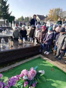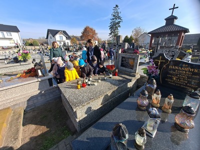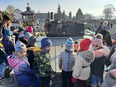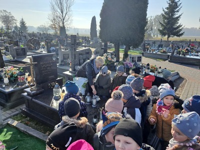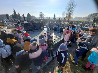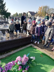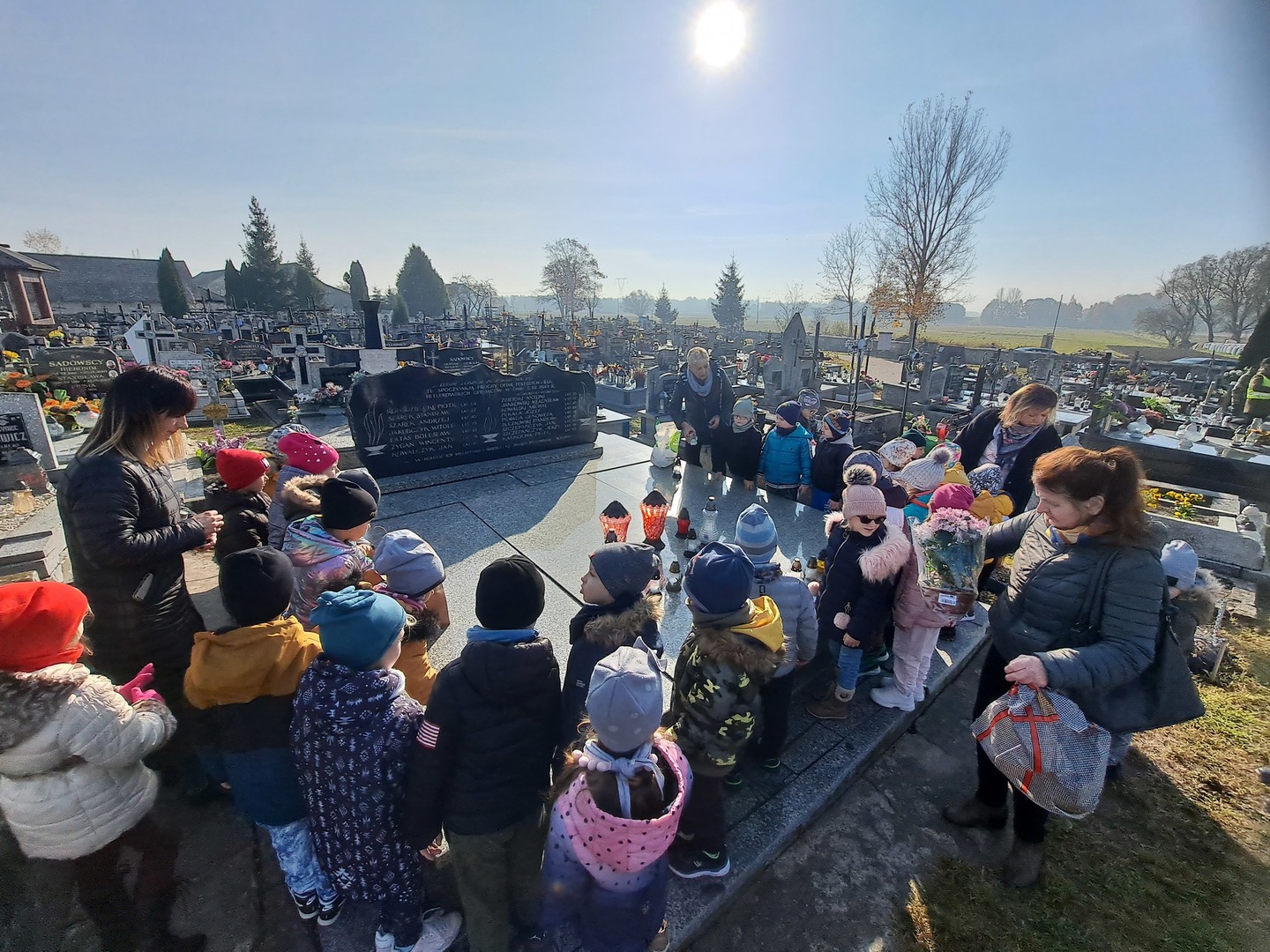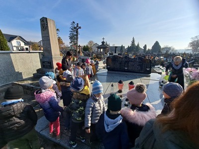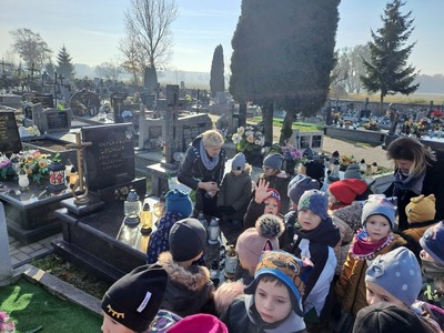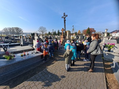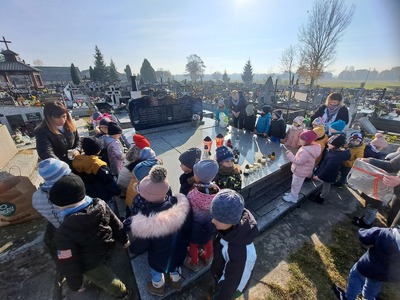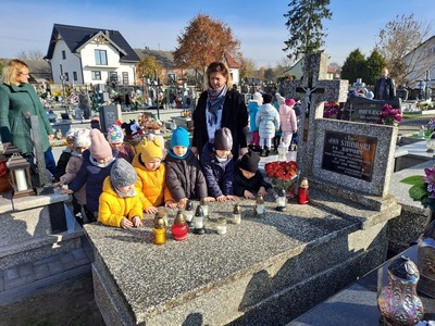 Z okazji zbliżającego się Dnia Wszystkich Świętych 28.10.2021 przedszkolaki wraz z wychowawczyniami wybrały się na cmentarz.