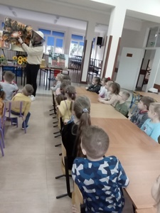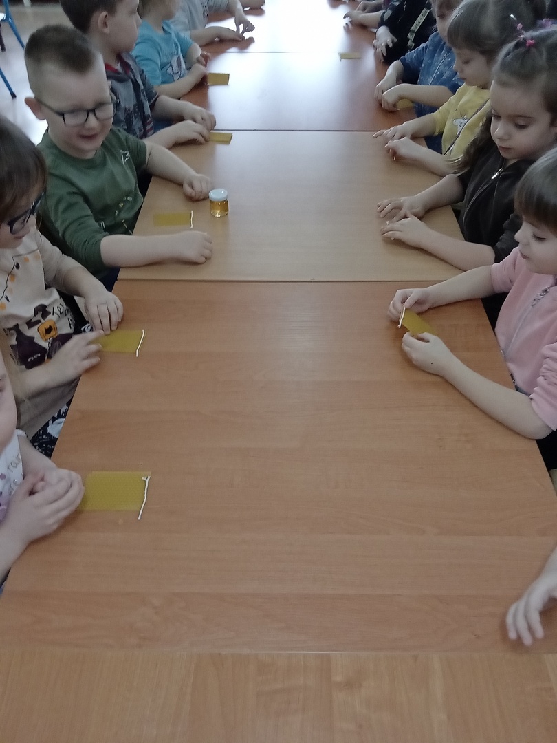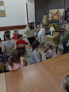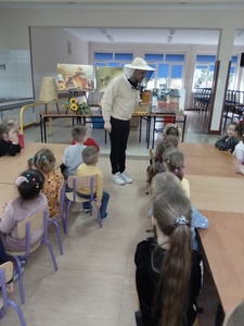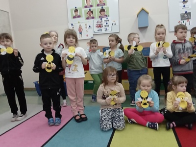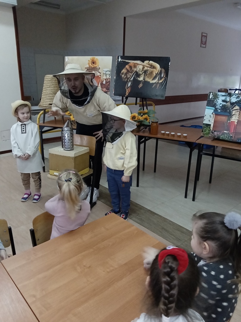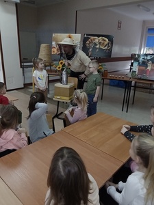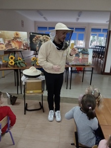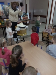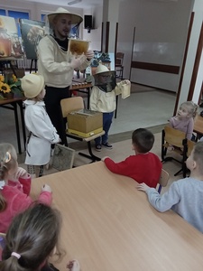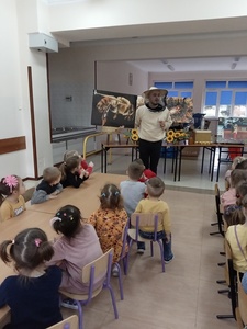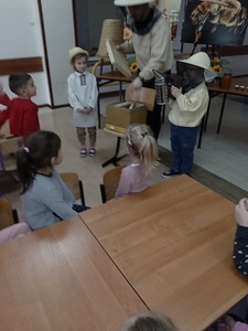 7 lutego br. dzieci z grupy Misie brały udział w warsztatach pszczelarskich pt.„Pszczoły – nasi mali przyjaciele”. Dzieci zdobyły wiadomości i ciekawostki o życiu, zwyczajach pszczół, czym się one żywią a co produkują oraz o pracy pszczelarza. Poznały skład rodziny pszczelej, różnicę między matką „królową” a robotnicą oraz kto to jest truteń Dowiedziały się, jak są to pracowite owady i jak ważne jest ich znaczenie w przyrodzie. Z zainteresowaniem oglądały dawny i obecny strój pszczelarza oraz narzędzia do pracy w ulu. Wyzwaniem dla wybranych dzieci przez pana pszczelarza było założenie takiego stroju. W skupieniu i ciszy oglądały żywy ulik wraz z rojem pszczelim. Na zakończenie każdy przedszkolak wykonał świecę z plastra miodu. Pełni wrażeń podziękowaliśmy panu za mile spędzony czas. Zwieńczeniem tego dnia było wykonanie pszczółki z kolorowego papieru.