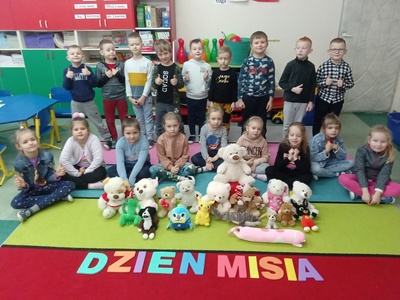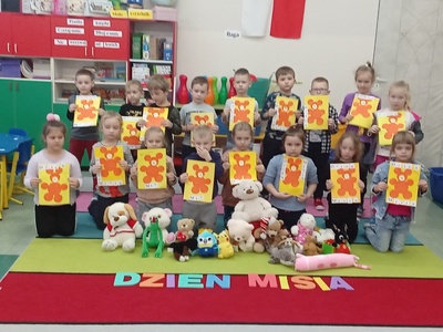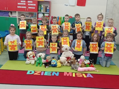 25 listopada br. przedszkolaki z grupy Misiów uczestniczyły w obchodach Światowego Dnia Pluszowego Misia. Każde dziecko przyszło do przedszkola ze swoim małym lub dużym przyjacielem - misiem. A każdy był piękny i wyjątkowy. Uroczysty dzień rozpoczął się od przedstawienia przyniesionych pluszaków. Przedszkolaki zostały zaproszone do wspólnej zabawy w misiowej krainie. Poznały historię święta, wspólnie, bawiły się przy piosenkach: "Mały miś", 'Jadą, jadą misie". Dzieci wykonywały prace plastyczne - misia, oraz dorysowywały brakujące elementy. Ten dzień w przedszkolu był pełen uśmiechu i radości. Mamy nadzieję, że to święto zostanie na długo w pamięci dzieci.