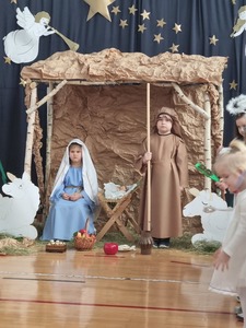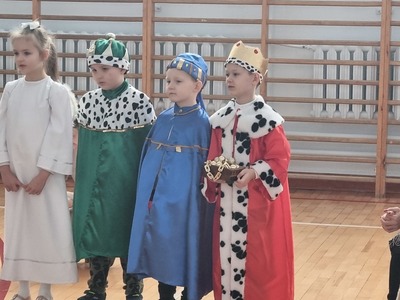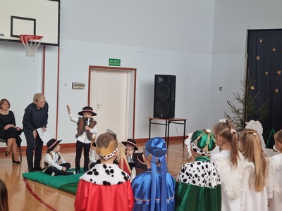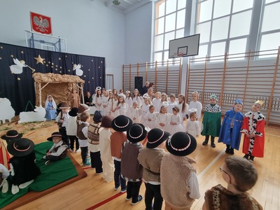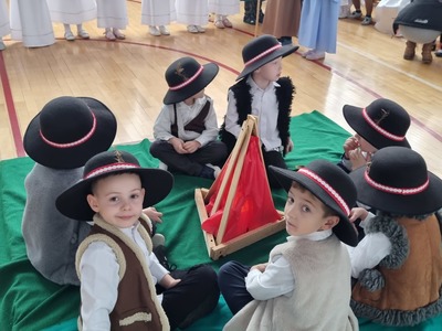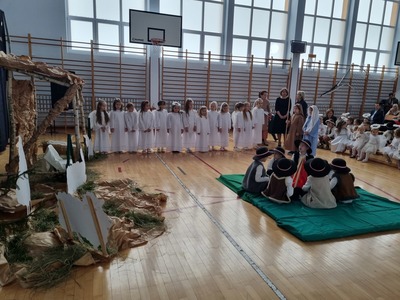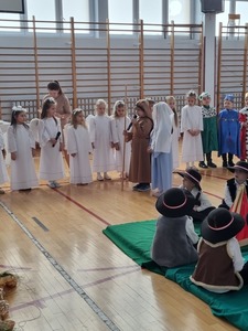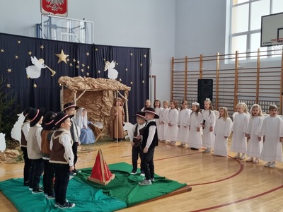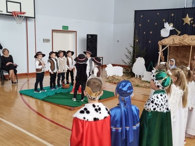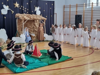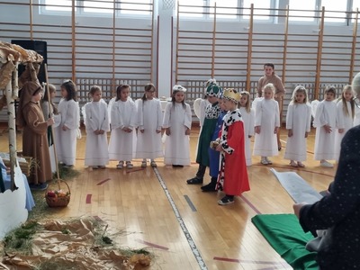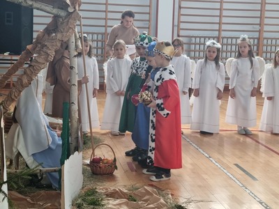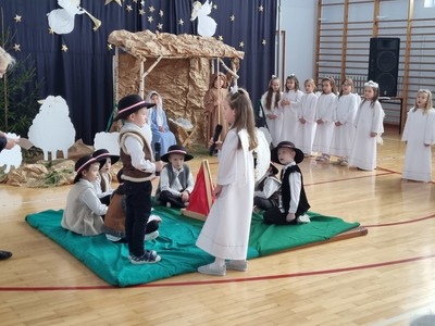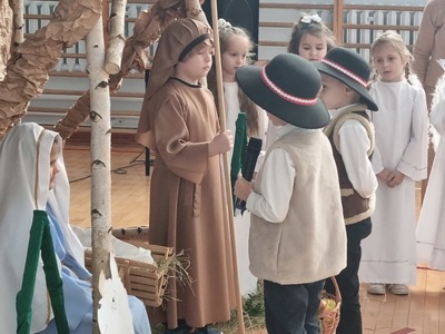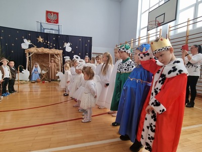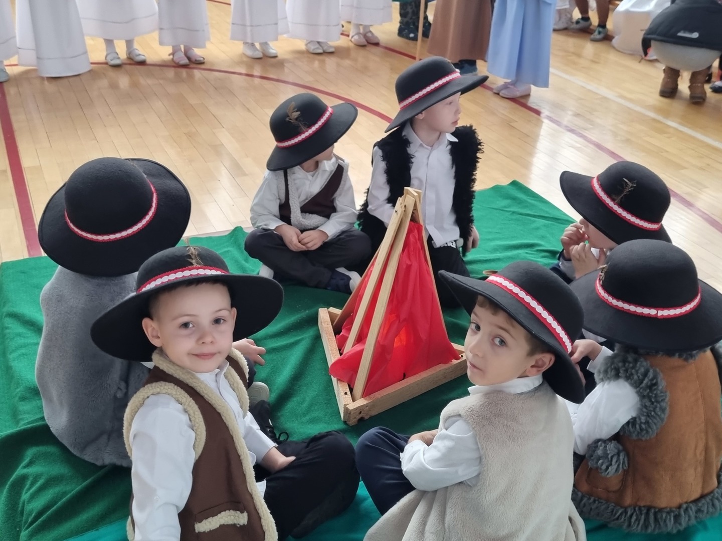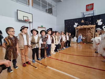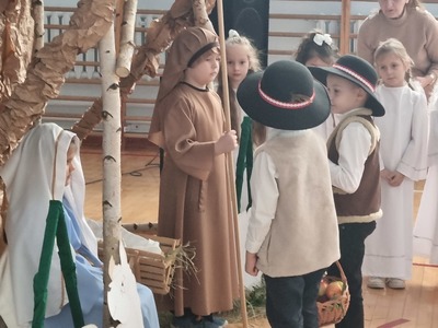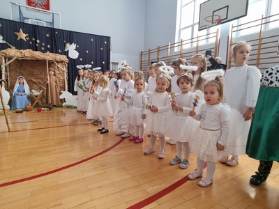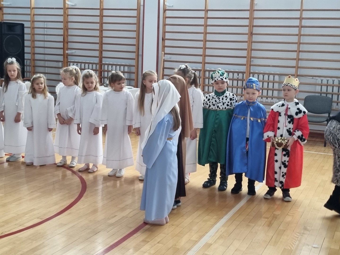 Okres Świąt Bożego Narodzenia to czas pełen radości, piękna. Aby podkreślić wyjątkowy charakter tych świąt, tradycyjnie jak co roku w naszym przedszkolu odbyły się jasełka. Dnia  16 grudnia 2022r. dzieci 6 –letnie  w specjalnie przygotowanych strojach oraz w scenografii nawiązującej do Betlejem przedstawiły scenę narodzin Jezusa Chrystusa. Role Maryi, Józefa, grały dzieci. Wśród śpiewu aniołów do żłóbka  przybyli pastuszkowie. Nowo narodzonemu  Dzieciątku pokłony złożyli także Królowie. Inscenizacja przeplatana była pięknymi kolędami i pastorałkami. Przedszkolaki świetnie wcieliły się w swoje role. Na zakończenie mali aktorzy złożyli życzenia Bożonarodzeniowe. Śpiewom towarzyszyły dźwięki gry na dzwoneczkach, które sprawiały, że atmosfera zrobiła się bardzo świąteczna. Młodsze grupy miały swój mały występ odśpiewując i grając pastorałki „Był pastuszek bosy” oraz „Grajmy Panu”. Następnie głos zabrała pani Dyrektor Krystyna Świerczyńska , podziękowała małym wykonawcom i przy okazji złożyła wszystkim obecnym życzenia świąteczne. Zwieńczeniem uroczystości  było dzielenie się opłatkiem i śpiewanie kolędy przez zaproszonych rodziców , dziadków.  Kolejny raz okazało się, że takie wspólne spotkania, emocje i przeżycia zbliżają ludzi, a dzieciom pokazują, jak ważna jest tradycja świąt Bożego Narodzenia i jak bardzo rodzinne jest to święto. Dzieci z poszczególnych grup otrzymały stroiki bożonarodzeniowe.