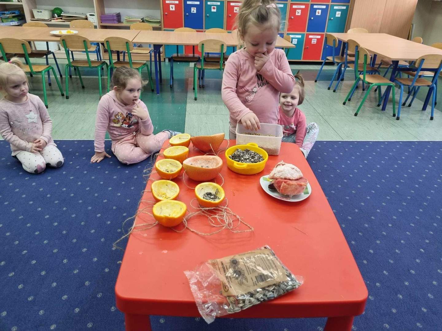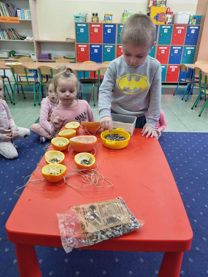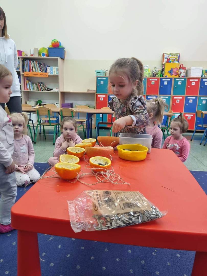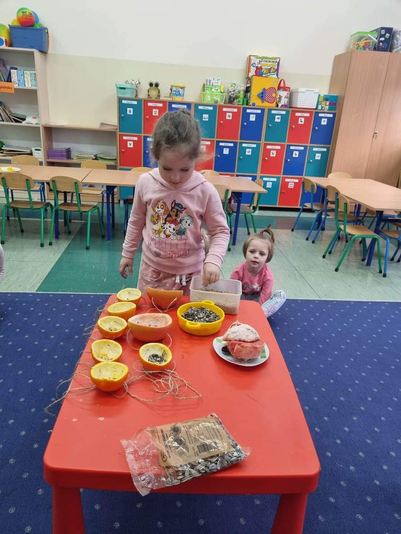 Przedszkolaki wiedzą, że zima to trudny czas dla ptaków, ze względu na niską temperaturę i trudne warunki pogodowe. W związku z tym ptaki mogą mieć problemy ze znalezieniem odpowiedniej ilości pokarmu. Dlatego też dzieci z grupy Krasnale przygotowały z pomocą pań karmniki ekologiczne wykonane z pomarańczy oraz grejpfruta. Ogromną radość dzieciom sprawiło, kiedy mogły  wrzucać do wykonanych  karmników różne ziarenka słonecznika, zboża. Następnie wspólnie wybraliśmy się na spacer, aby zawiesić karmniki oraz słoninkę dla sikorek. Nasi skrzydlaci przyjaciele na pewno są wdzięczni za taką pomoc.
