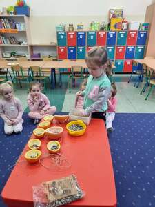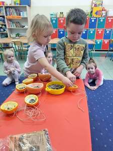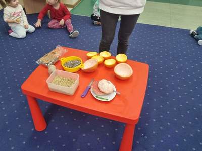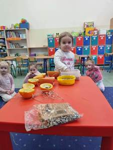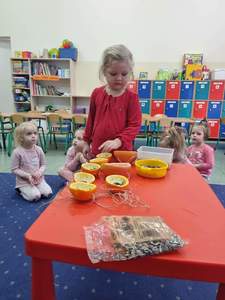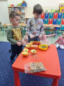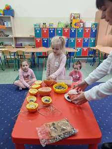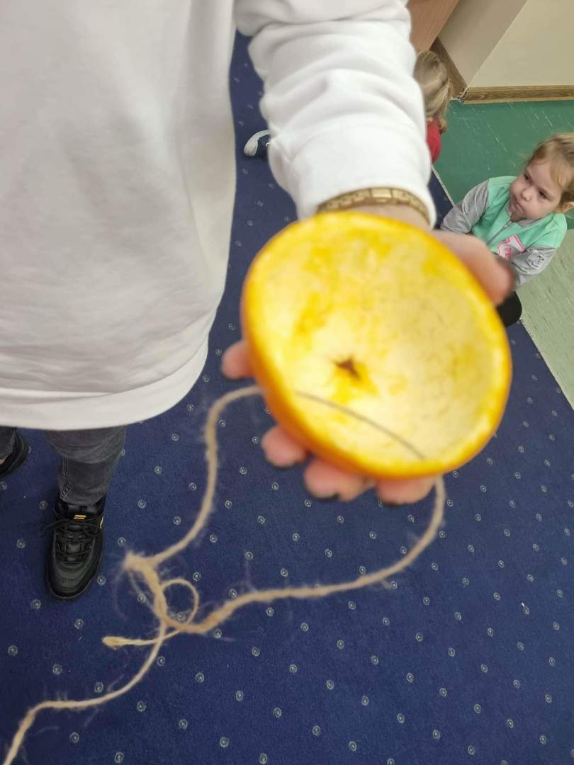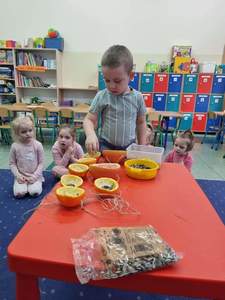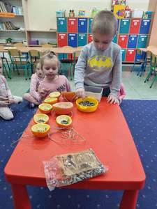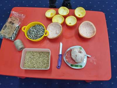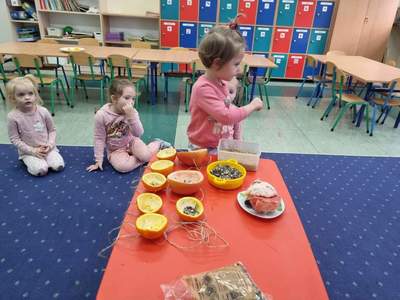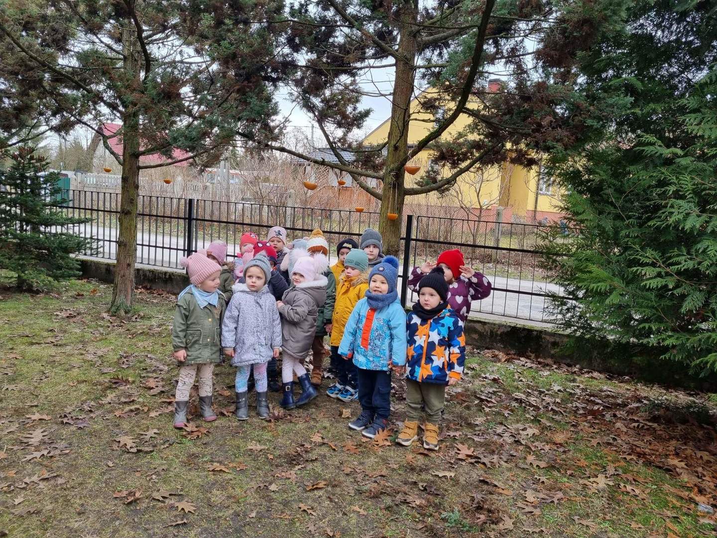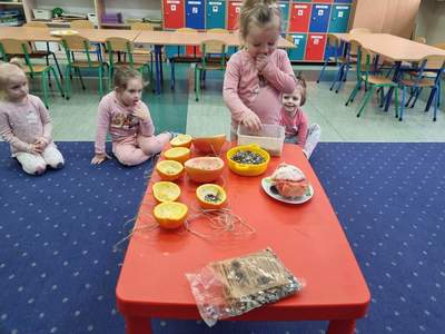 Przedszkolaki wiedzą, że zima to trudny czas dla ptaków, ze względu na niską temperaturę i trudne warunki pogodowe. W związku z tym ptaki mogą mieć problemy ze znalezieniem odpowiedniej ilości pokarmu. Dlatego też dzieci z grupy Krasnale przygotowały z pomocą pań karmniki ekologiczne wykonane z pomarańczy oraz grejpfruta. Ogromną radość dzieciom sprawiło, kiedy mogły  wrzucać do wykonanych  karmników różne ziarenka słonecznika, zboża. Następnie wspólnie wybraliśmy się na spacer, aby zawiesić karmniki oraz słoninkę dla sikorek. Nasi skrzydlaci przyjaciele na pewno są wdzięczni za taką pomoc.