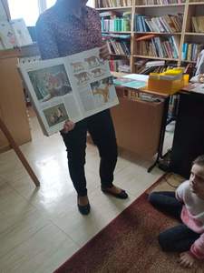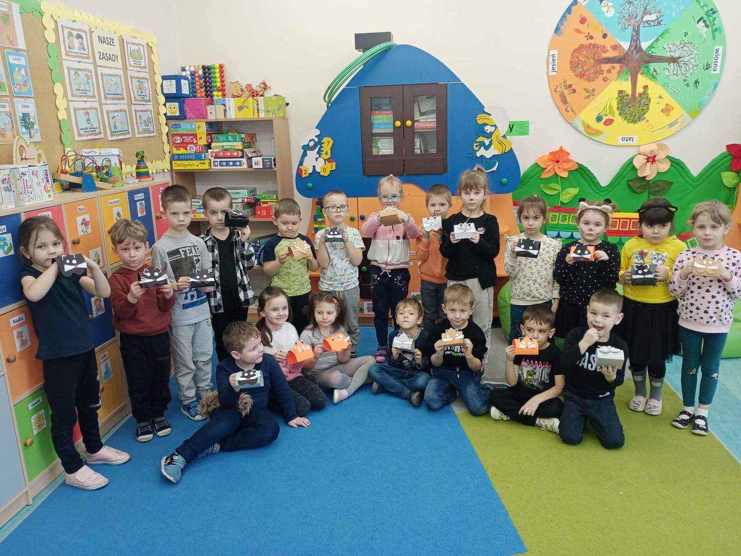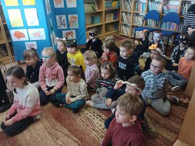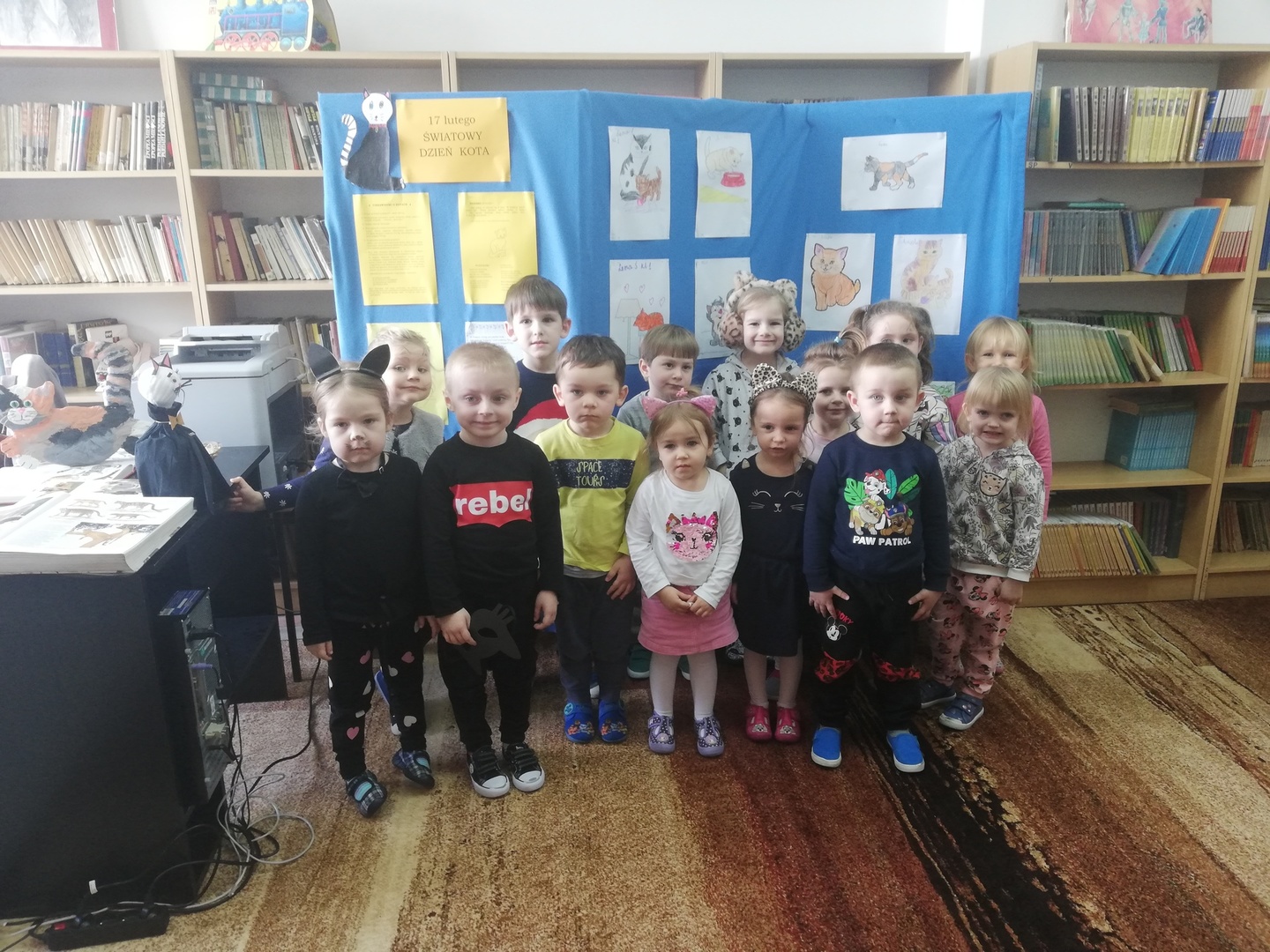 Wszystkie dzieci upodobniły się do czworonożnych przyjaciół, poprzez wymalowane na swoich twarzach piękne noski, wąsy i typowe dla kotków uszka, niektóre z nich nawet miały kocie ogonki. Dzieci oglądały książki o tych tajemniczych zwierzętach, zapoznały się z kocimi obyczajami oraz sposobem pielęgnacji i opieki jakiej wymagają. Były też wesołe „kocie zabawy” przy znanych piosenkach :"Uciekaj myszko ",„My jesteśmy kotki dwa”, „Wlazł kotek na płotek”. Na zaproszenie pań udaliśmy się do biblioteki, gdzie też było obchodzone to święto. Pani bibliotekarka odczytała dzieciom książeczkę pt.” Kicia kocia w bibliotece”. Pokazała dzieciom również wystawę prac plastycznych wykonanych przez uczniów klas starszych. Dzieci miały również okazję obejrzeć encyklopedię zwierząt w której były różne gatunki dzikich kotów. Na koniec tego niesamowitego dnia dzieci wykonały pracę plastyczną.