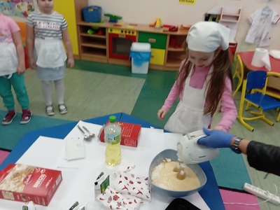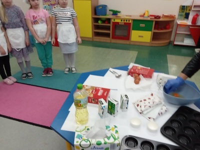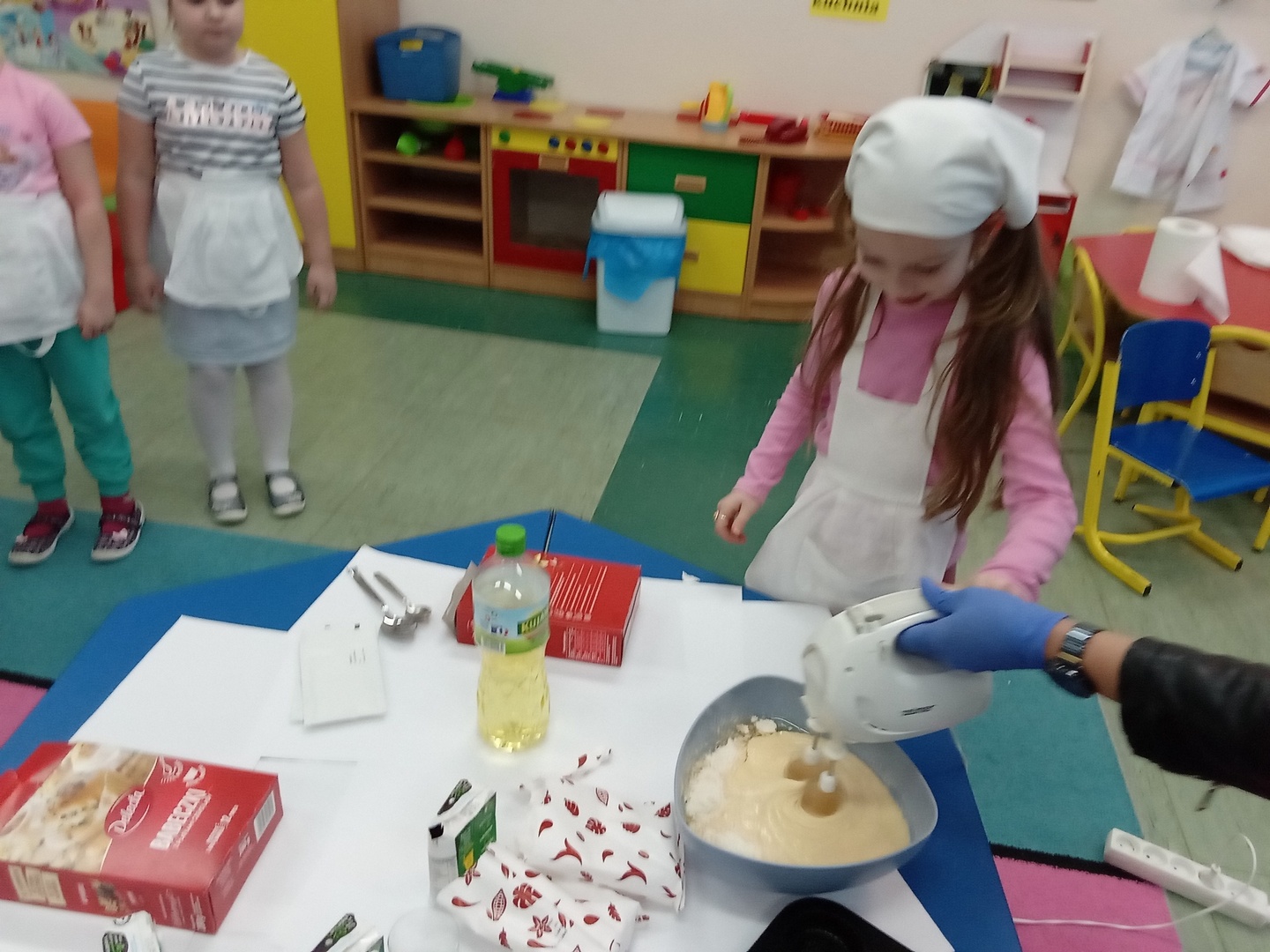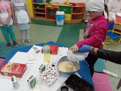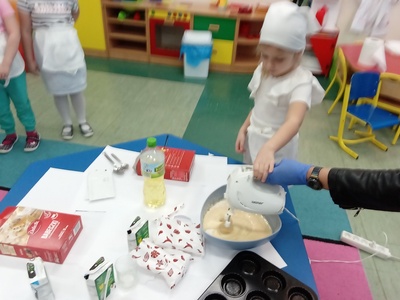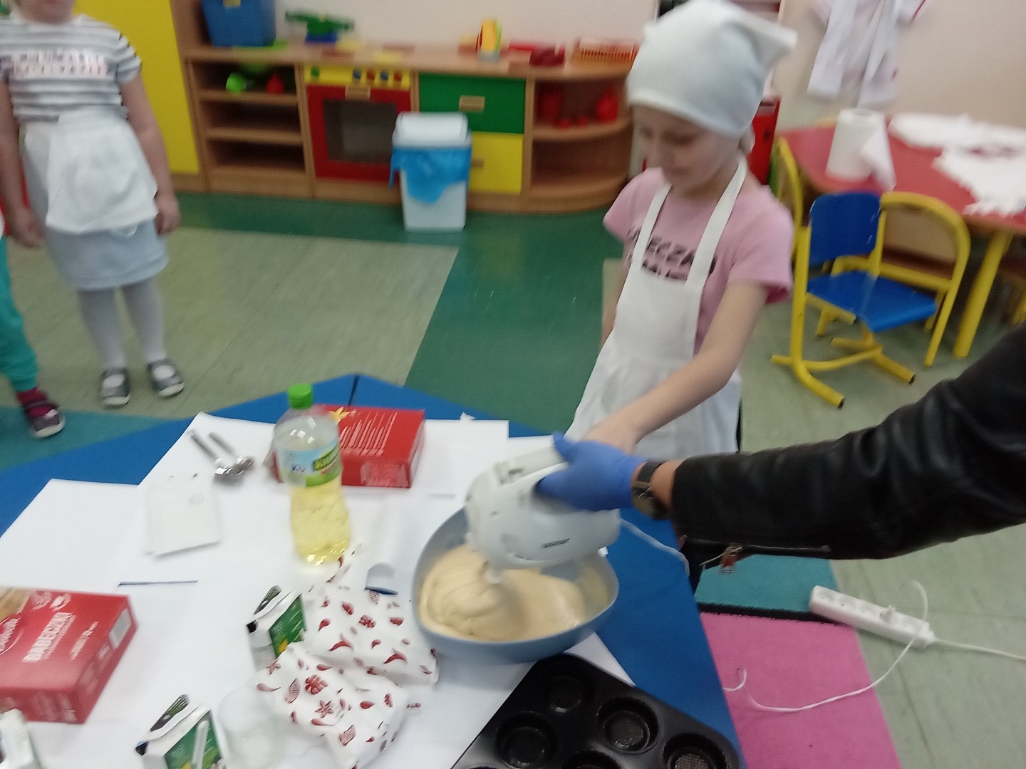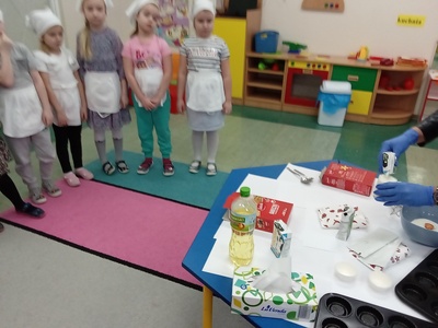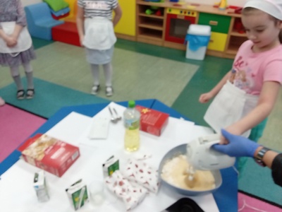 Dzień rozpoczął się od przygotowania dzieci tj. wykonania czynności higienicznych i założenia fartuszków. Dalsza część dotyczyła poznania składników potrzebnych do zrobienia ciasta. Następnie odbyło się mieszanie kolejnych składników zgodnie z przepisem. W tym czasie każde dziecko spróbowało swoich umiejętności kulinarnych. Napełnione ciastem foremki zostały zaniesione do pieczenia. Gdy babeczki były gotowe, odbyła się ich degustacja.