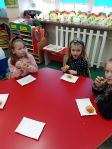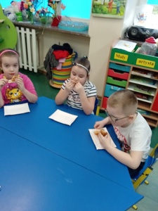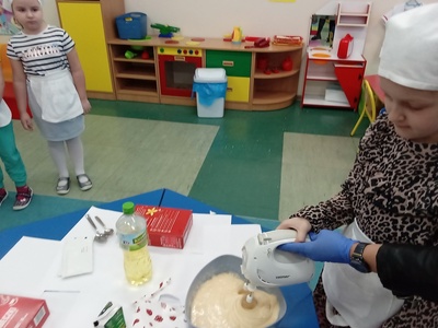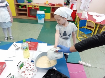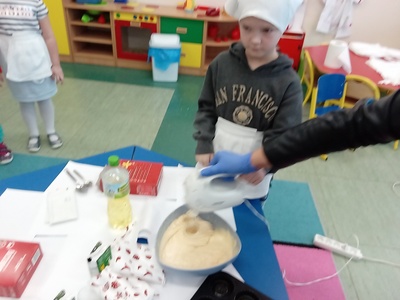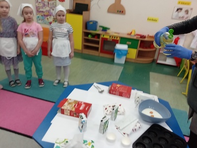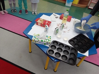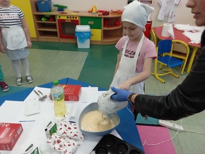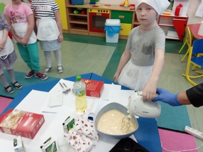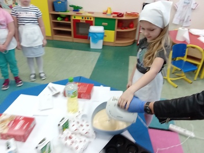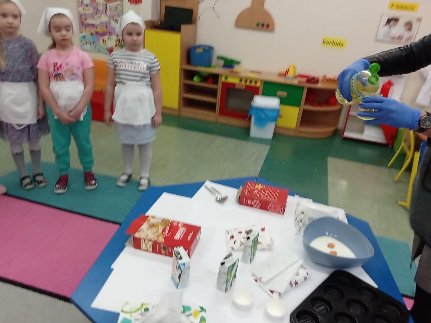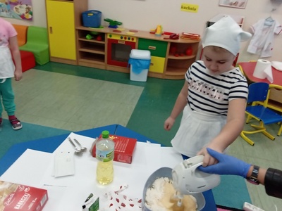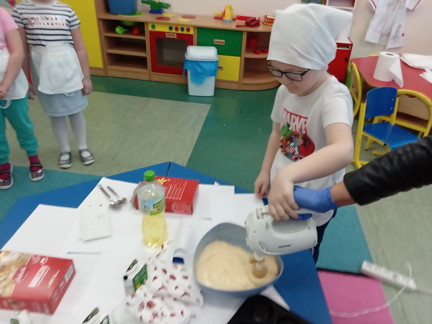 Dzień rozpoczął się od przygotowania dzieci tj. wykonania czynności higienicznych i założenia fartuszków. Dalsza część dotyczyła poznania składników potrzebnych do zrobienia ciasta. Następnie odbyło się mieszanie kolejnych składników zgodnie z przepisem. W tym czasie każde dziecko spróbowało swoich umiejętności kulinarnych. Napełnione ciastem foremki zostały zaniesione do pieczenia. Gdy babeczki były gotowe, odbyła się ich degustacja.