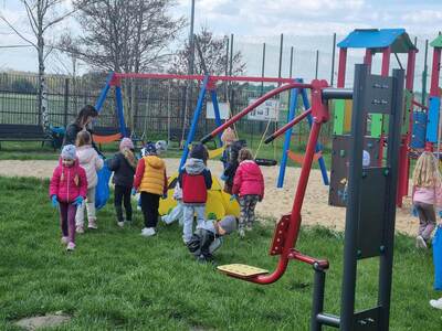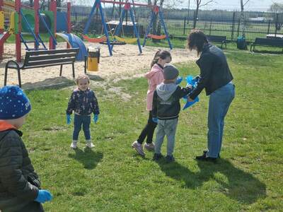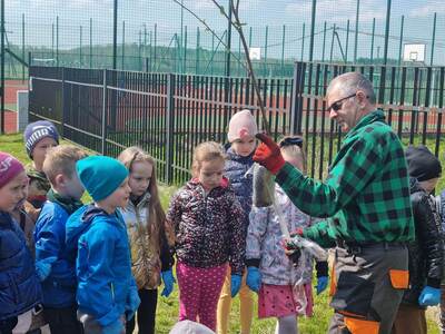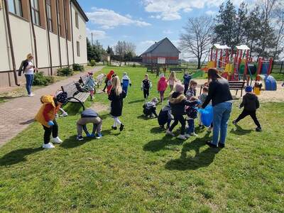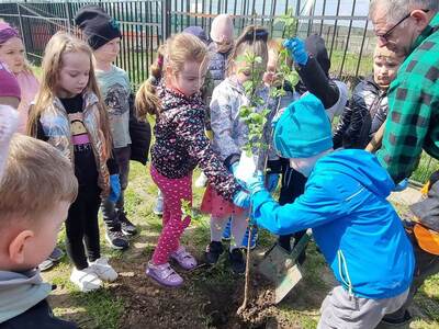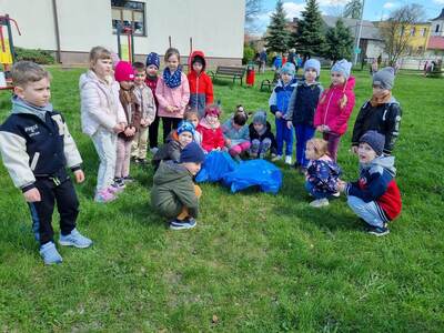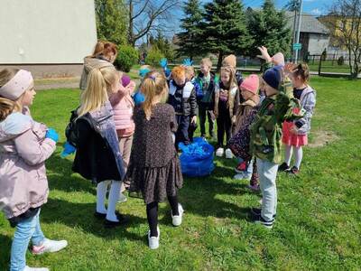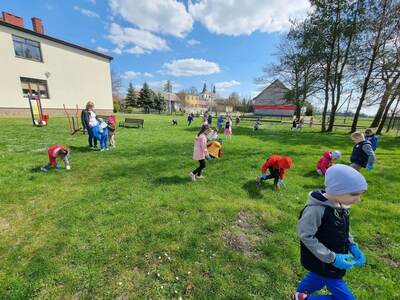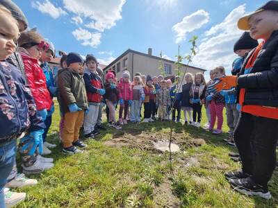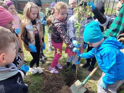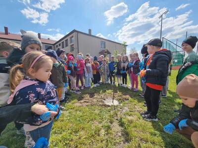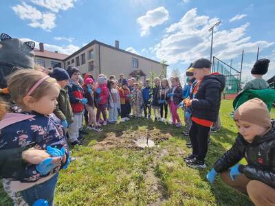 21.04.2023r. dzieci ze wszystkich grup świętowały Dzień Ziemi. Rozpoczęły ten dzień od multimedialnej podróży, gdzie przewodnikiem była planeta Ziemia. Dzieci dowiedziały się wielu ciekawostek na temat Ziemi. Przeprowadzono szereg działań wpisujących się w konwencję święta. Przedszkolaki również w sposób praktyczny pokazały, że dbają o środowisko i pozbierały śmieci w okolicy budynku szkoły, segregując śmieci do odpowiednich pojemników. Prowadzone działania pokazały przedszkolakom różne sposoby ochrony najbliższego środowiska oraz zachęcały do troski o Ziemię. Dzieci już wiedzą, że dla dobra naszej planety należy: sadzić drzewa i pielęgnować rośliny; dbać o przyrodę; oszczędzać wodę i prąd; segregować śmieci i ograniczać zużycie plastiku. Na koniec „dnia ekologicznego” dzieci zasadziły drzewko owocowe na placu szkolnym.