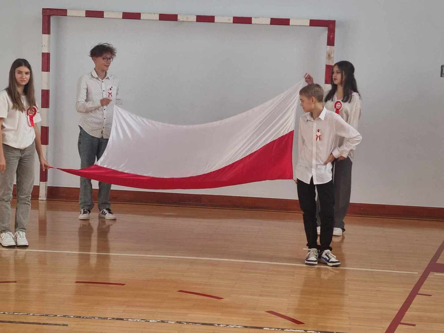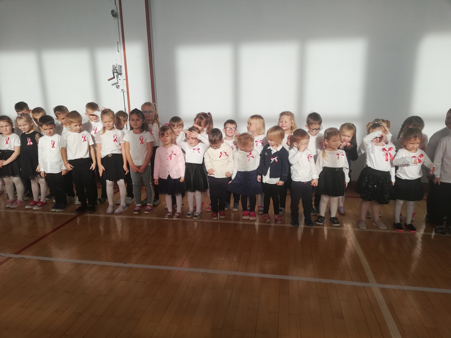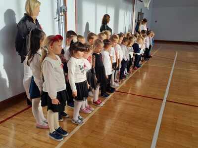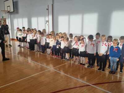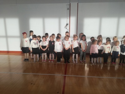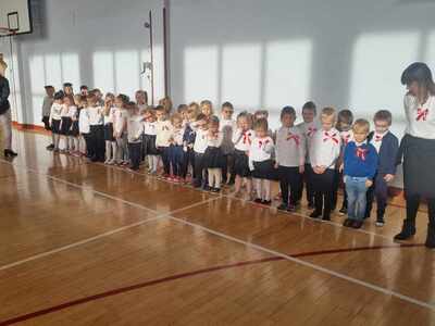 Dnia 10 listopada 2023 roku Przedszkolaki wraz z całą społecznością szkolną  wzięły udział w Ogólnopolskiej Akcji „Szkoła do Hymnu”. Jest to akcja ogłoszona przez Ministerstwo Edukacji i Nauki, polegająca na odśpiewaniu hymnu państwowego w dzień poprzedzający Narodowe Święto Niepodległości. Dokładnie o symbolicznej godzinie 11:11 wszystkie przedszkolaki oraz uczniowie z całej szkoły wraz z wychowawcami uroczyście odśpiewali  hymn narodowy „Mazurka Dąbrowskiego”. Dzieci pamiętały tego dnia o uroczystym ubiorze i prawidłowej postawie podczas śpiewu. Udział w akcji jest jednym z wielu działań podejmowanym w naszym przedszkolu, mającym na celu kształtowanie wśród wychowanków postawy patriotycznej oraz poczucia świadomości narodowej.