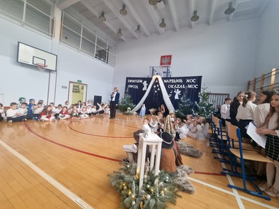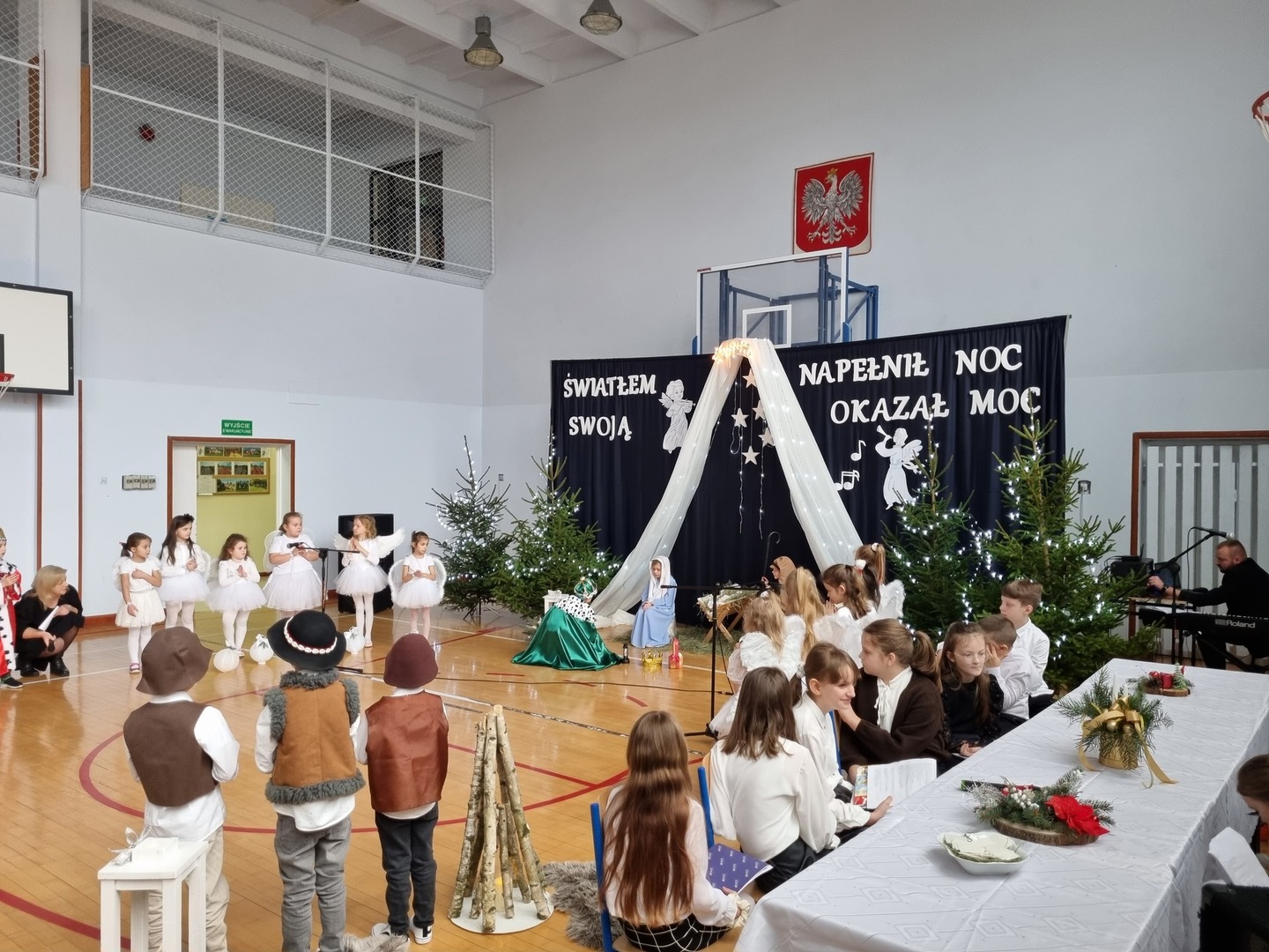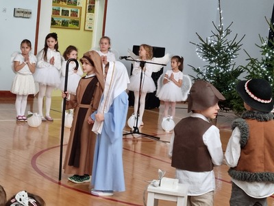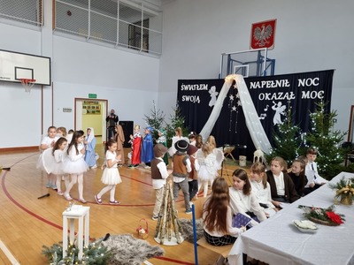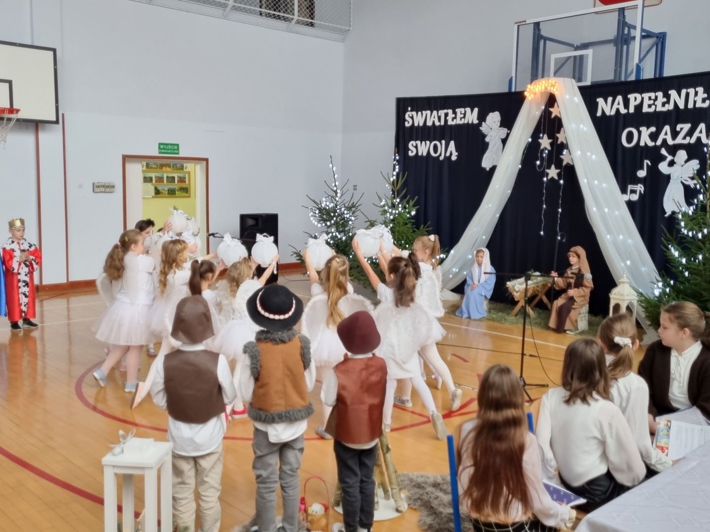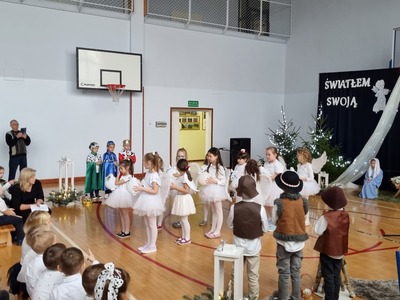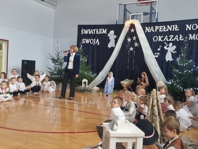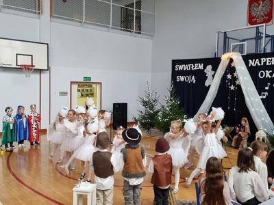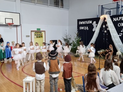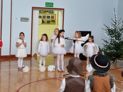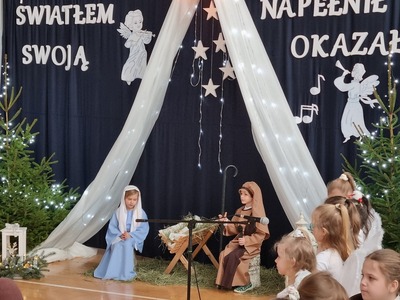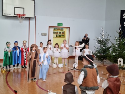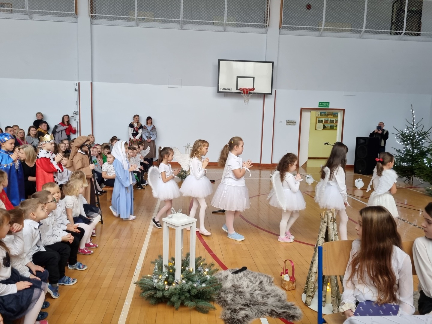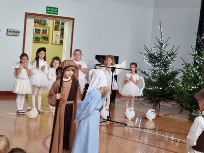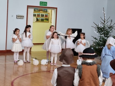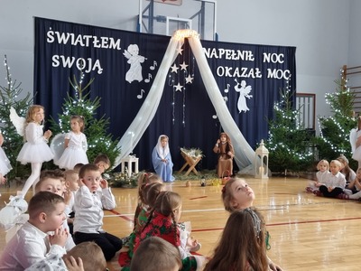 21 grudnia 2023 roku w naszym przedszkolu odbyły się Jasełka Bożonarodzeniowe w wykonaniu przedszkolaków oraz uczniów klas starszych. Dzieci w strojach Maryi, Świętego Józefa, pastuszków, królów i aniołów w przejmujący sposób opowiedziały historię Bożego Narodzenia. Celem wystąpienia było wprowadzenie wszystkich w świąteczną atmosferę, pełną radości z Narodzenia Pana. Podczas występu przedszkolaki zaprezentowały cały wachlarz swoich umiejętności: wokalnych, recytatorskich i tanecznych. Swoje role mówiły z wielkim przejęciem. Nie zabrakło również pięknych polskich kolęd, pastorałek i tańca aniołów z lampionami. Przepiękna scenografia, stroje aktorów i dekoracja sprawiły, że wszystkim udzielił się świąteczny nastrój. Zaproszeni Rodzice dzieci ulegli magii występów przedszkolaków, nagradzając swoje pociechy gromkimi brawami. Na koniec Jasełek Pani Dyrektor Krystyna Świerczyńska złożyły wszystkim życzenia z okazji zbliżających się Świąt Bożego Narodzenia.
