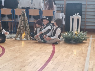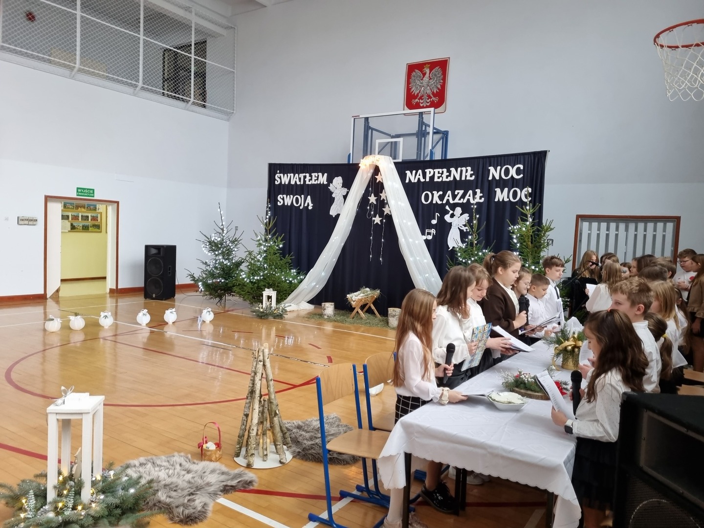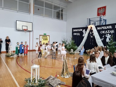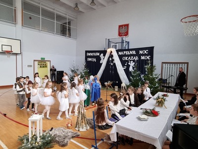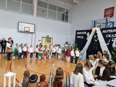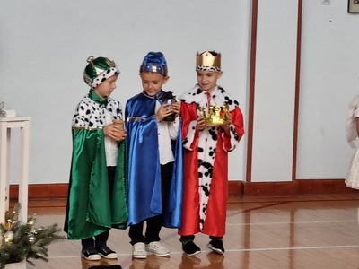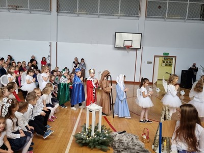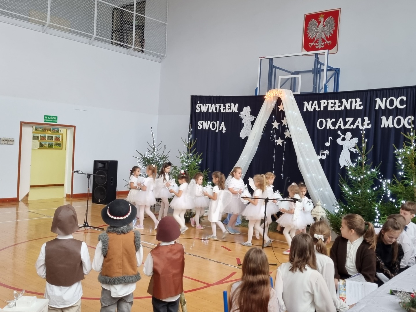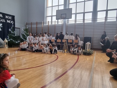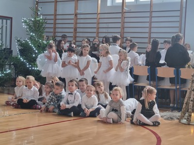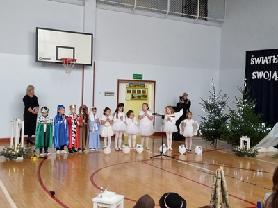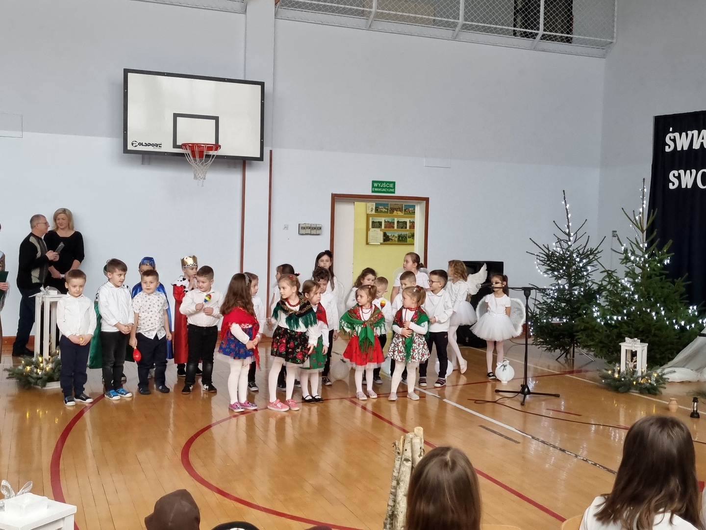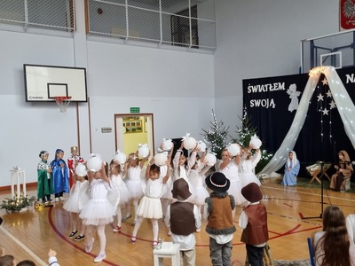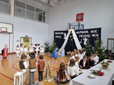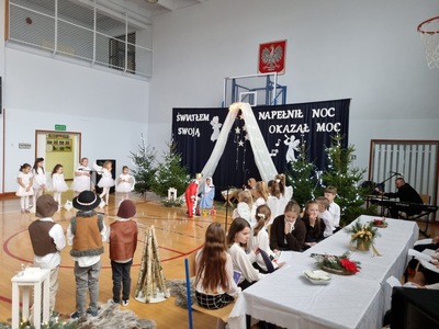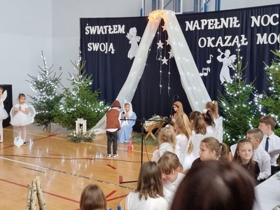 21 grudnia 2023 roku w naszym przedszkolu odbyły się Jasełka Bożonarodzeniowe w wykonaniu przedszkolaków oraz uczniów klas starszych. Dzieci w strojach Maryi, Świętego Józefa, pastuszków, królów i aniołów w przejmujący sposób opowiedziały historię Bożego Narodzenia. Celem wystąpienia było wprowadzenie wszystkich w świąteczną atmosferę, pełną radości z Narodzenia Pana. Podczas występu przedszkolaki zaprezentowały cały wachlarz swoich umiejętności: wokalnych, recytatorskich i tanecznych. Swoje role mówiły z wielkim przejęciem. Nie zabrakło również pięknych polskich kolęd, pastorałek i tańca aniołów z lampionami. Przepiękna scenografia, stroje aktorów i dekoracja sprawiły, że wszystkim udzielił się świąteczny nastrój. Zaproszeni Rodzice dzieci ulegli magii występów przedszkolaków, nagradzając swoje pociechy gromkimi brawami. Na koniec Jasełek Pani Dyrektor Krystyna Świerczyńska złożyły wszystkim życzenia z okazji zbliżających się Świąt Bożego Narodzenia.