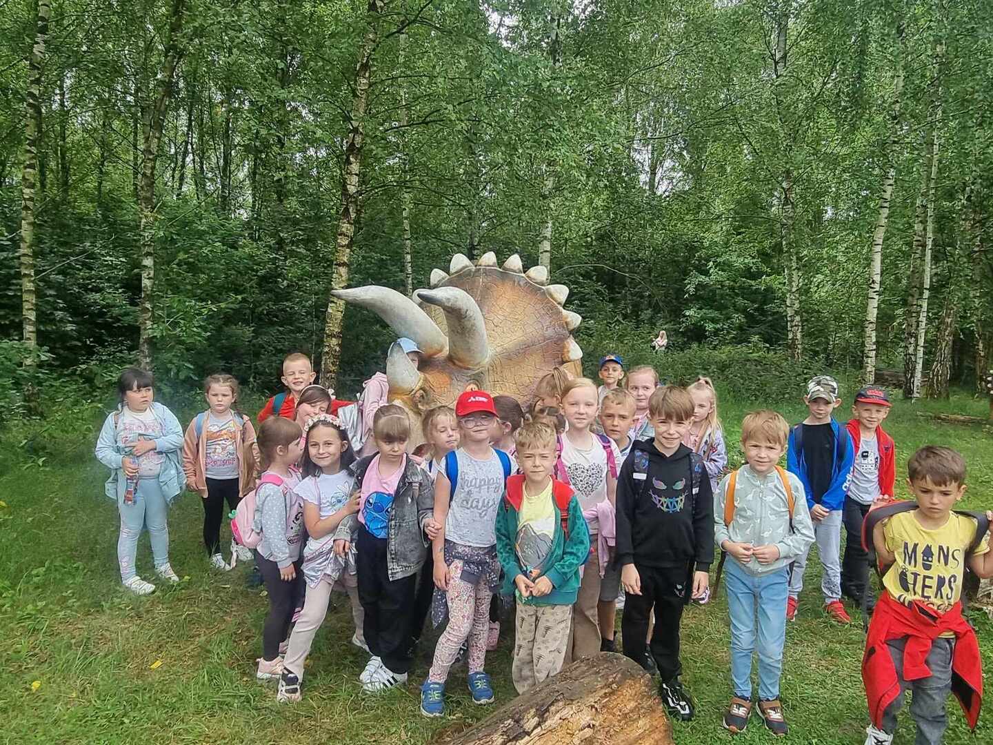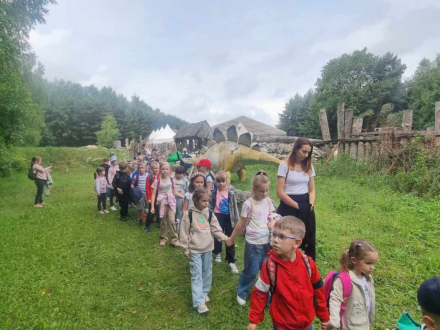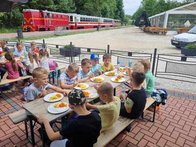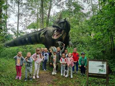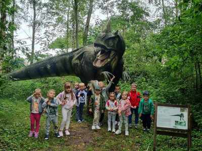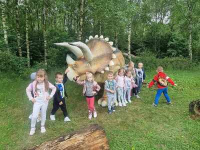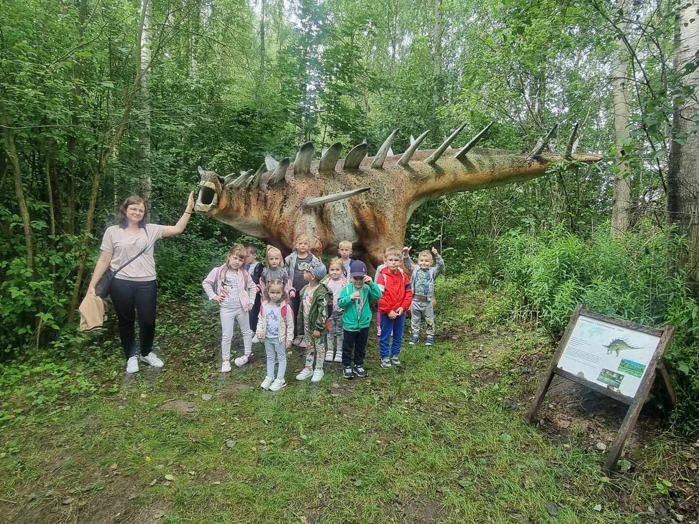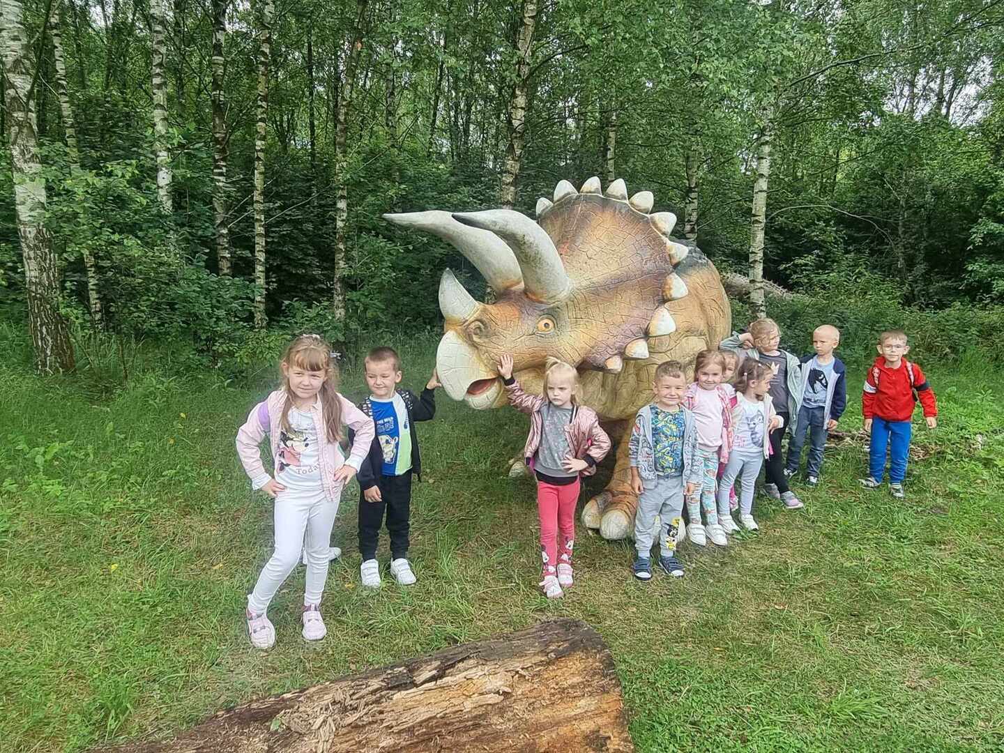 Dnia 10.06.2024 przedszkolaki wybrały się na wycieczkę Kolejką Wąskotorową „Ciuchcia Expres Ponidzie”.Trasa radosnego przejazu rozpoczęła się w Jędrzejowie a przebiegała po pięknych i malowniczych zakątkach regionu świętokrzyskiego do stacji Kompleksu Rekreacyjnego Sielsko na Wygodzie. Podczas przejażdzki podziwialiśmy stepową roślinność, wyjątkowe krajobrazy pól, łąk i lasów. Uzupełnieniem atrakcji był pobyt            w zajeżdzie „Sielsko na Wygodzie”. Dzieci zwiedziły Dinopark, w którym ogromne eksponaty dinozaurów wzbudziły ich ciekawość. Dzięki tablicom informacyjnym oraz panu przewodnikowi, dzieci zostały zaznajomione  z historią zainstalowanych wśród drzew dinozaurów. Kolejną atrakcją było zwiedzanie stajni i mini zoo. Dzieci mogły karmić zwierzęta przygotowanymi przez właścicieli przysmakami.