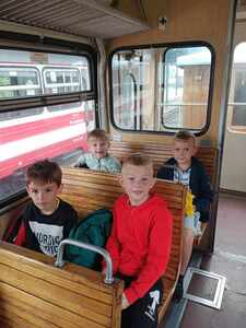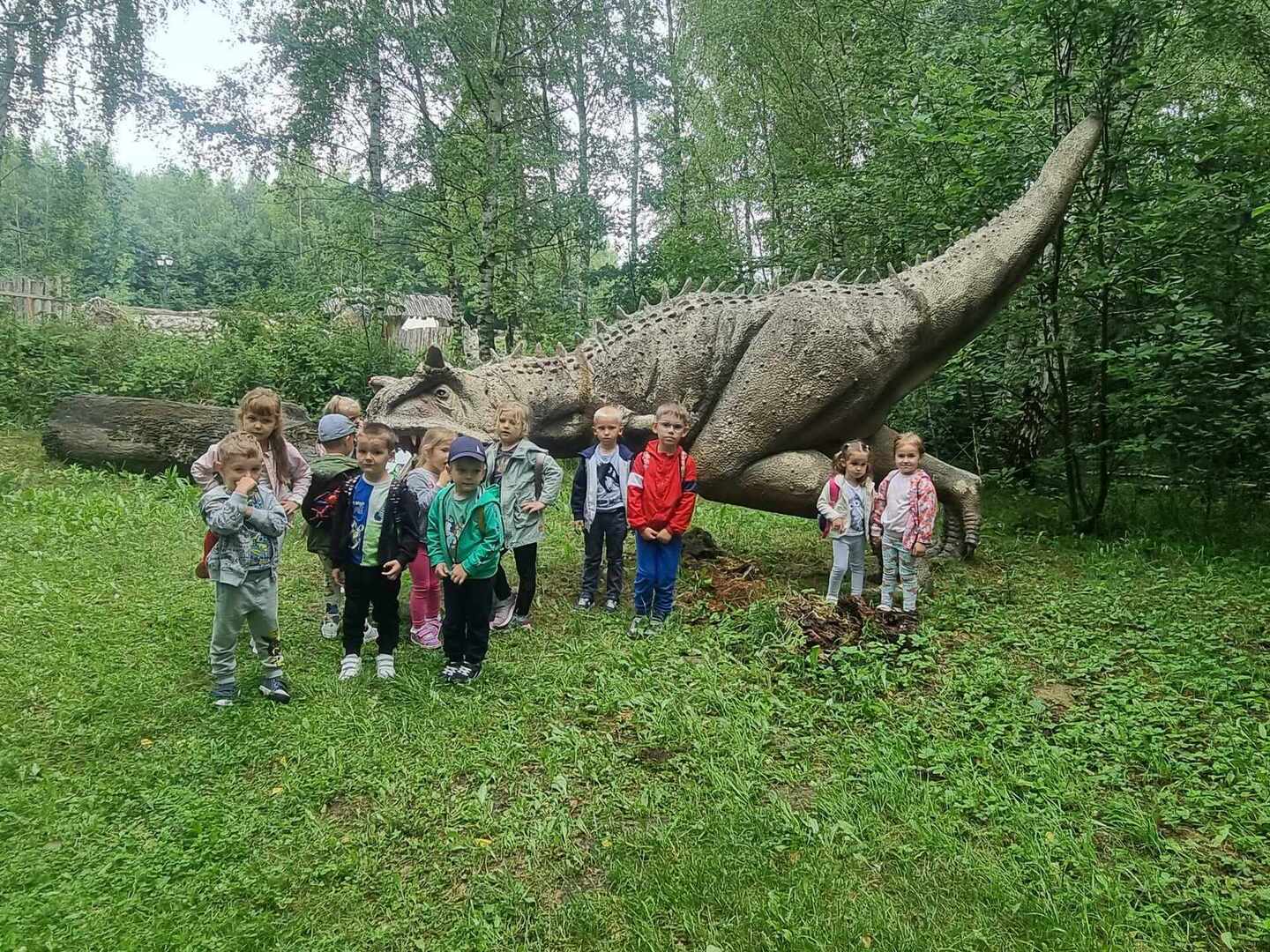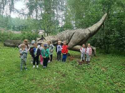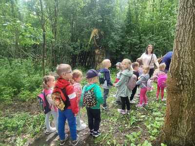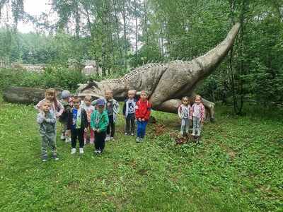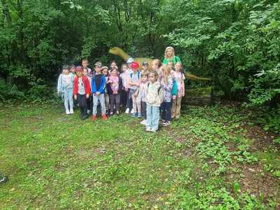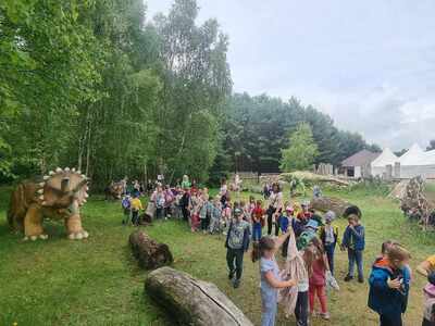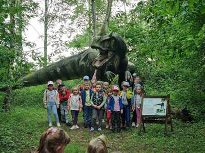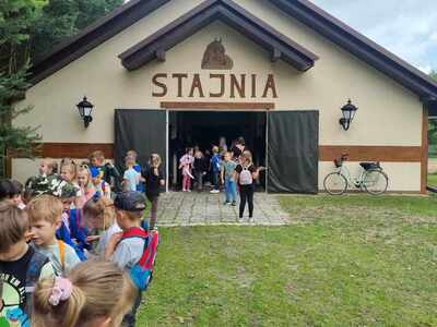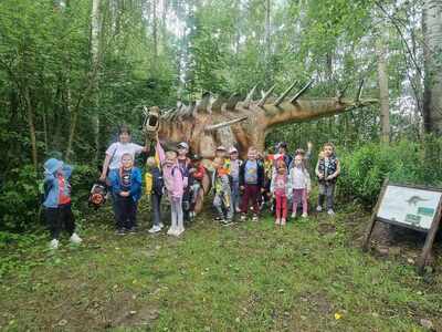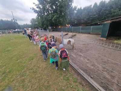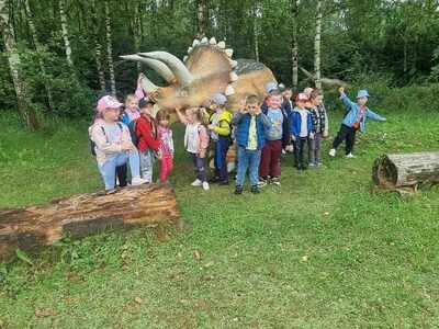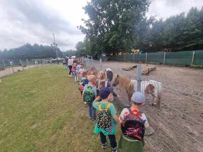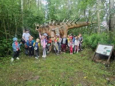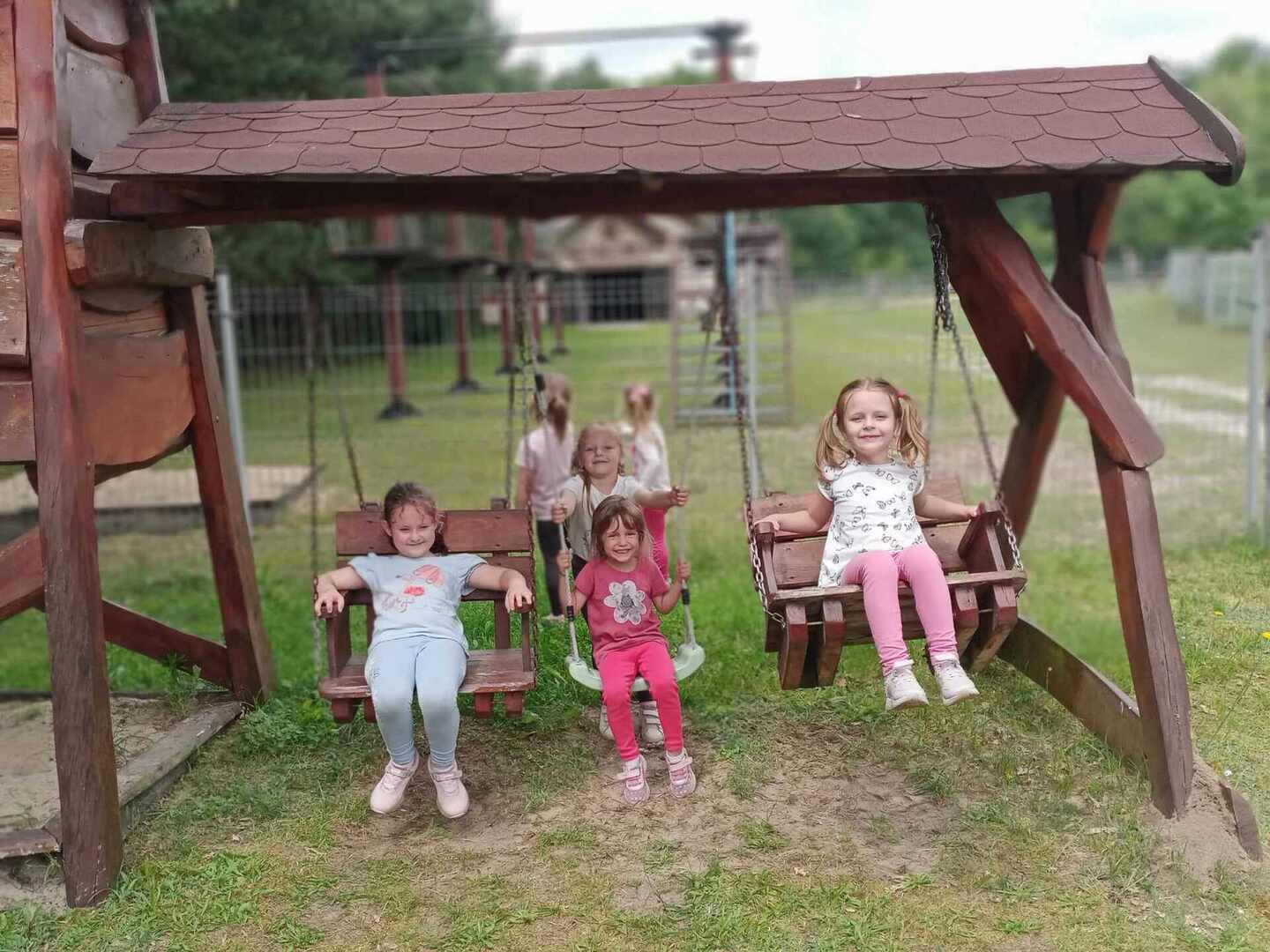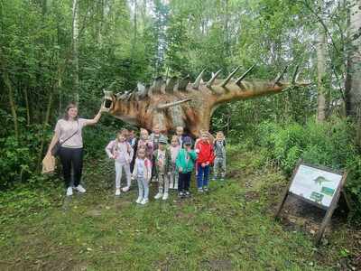 Dnia 10.06.2024 przedszkolaki wybrały się na wycieczkę Kolejką Wąskotorową „Ciuchcia Expres Ponidzie”.Trasa radosnego przejazu rozpoczęła się w Jędrzejowie a przebiegała po pięknych i malowniczych zakątkach regionu świętokrzyskiego do stacji Kompleksu Rekreacyjnego Sielsko na Wygodzie. Podczas przejażdzki podziwialiśmy stepową roślinność, wyjątkowe krajobrazy pól, łąk i lasów. Uzupełnieniem atrakcji był pobyt            w zajeżdzie „Sielsko na Wygodzie”. Dzieci zwiedziły Dinopark, w którym ogromne eksponaty dinozaurów wzbudziły ich ciekawość. Dzięki tablicom informacyjnym oraz panu przewodnikowi, dzieci zostały zaznajomione  z historią zainstalowanych wśród drzew dinozaurów. Kolejną atrakcją było zwiedzanie stajni i mini zoo. Dzieci mogły karmić zwierzęta przygotowanymi przez właścicieli przysmakami.