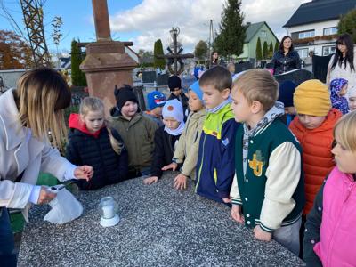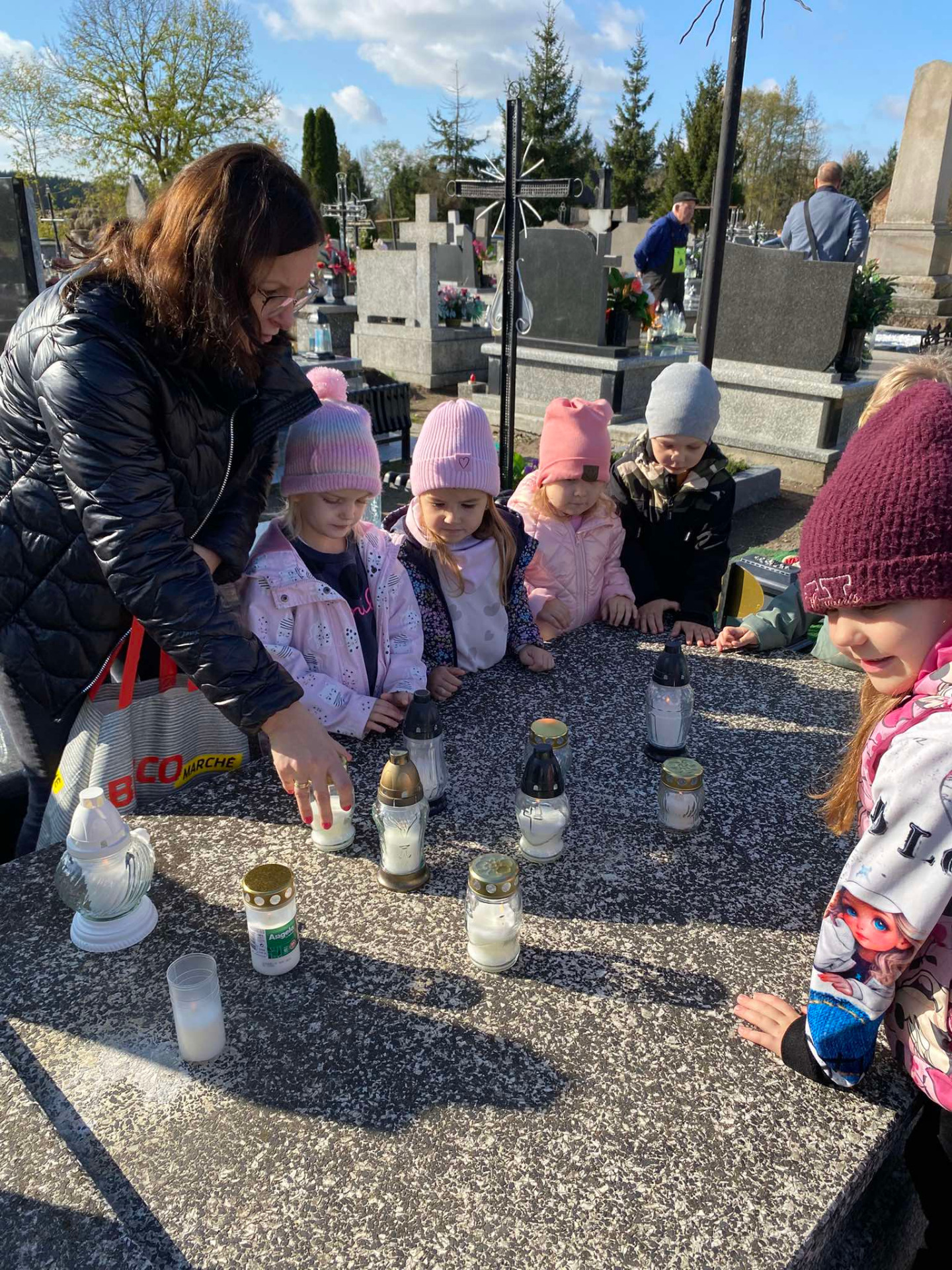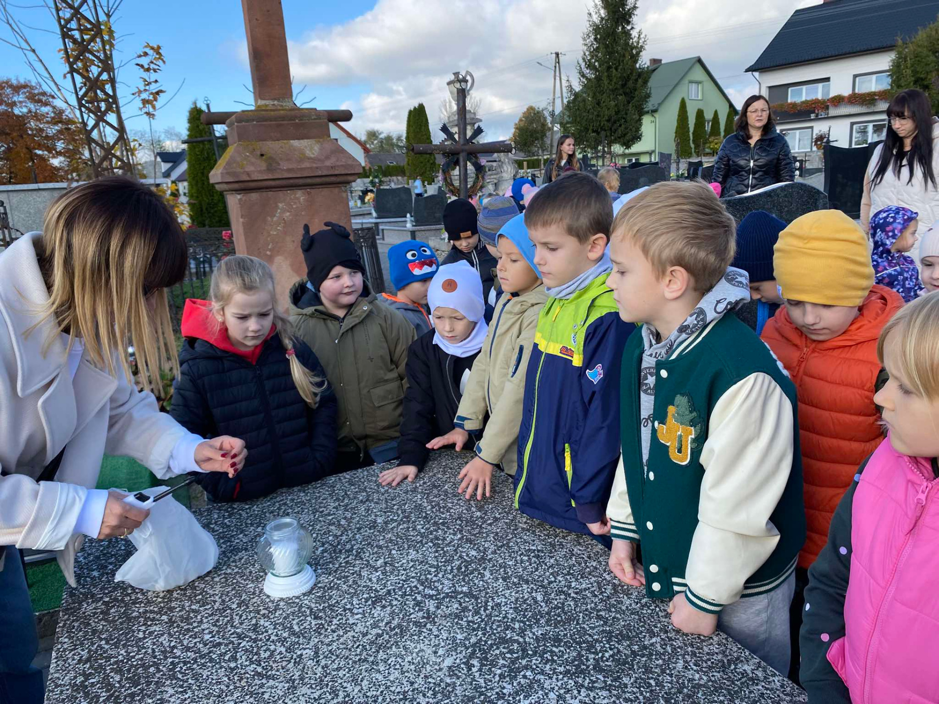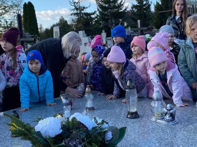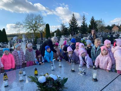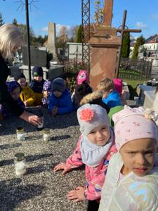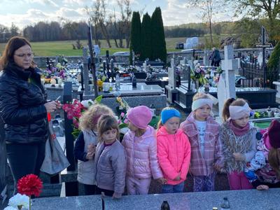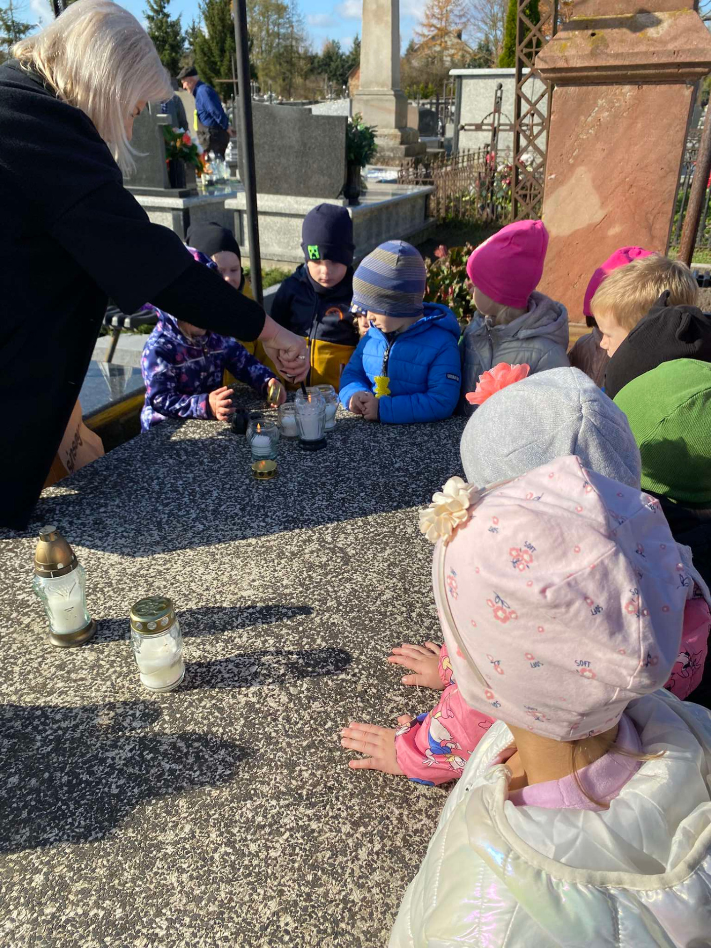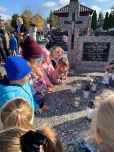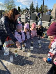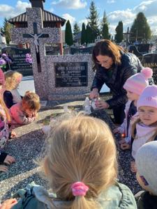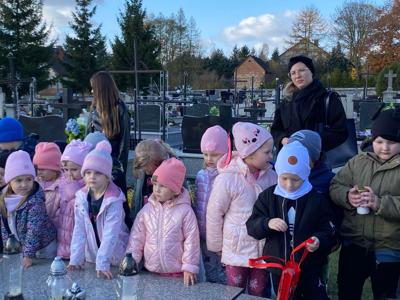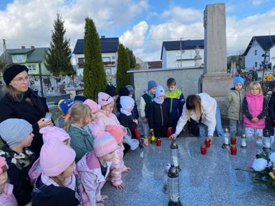 Święto Zmarłych, to czas, w którym odwiedzamy groby i wspominamy tych, którzy od nas odeszli. Kultywując polską tradycję, przedszkolaki  udały się na pobliski  Cmentarz, gdzie uczciły pamięć poległych żołnierzy  w skupieniu odmawiając modlitwę oraz zapalając znicze . Przedszkolaki mogły również posłuchać opowieści nauczycielek na temat przeszłości naszej ojczyzny, miały okazję przyjrzeć się pracy ludzi, którzy przed Świętem Zmarłych porządkowali groby swoich bliskich. To spotkanie –  zarówno z polską historią, jak i tradycją obchodzenia tak ważnego dla nas Polaków  święta, na pewno pozytywnie wpłynie na postawy patriotyczne naszych wychowanków.