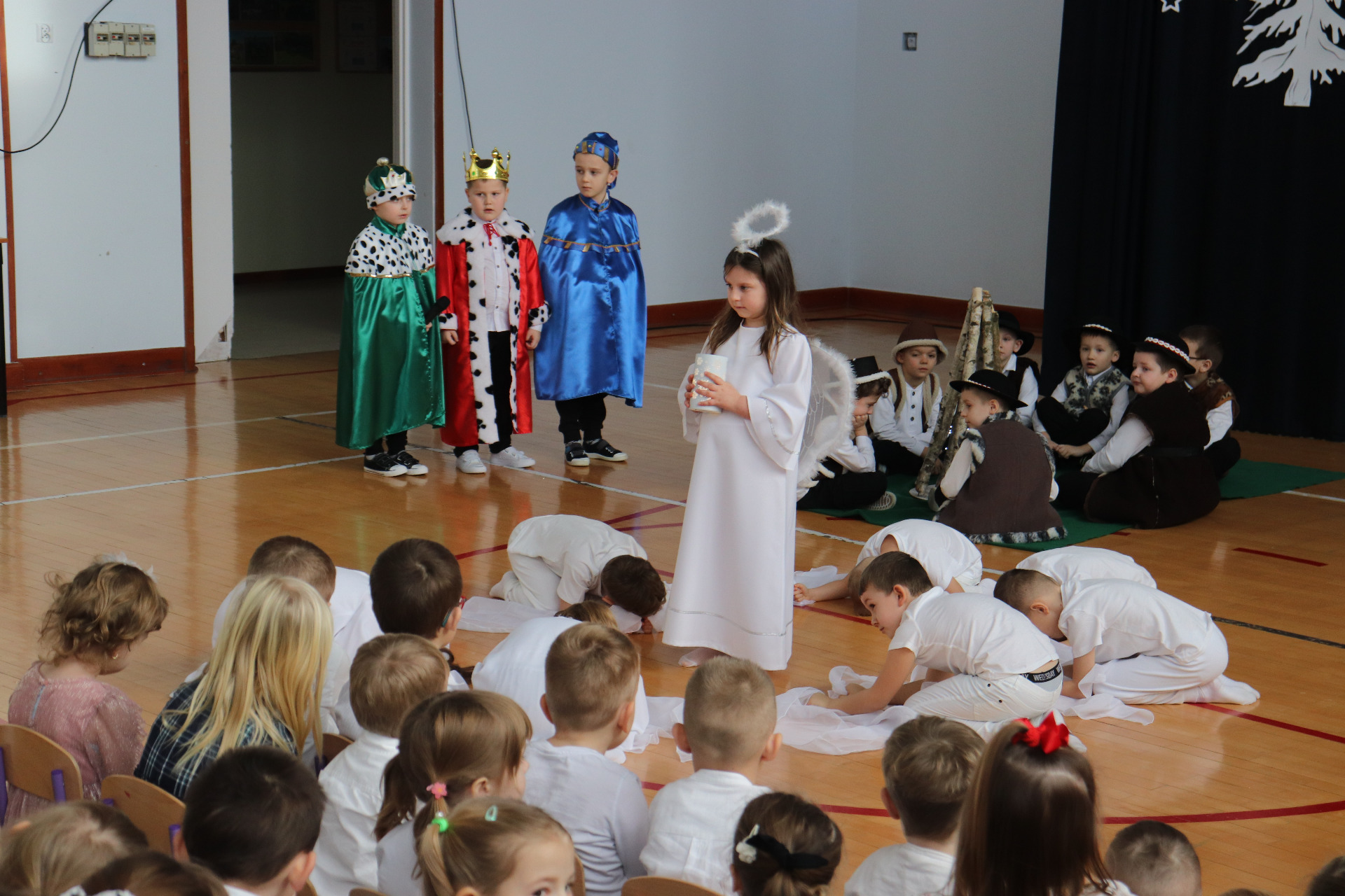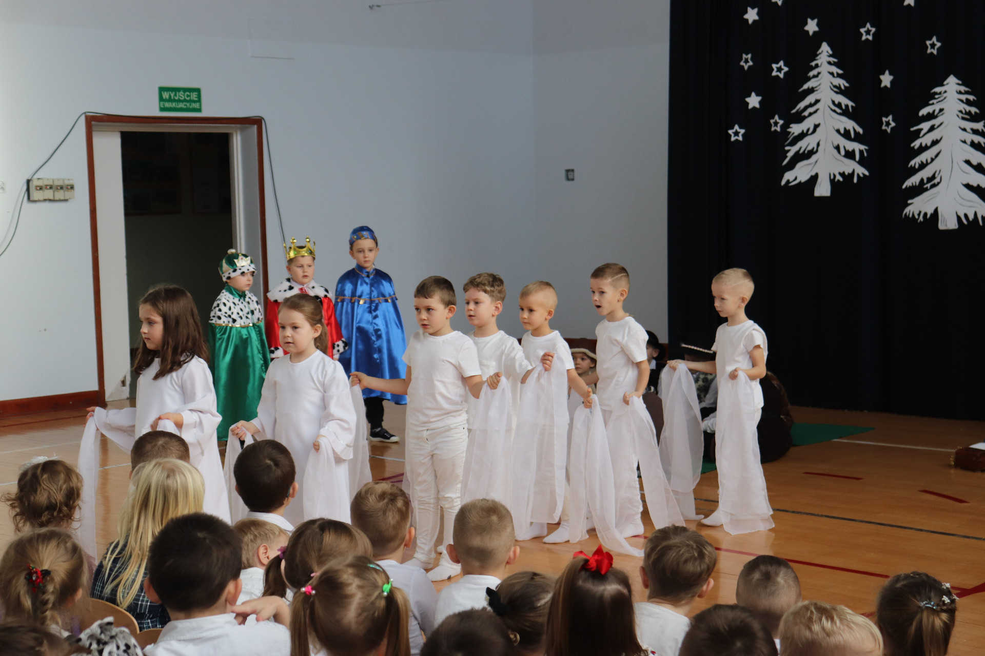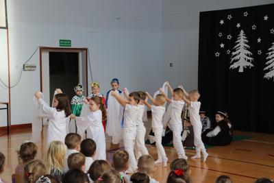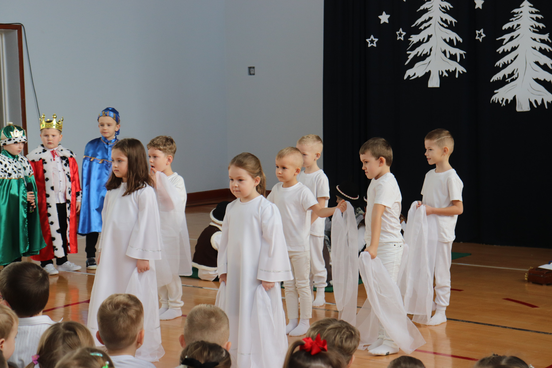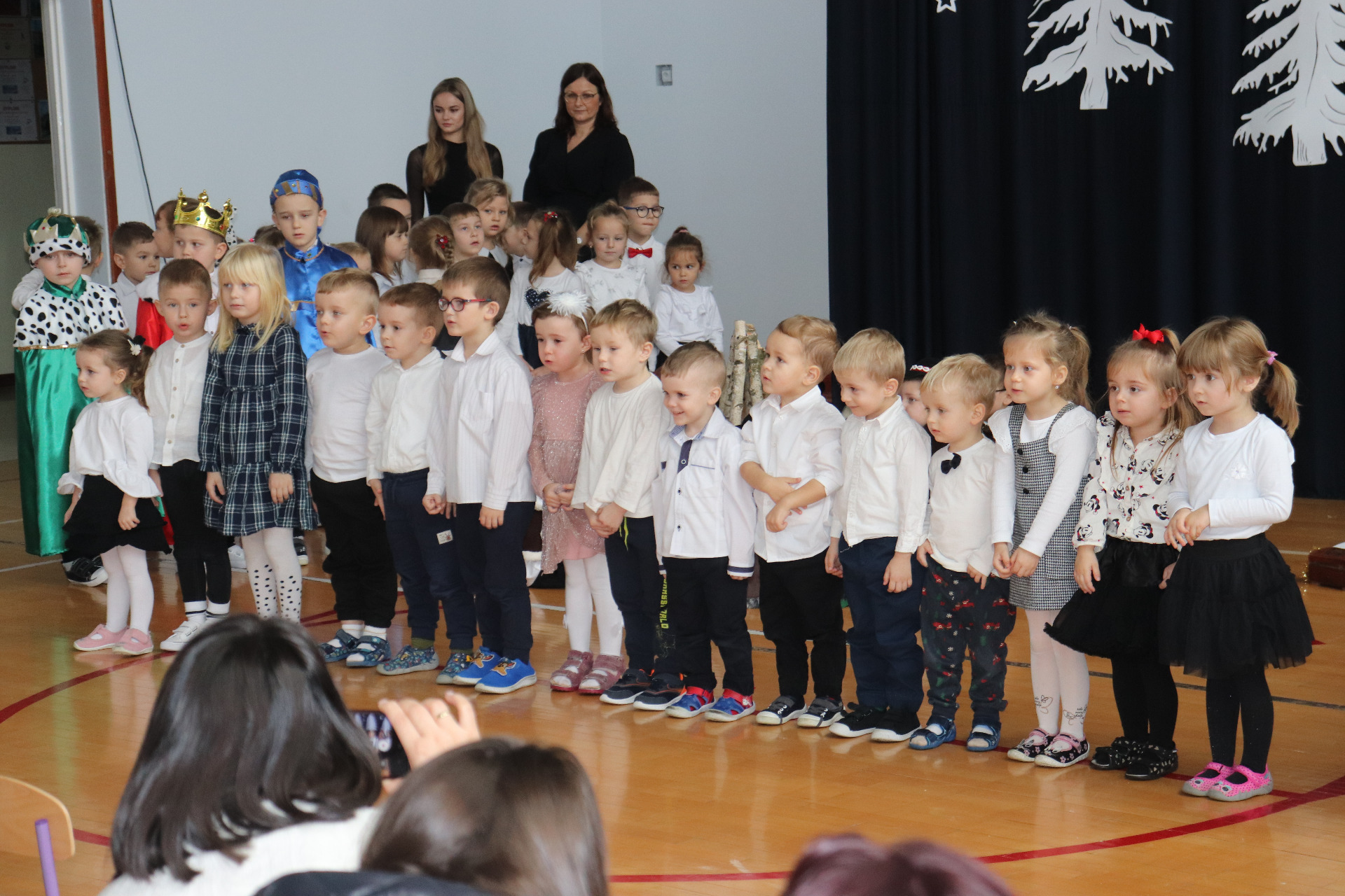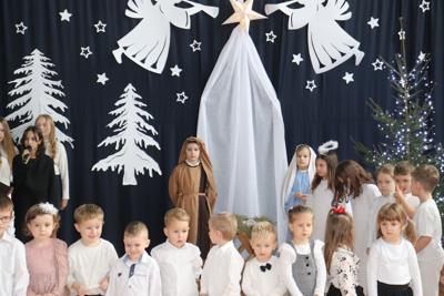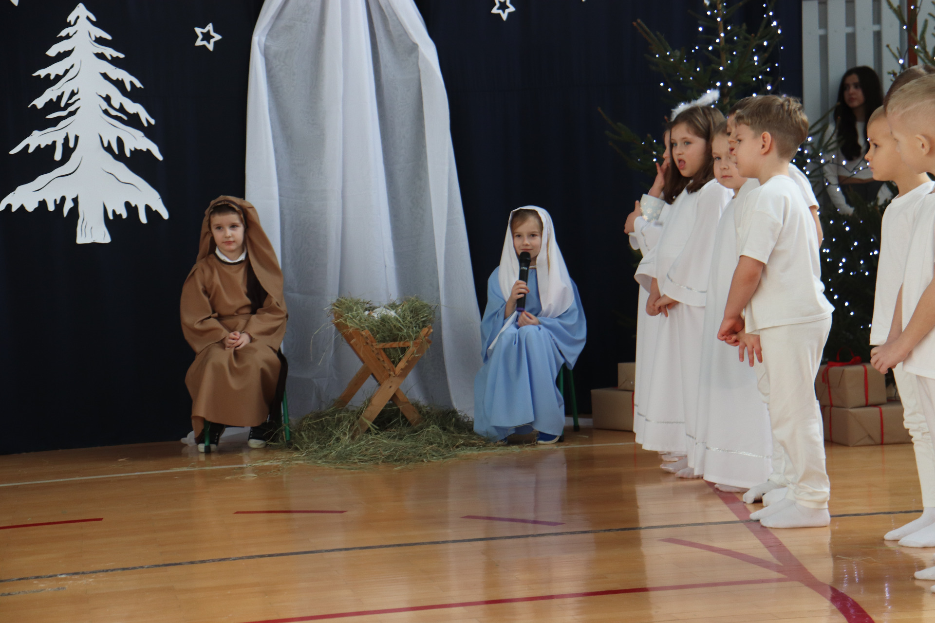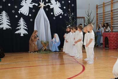 Wigilia Bożego Narodzenia to jeden z najpiękniejszych dni w roku, dlatego tradycją naszego przedszkola jest przygotowanie i wystawienie w okresie przedświątecznym Jasełek. Przedstawienie jasełkowe w wykonaniu przedszkolaków wprowadziły całą społeczność przedszkolną i szkolną w świąteczny i magiczny czas. Świąteczny nastrój podkreślały niecodzienne stroje dzieci, bożonarodzeniowa dekoracja sceny – stajenka z Józefem , Maryją  i Dzieciątkiem. Mali aktorzy z wielkim przejęciem wygłaszali swoje role i z radością śpiewali kolędy i pastorałki. Najstarsza grupa zaprezentowała również taniec w białych strojach do pastorałki „Mario czy ty wiesz…”