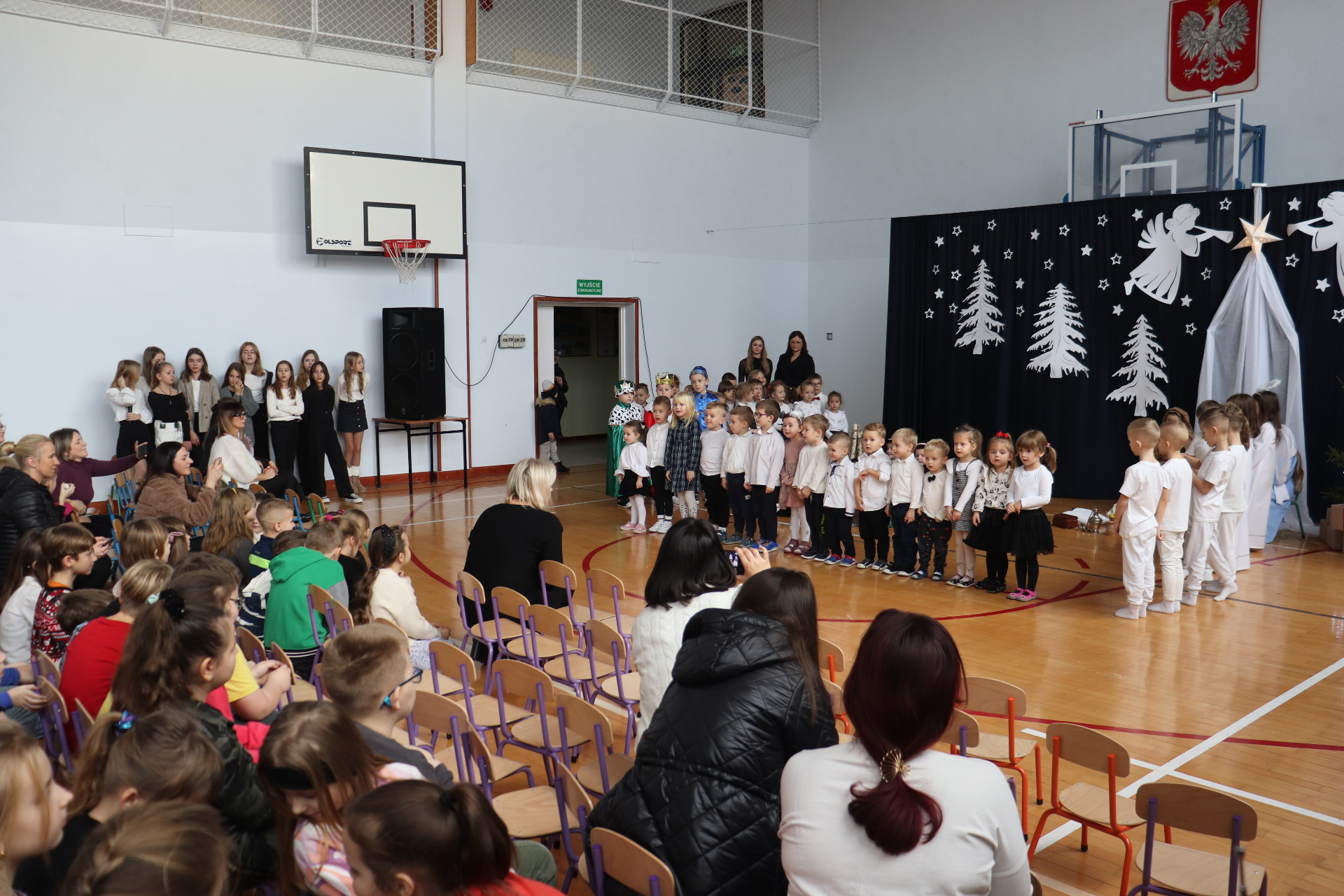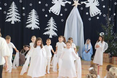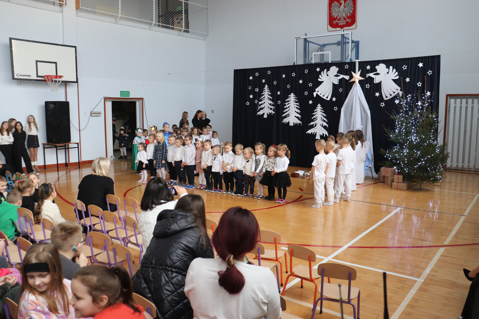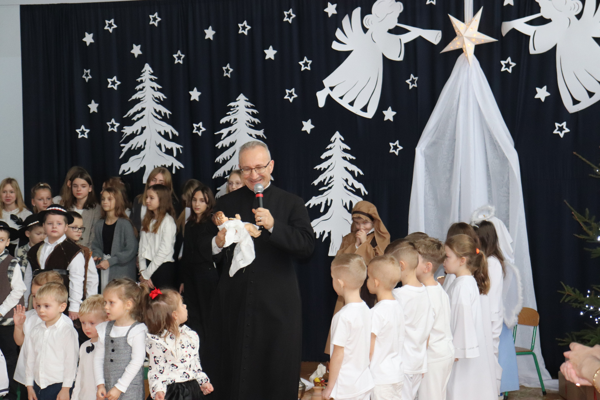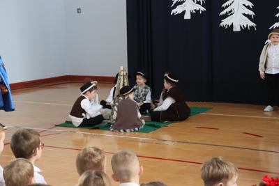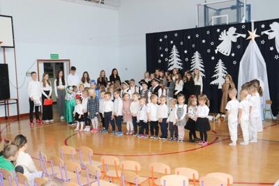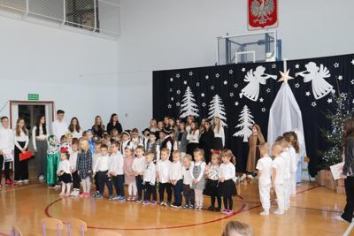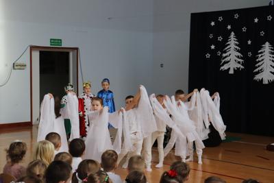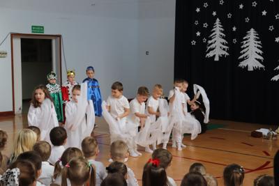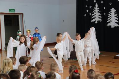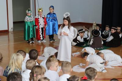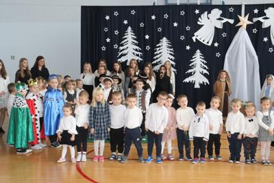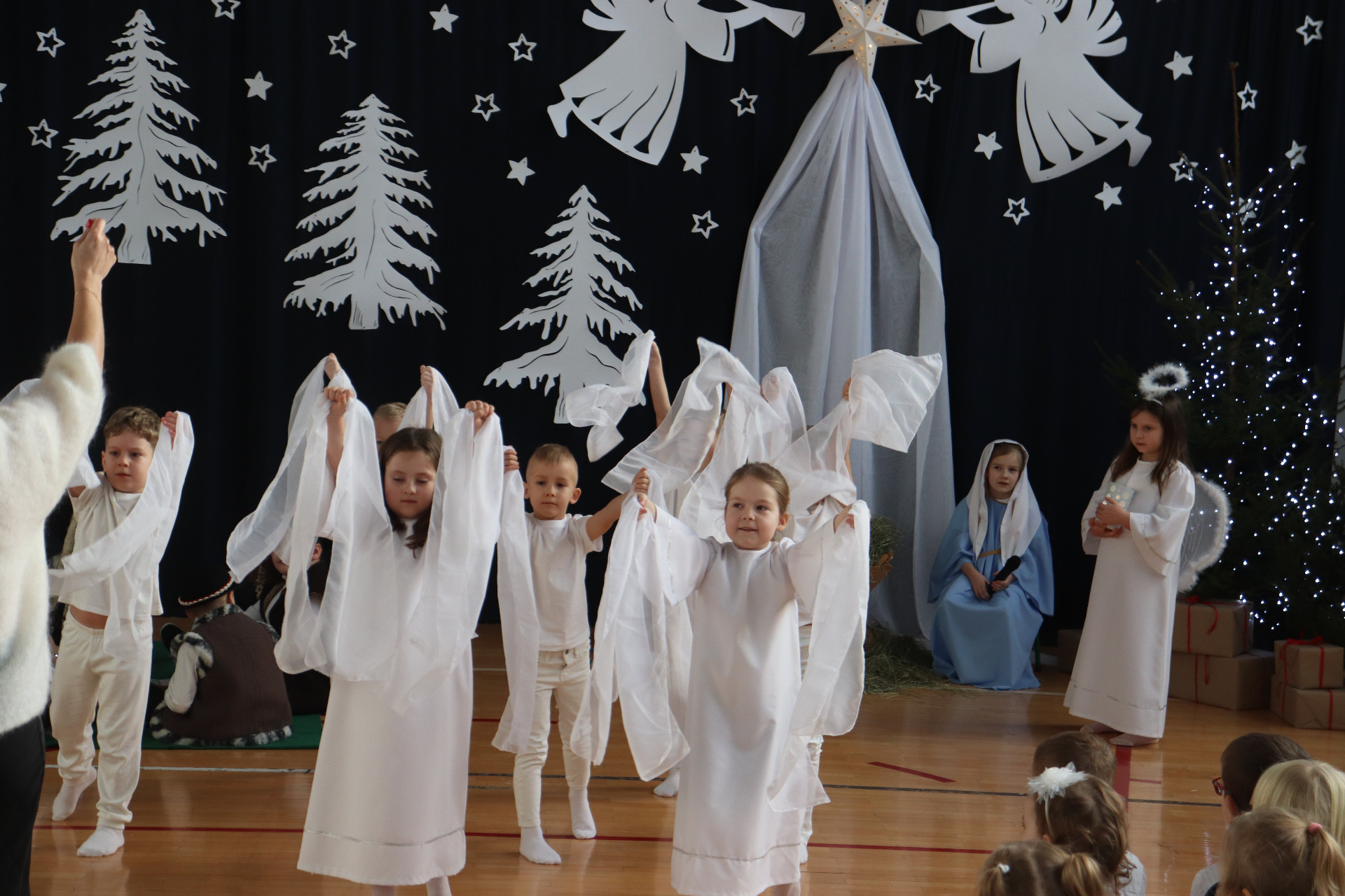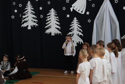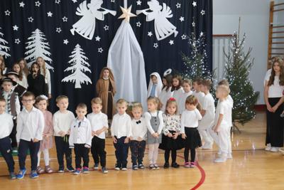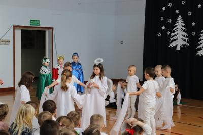 Wigilia Bożego Narodzenia to jeden z najpiękniejszych dni w roku, dlatego tradycją naszego przedszkola jest przygotowanie i wystawienie w okresie przedświątecznym Jasełek. Przedstawienie jasełkowe w wykonaniu przedszkolaków wprowadziły całą społeczność przedszkolną i szkolną w świąteczny i magiczny czas. Świąteczny nastrój podkreślały niecodzienne stroje dzieci, bożonarodzeniowa dekoracja sceny – stajenka z Józefem , Maryją  i Dzieciątkiem. Mali aktorzy z wielkim przejęciem wygłaszali swoje role i z radością śpiewali kolędy i pastorałki. Najstarsza grupa zaprezentowała również taniec w białych strojach do pastorałki „Mario czy ty wiesz…”