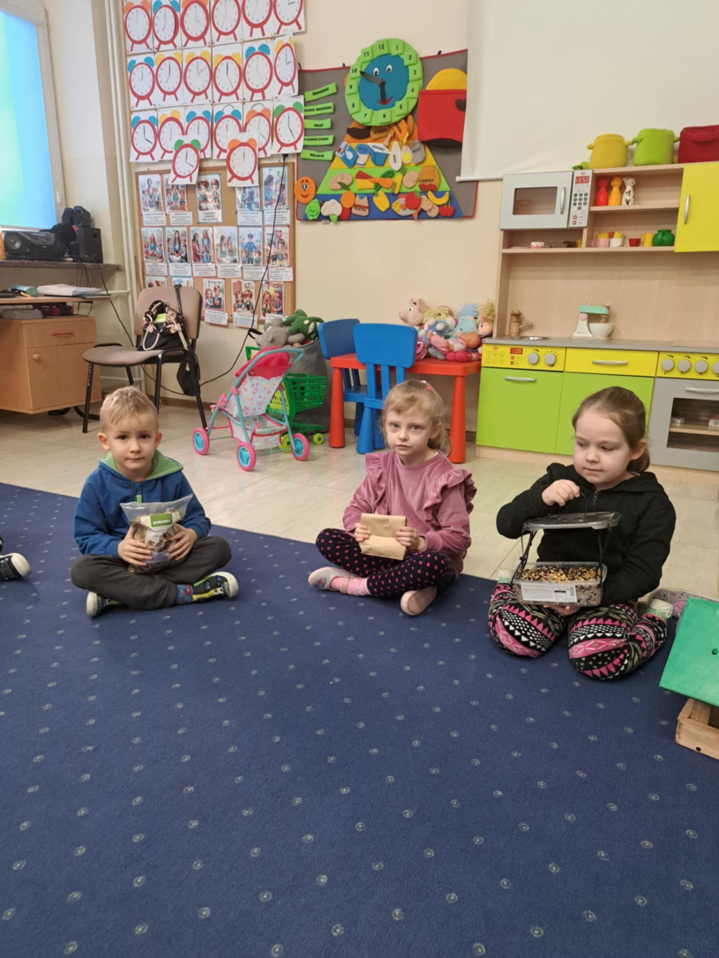 Zima jest niezwykle piękną i malowniczą porą roku, jednak nie dla wszystkich. Zwierzętom bez pomocy ludzi trudno byłoby przetrwać ten ciężki czas. Leśnicy dokarmiają zwierzęta leśne, a nasze przedszkolaki jak co roku włączyły się w akcję „Pomagamy ptakom przetrwać zimę”. Dokarmianie ptaków jest jedną z najbardziej rozpowszechnionych form ochrony zwierząt. Kiedy wokół wszystko przykryte jest białą „pierzynką” ptakom trudno jest znaleźć coś do jedzenia. Dlatego w naszym przedszkolu założyliśmy „ptasią stołówkę”. Na gałązkach drzew dzieci zawiesiły słoninkę, kulki z ziarnem oraz karmniki z nasionami  zbóż wykonane wspólnie z rodzicami. Takie działania mają ogromne walory edukacyjne dla dzieci, bowiem uwrażliwiają je na przyrodę, uczą odpowiedzialności za nią, a jednocześnie dają poczucie satysfakcji, że robią coś dobrego.