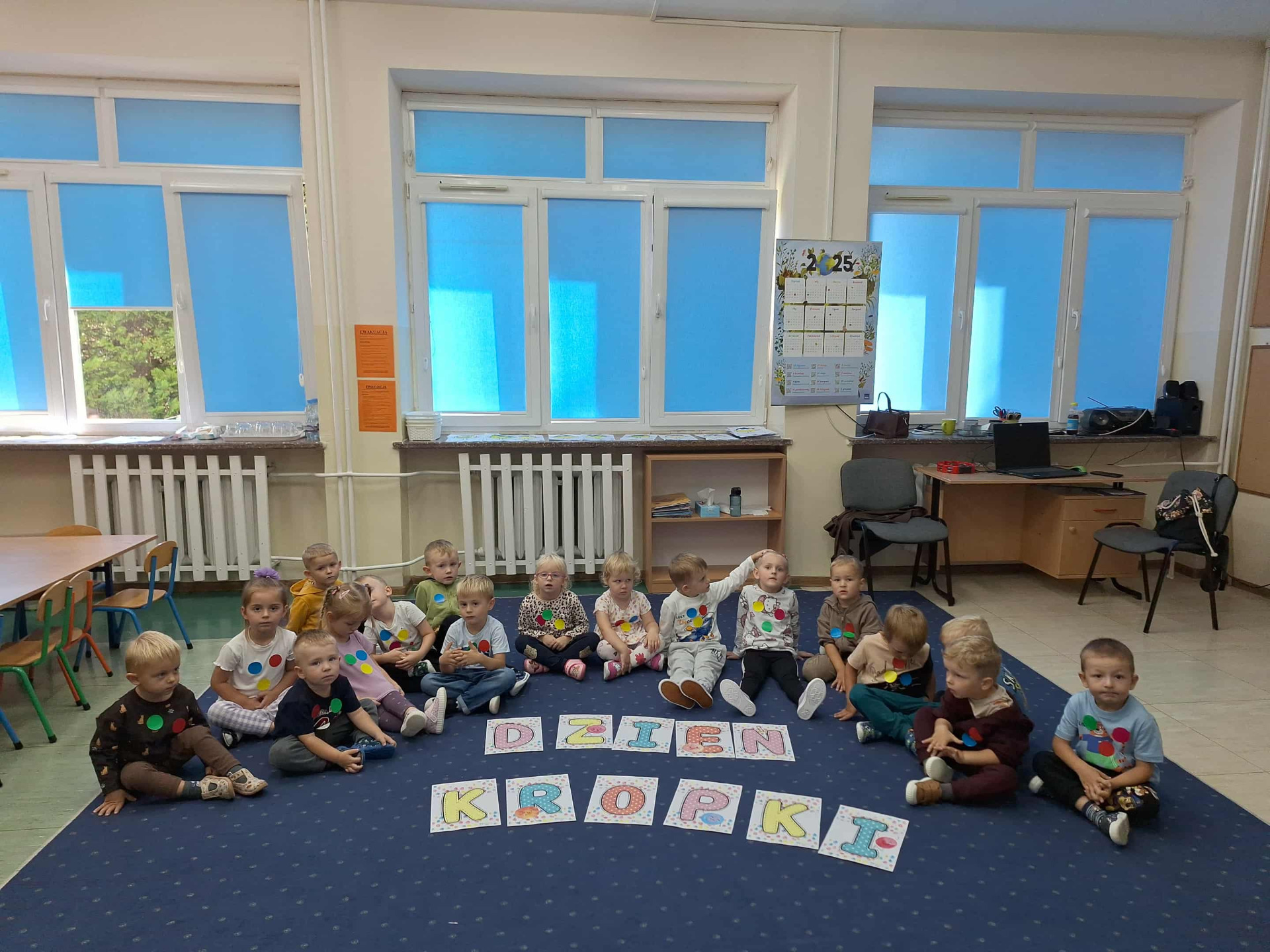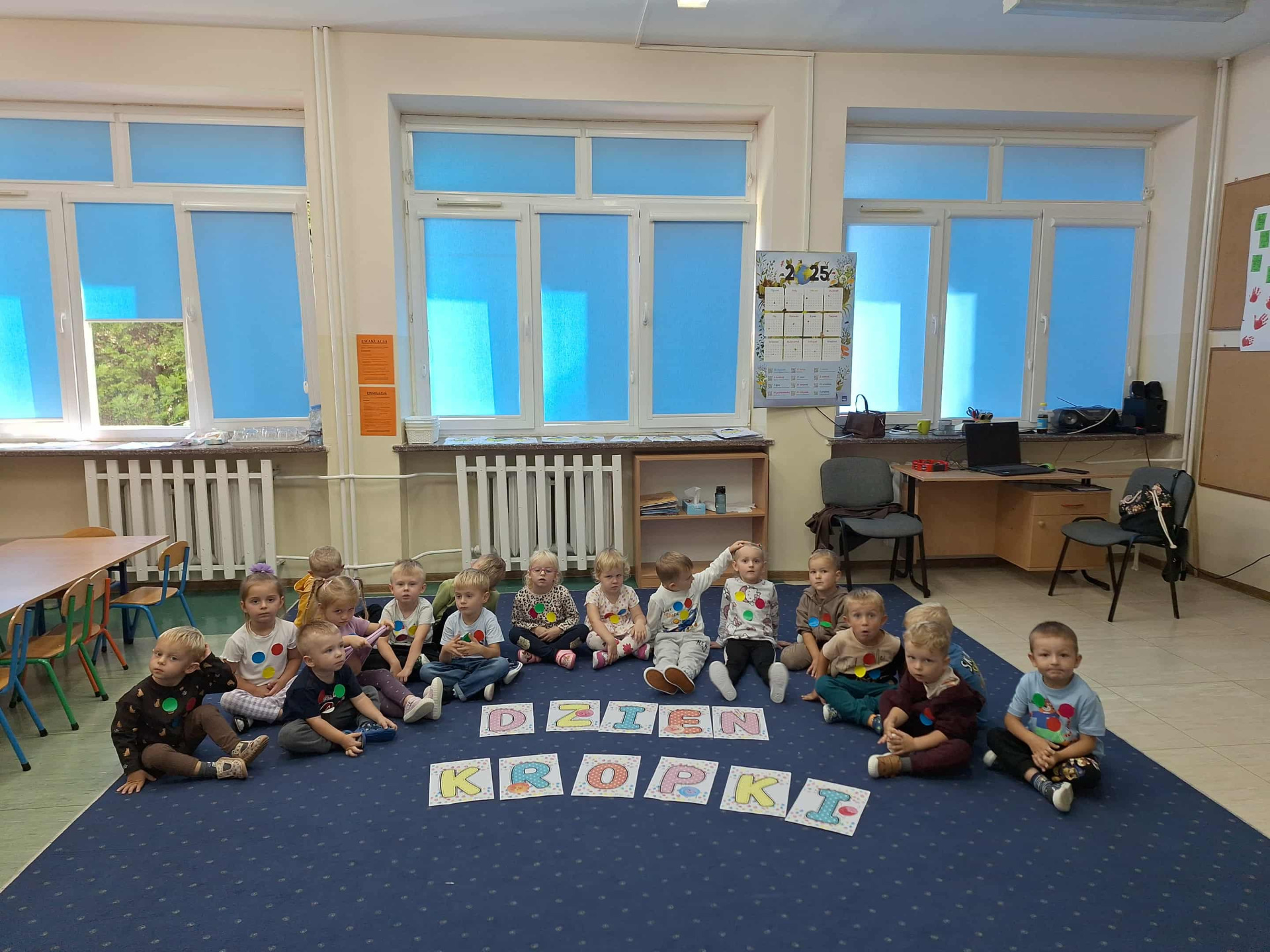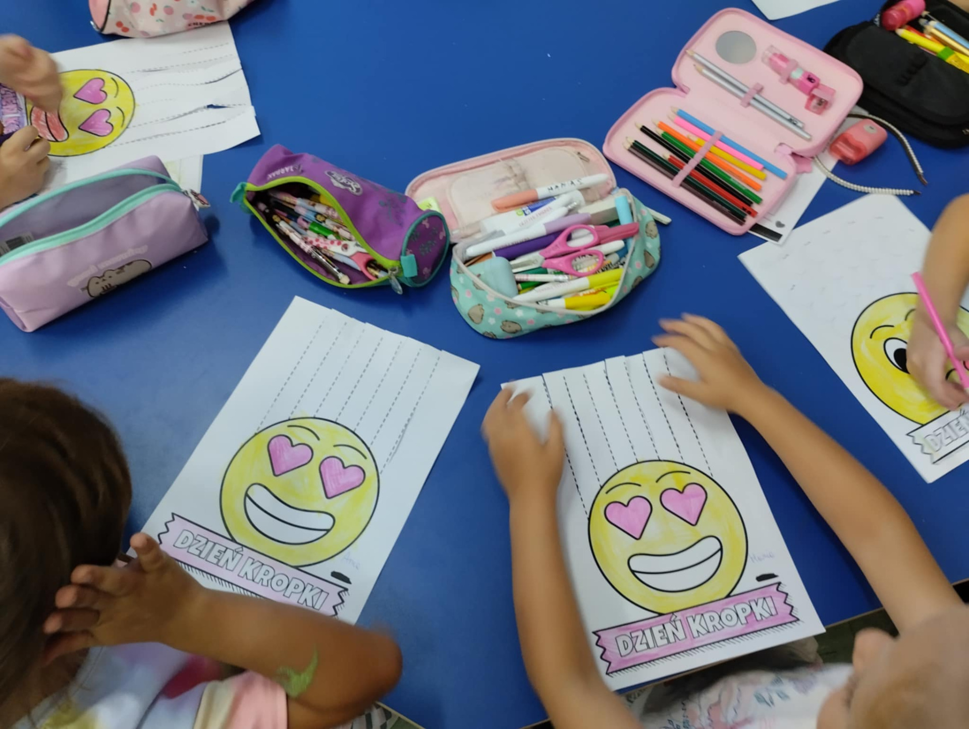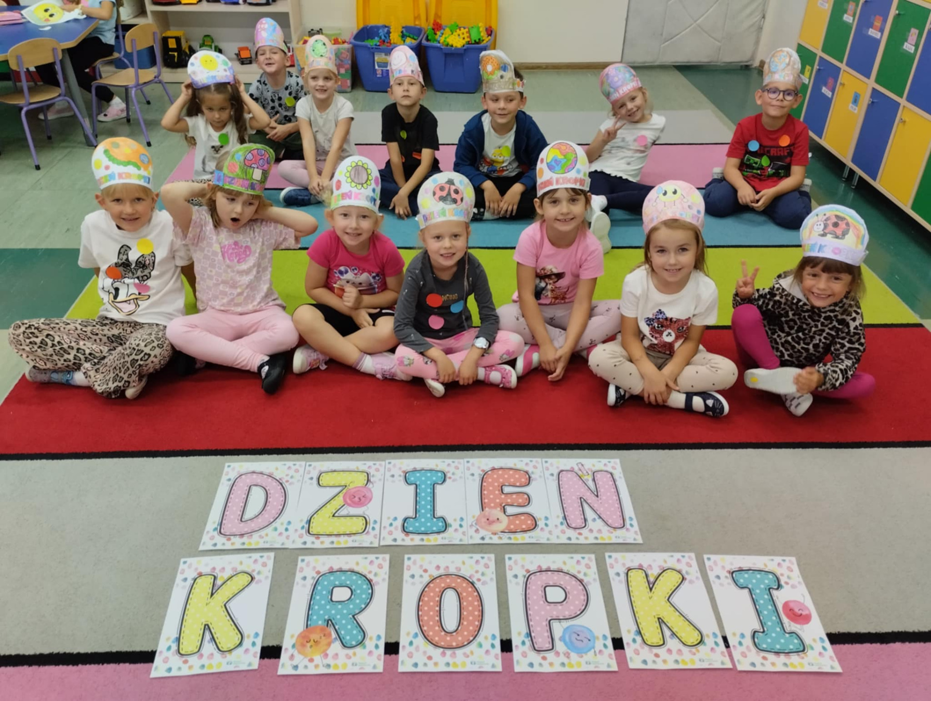 Dzieci tego dnia przystroiły się w kolorowe kropki oraz chętnie uczestniczyły w zabawach i zadaniach, oczywiście z kropką w roli głównej. Wspólnie odkryliśmy, że kropki towarzyszą nam dookoła w naszym codziennym życiu, nawet na naszym ciele i u zwierząt. Dzieci wymyślały co może powstać  z kropki, tworzyły ciekawe prace plastyczne. Wspólnie liczyliśmy, segregowaliśmy kolorowe kropki i bawiliśmy się z kropkami przy muzyce.