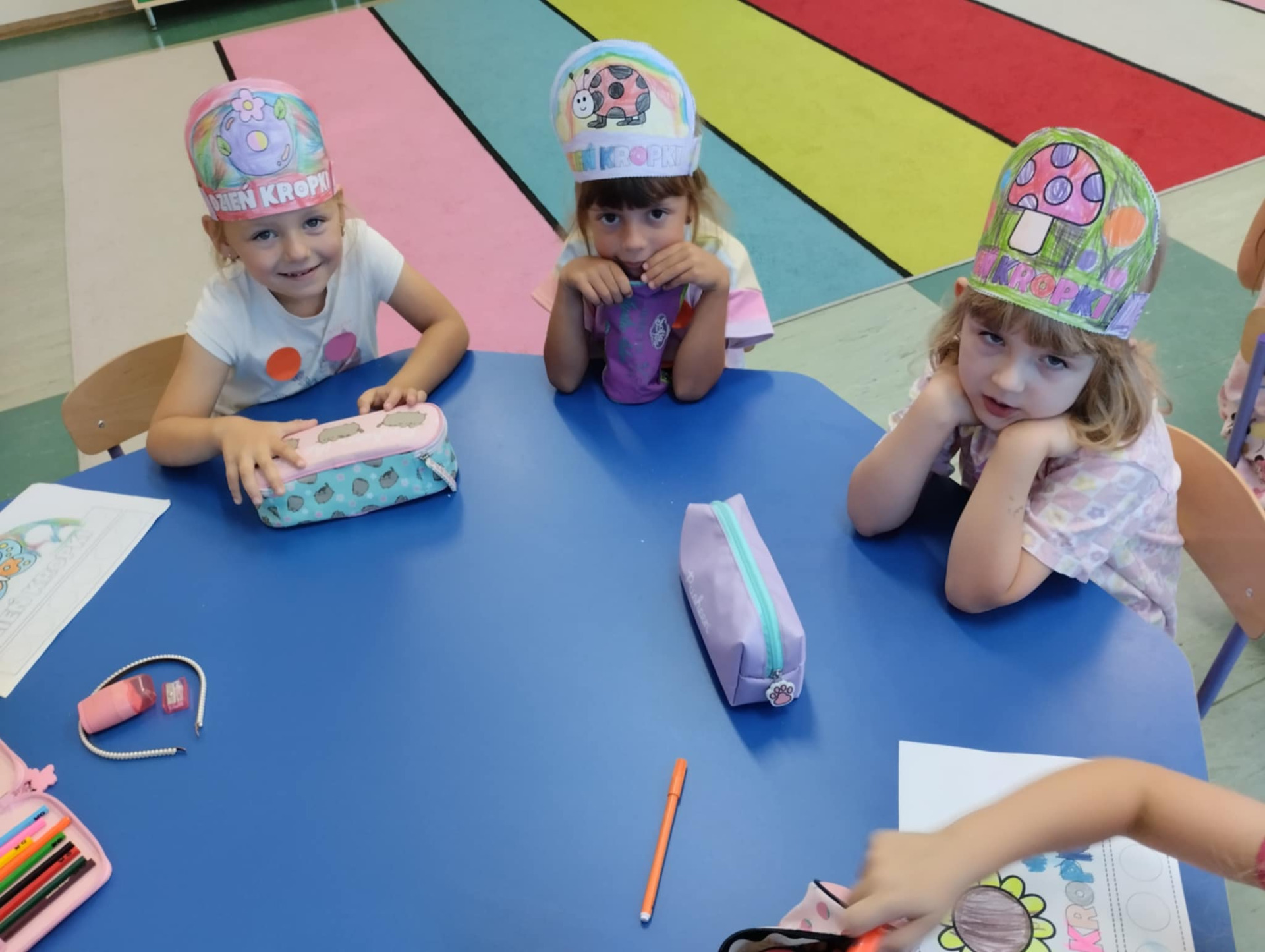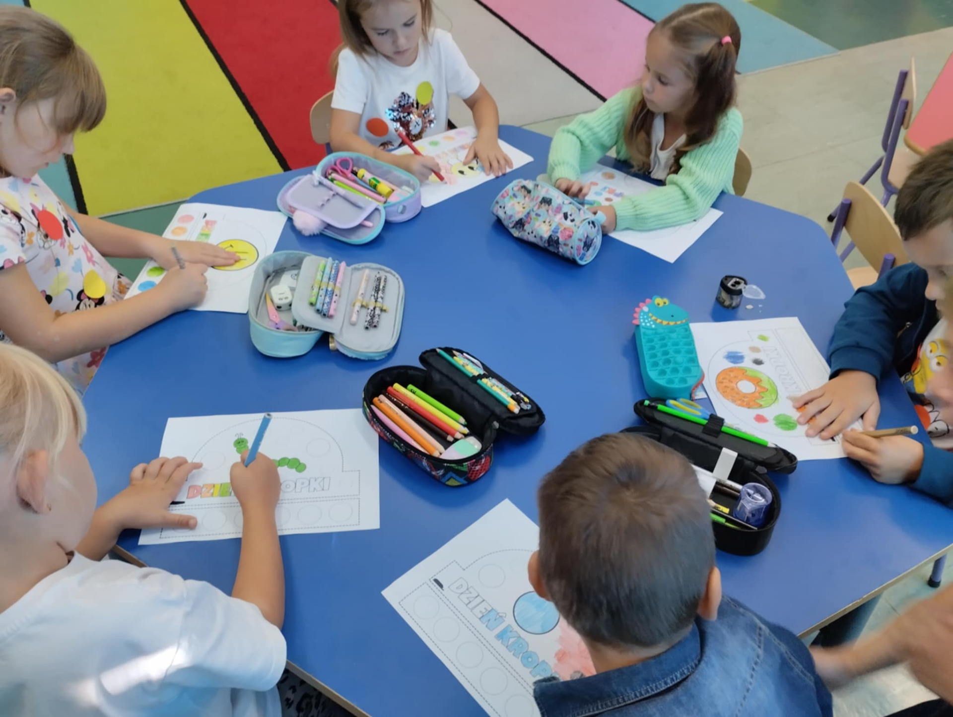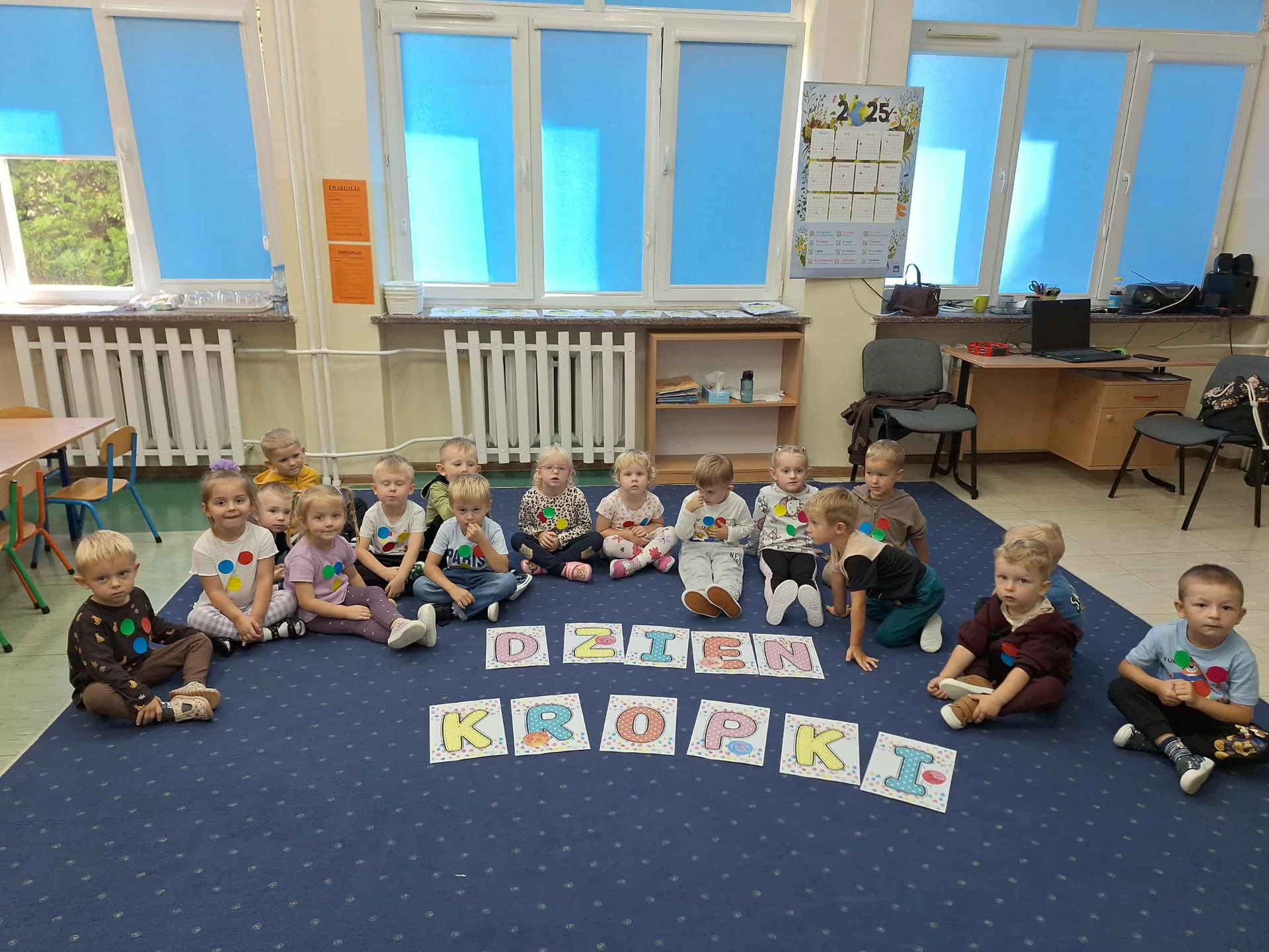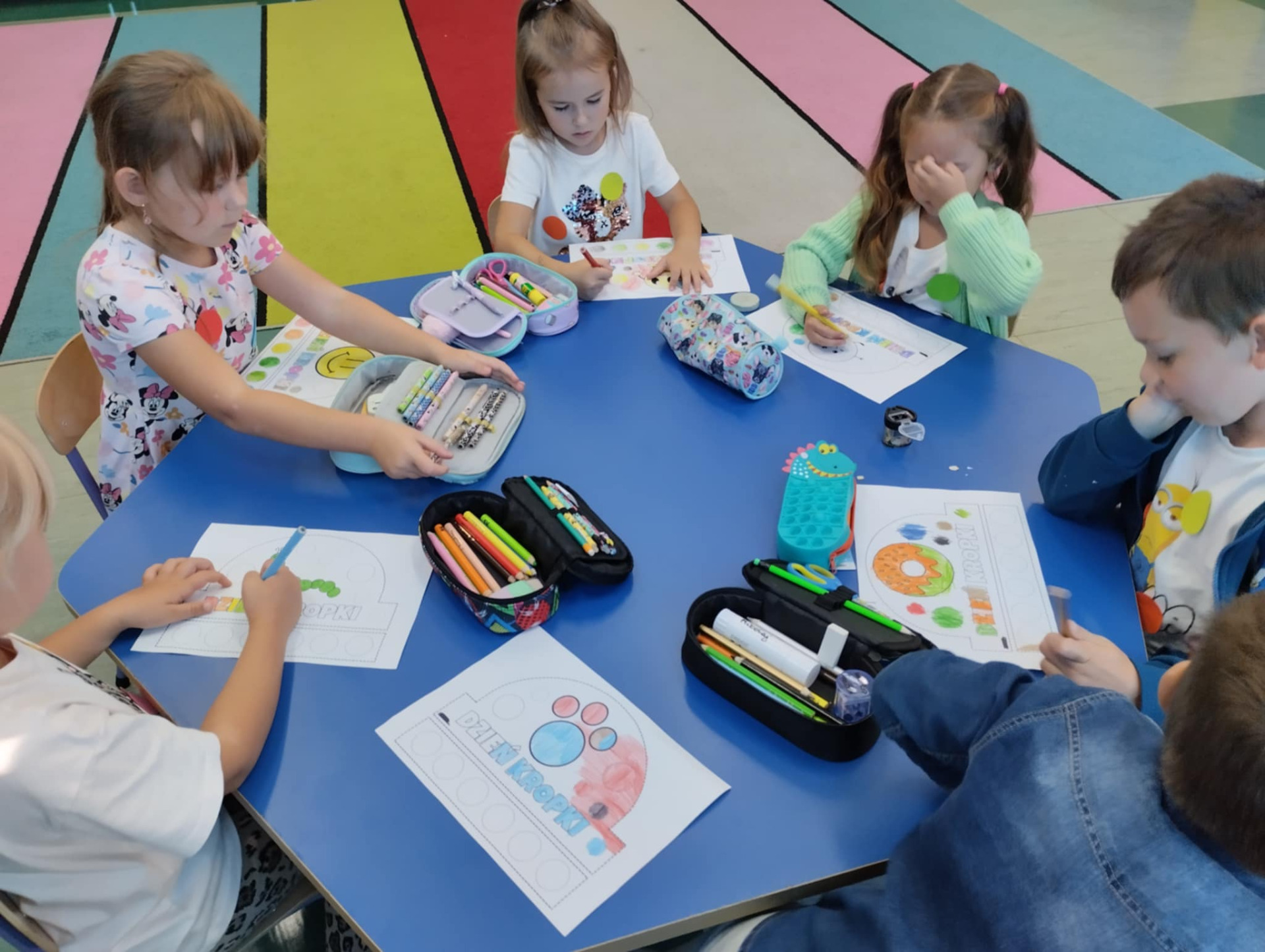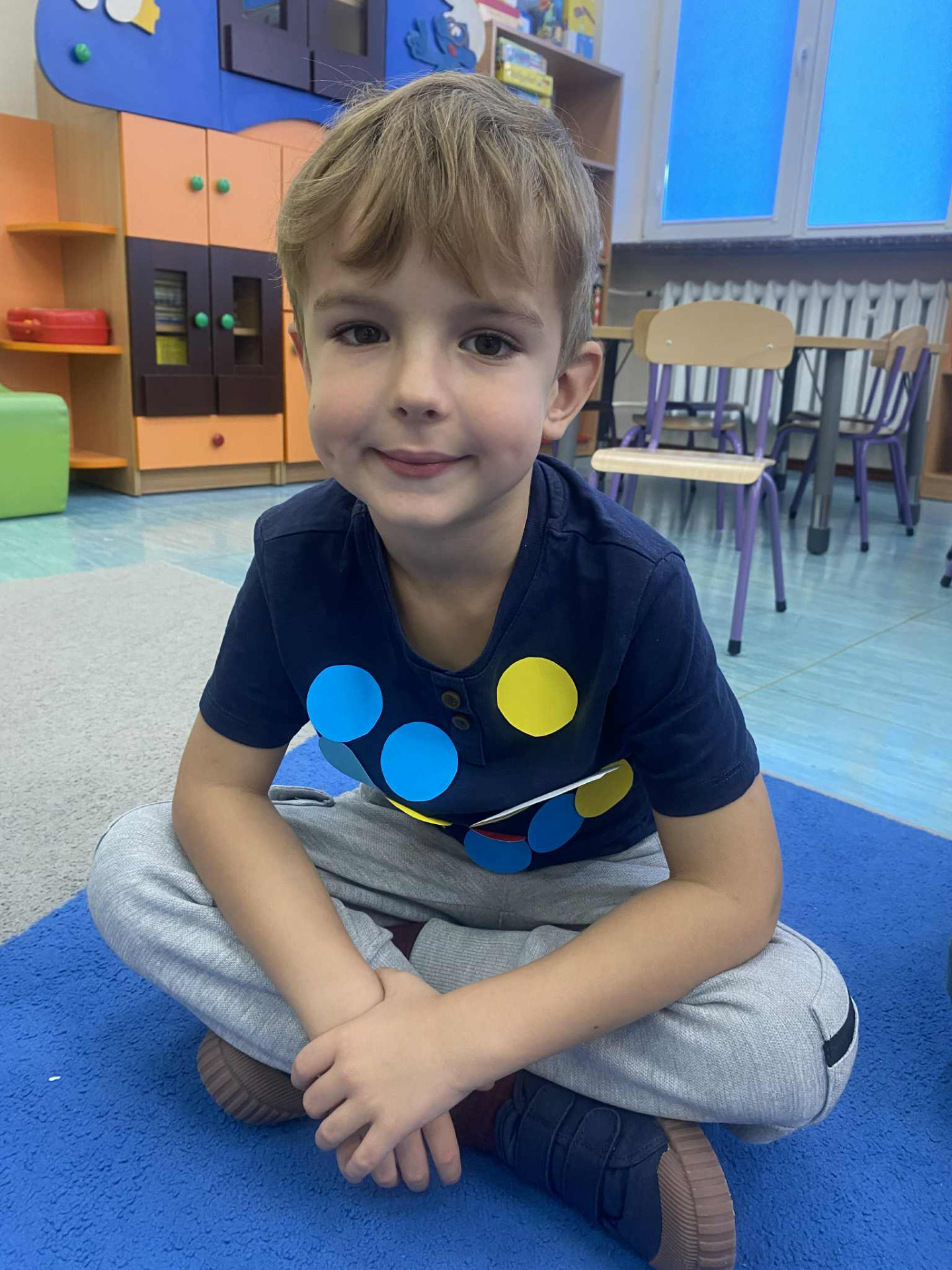 Dzieci tego dnia przystroiły się w kolorowe kropki oraz chętnie uczestniczyły w zabawach i zadaniach, oczywiście z kropką w roli głównej. Wspólnie odkryliśmy, że kropki towarzyszą nam dookoła w naszym codziennym życiu, nawet na naszym ciele i u zwierząt. Dzieci wymyślały co może powstać  z kropki, tworzyły ciekawe prace plastyczne. Wspólnie liczyliśmy, segregowaliśmy kolorowe kropki i bawiliśmy się z kropkami przy muzyce.