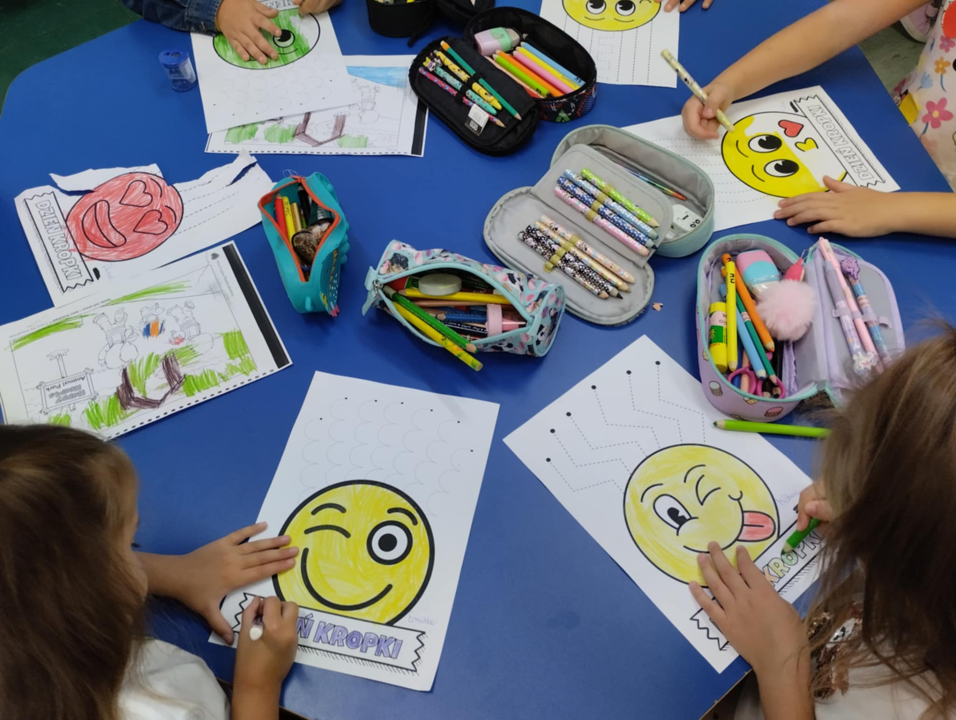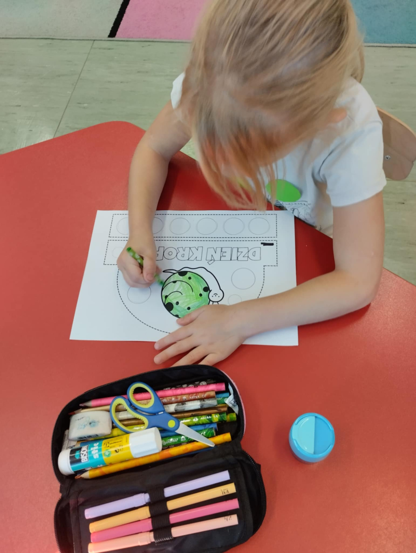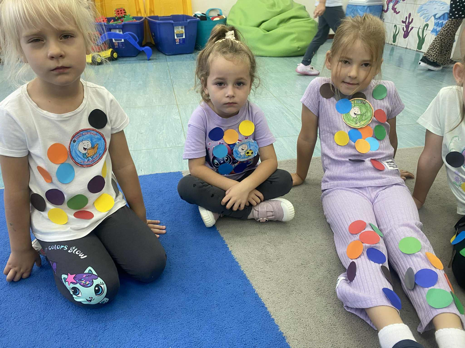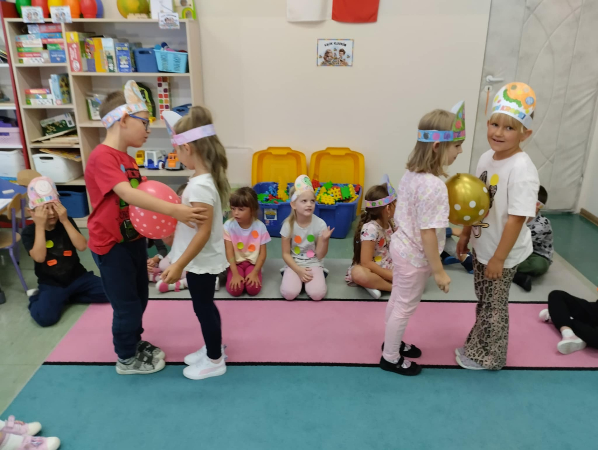 Dzieci tego dnia przystroiły się w kolorowe kropki oraz chętnie uczestniczyły w zabawach i zadaniach, oczywiście z kropką w roli głównej. Wspólnie odkryliśmy, że kropki towarzyszą nam dookoła w naszym codziennym życiu, nawet na naszym ciele i u zwierząt. Dzieci wymyślały co może powstać  z kropki, tworzyły ciekawe prace plastyczne. Wspólnie liczyliśmy, segregowaliśmy kolorowe kropki i bawiliśmy się z kropkami przy muzyce.