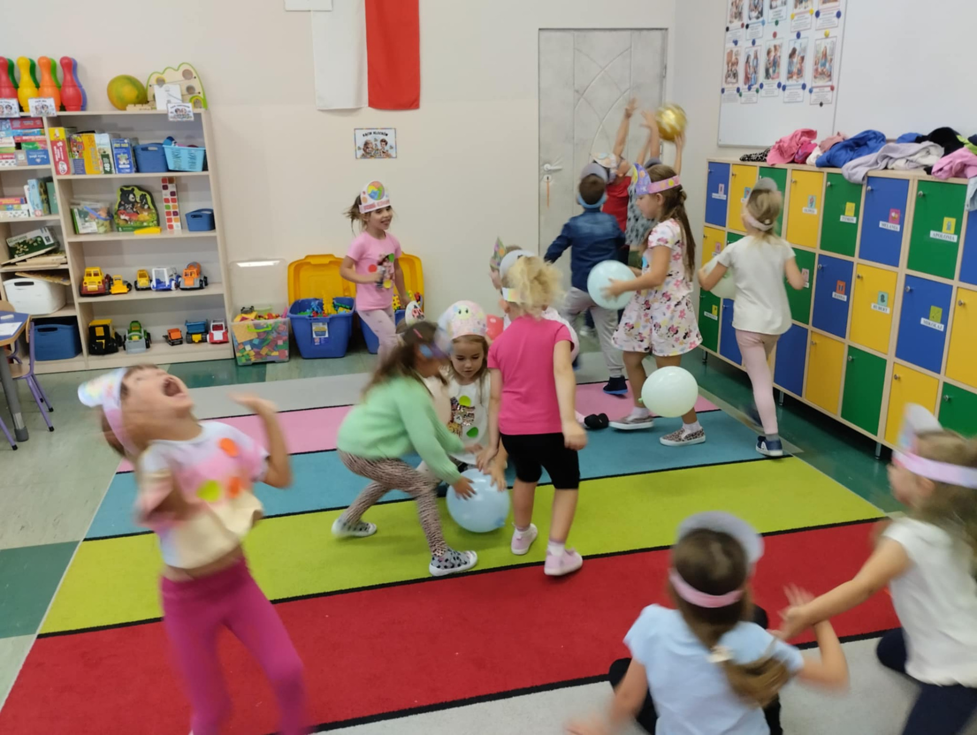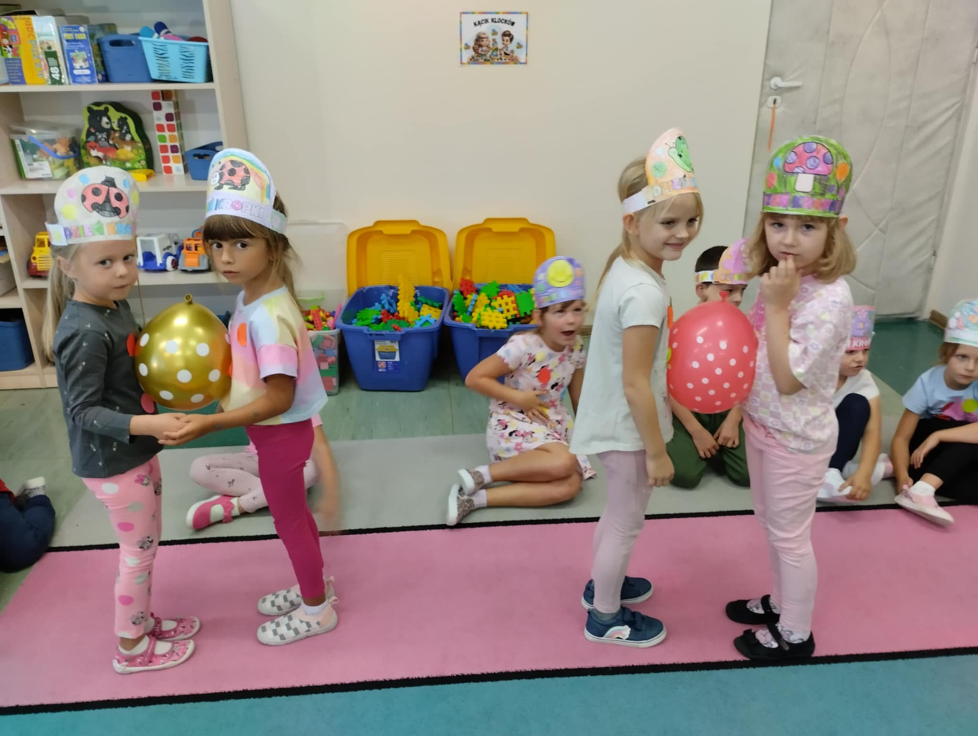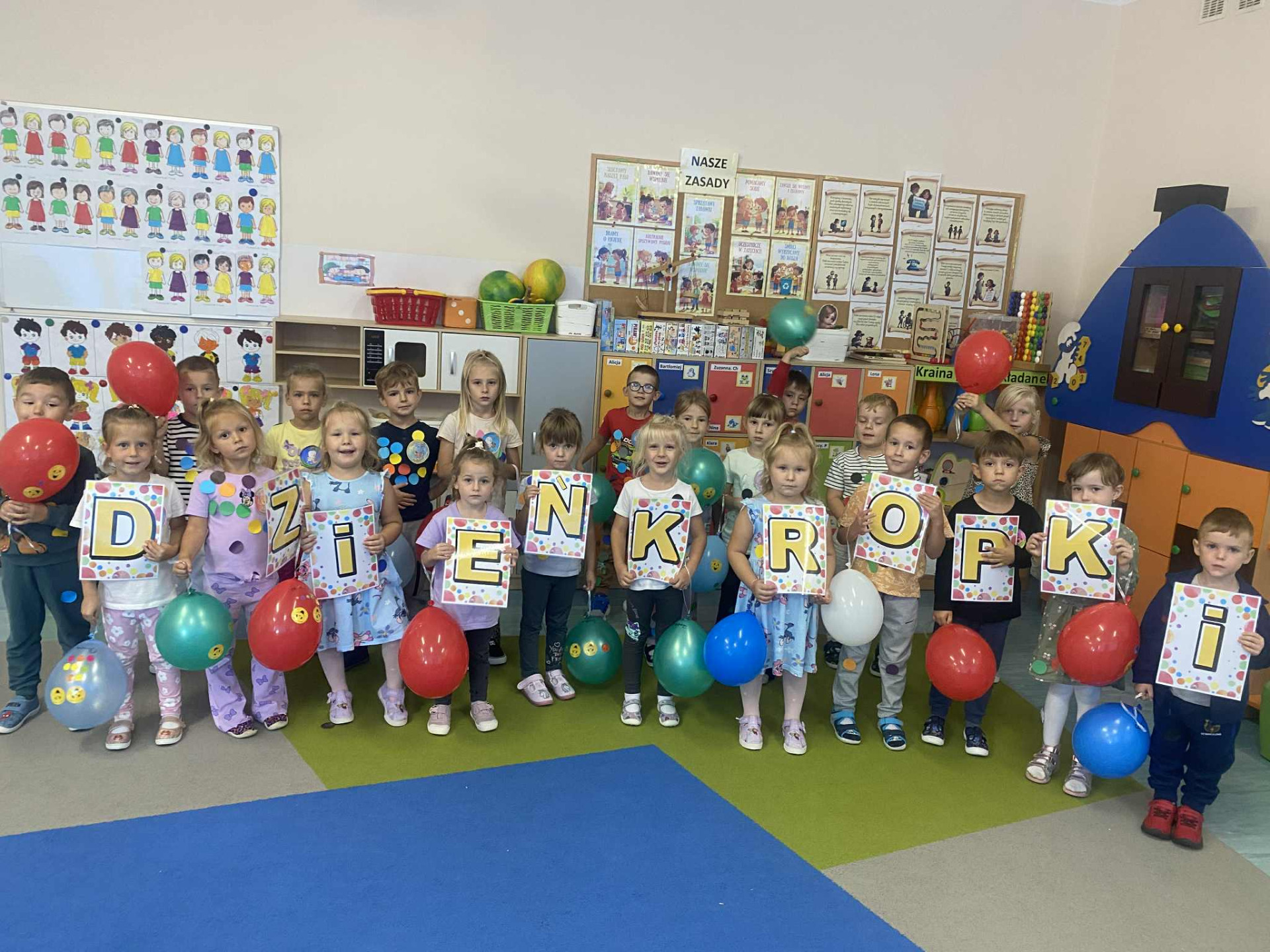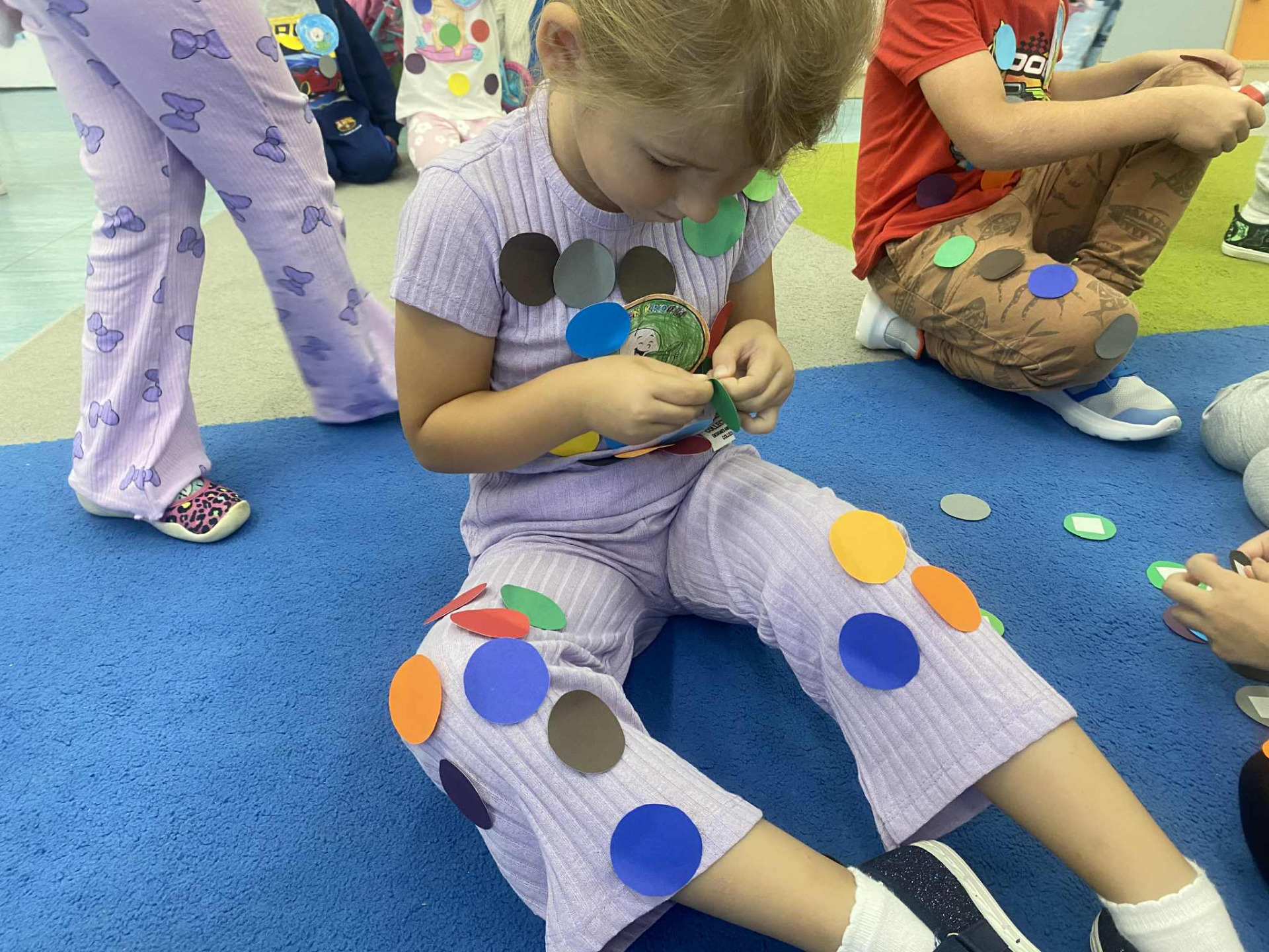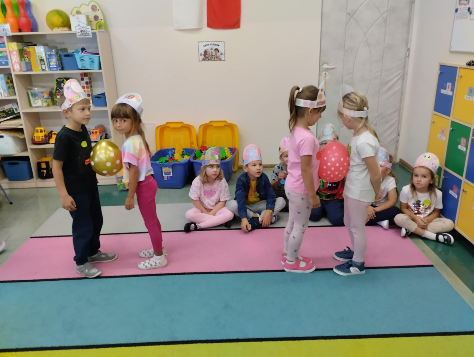 Dzieci tego dnia przystroiły się w kolorowe kropki oraz chętnie uczestniczyły w zabawach i zadaniach, oczywiście z kropką w roli głównej. Wspólnie odkryliśmy, że kropki towarzyszą nam dookoła w naszym codziennym życiu, nawet na naszym ciele i u zwierząt. Dzieci wymyślały co może powstać  z kropki, tworzyły ciekawe prace plastyczne. Wspólnie liczyliśmy, segregowaliśmy kolorowe kropki i bawiliśmy się z kropkami przy muzyce.