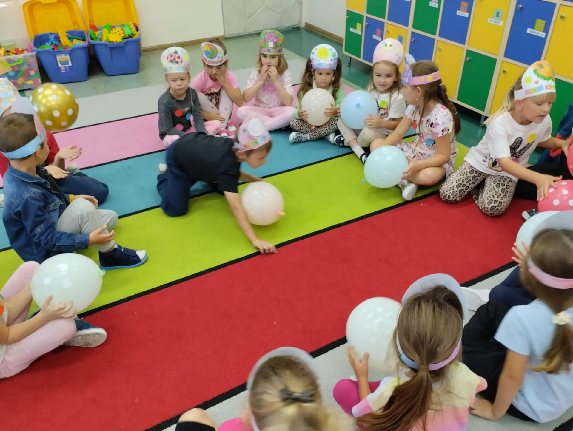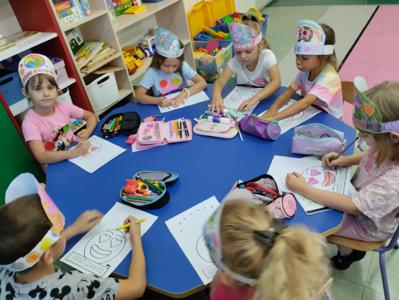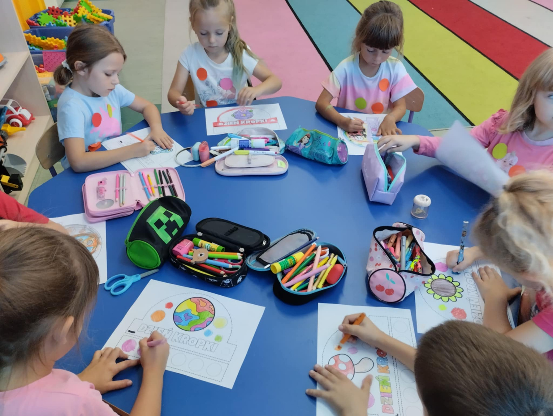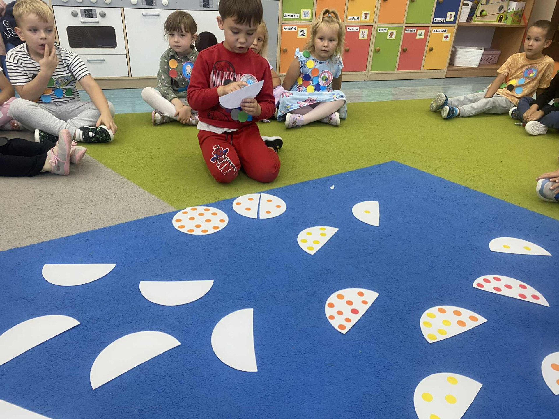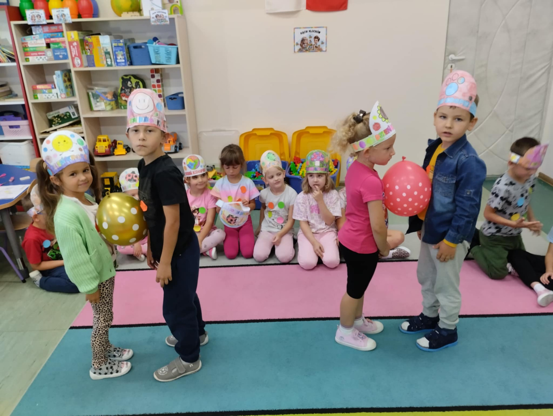 Dzieci tego dnia przystroiły się w kolorowe kropki oraz chętnie uczestniczyły w zabawach i zadaniach, oczywiście z kropką w roli głównej. Wspólnie odkryliśmy, że kropki towarzyszą nam dookoła w naszym codziennym życiu, nawet na naszym ciele i u zwierząt. Dzieci wymyślały co może powstać  z kropki, tworzyły ciekawe prace plastyczne. Wspólnie liczyliśmy, segregowaliśmy kolorowe kropki i bawiliśmy się z kropkami przy muzyce.
