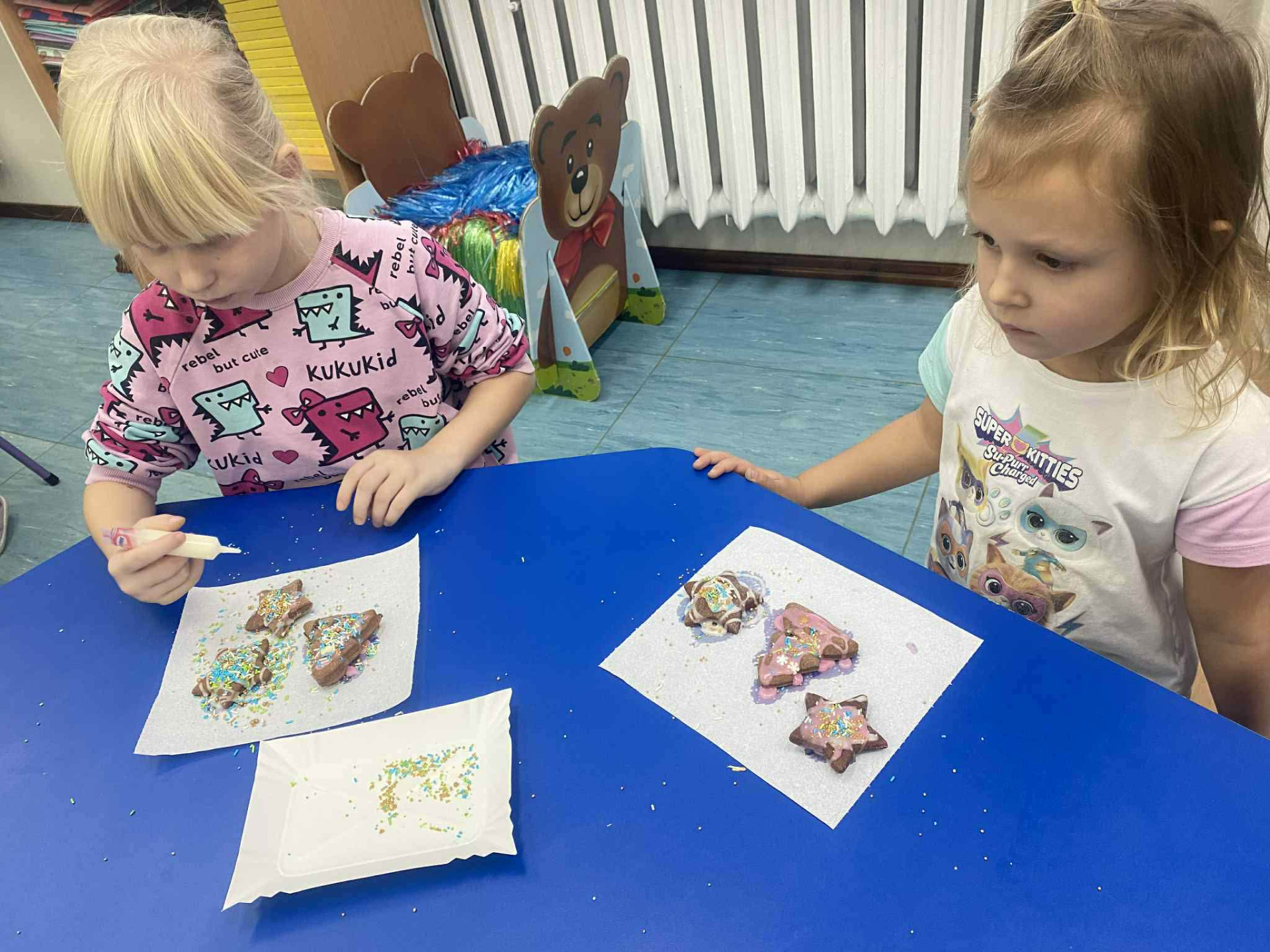 11 grudnia 2025 roku przedszkolaki dekorowały pachnące pierniki, które zostały wcześniej upieczone przez naszą niezastąpioną kucharkę – Panią Alinę. Tego dnia przy stolikach królowały miseczki z lukrem, kolorowe posypki oraz różnorodne dekoracje cukiernicze. Każdy pierniczek był wyjątkowy i odzwierciedlał pomysłowość małych artystów.