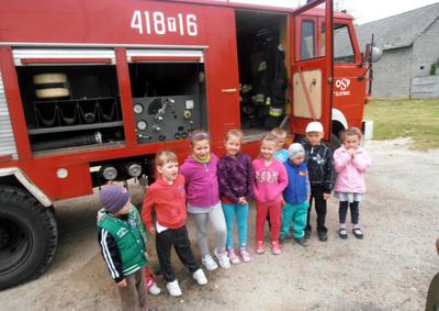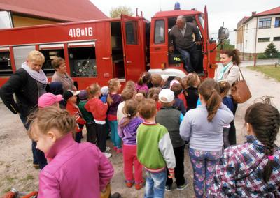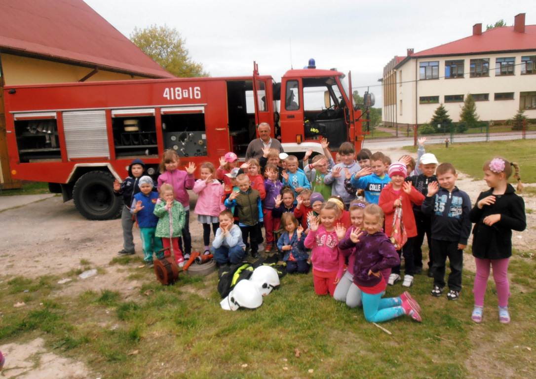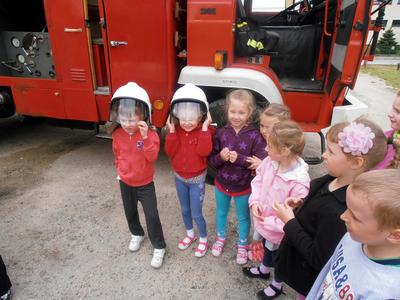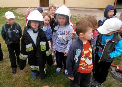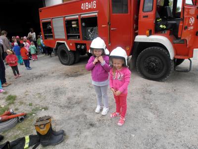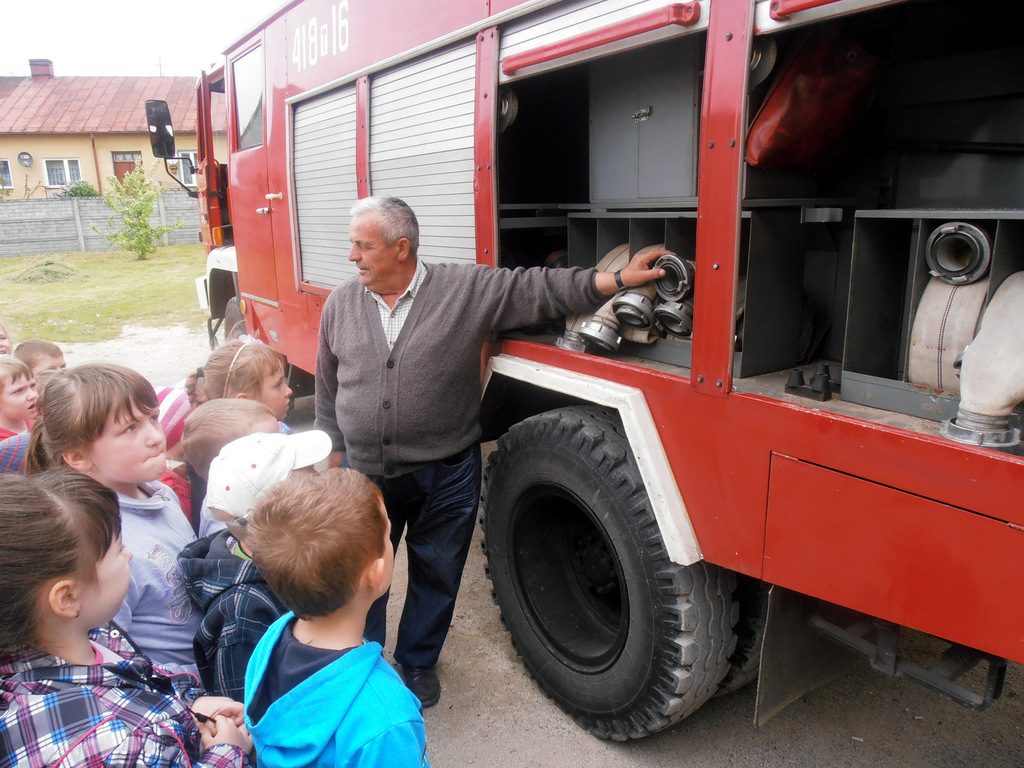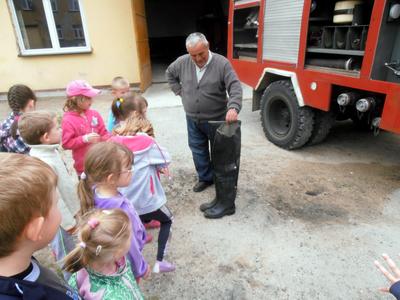 9 maja2014r, przedszkolaki udały się na wycieczkę do Ochotniczej Straży Pożarnej. Dzięki uprzejmości Strażaka Pana Mieczysława Skrzypczyka dzieci obejrzały wyposażenie wozu strażackiego. Wysłuchały opowieści o trudnej, odpowiedzialnej i niebezpiecznej pracy strażaka oraz akcjach ratowniczo-gaśniczych. Niebywałą atrakcją dla dzieci była możliwość przymierzenia stroju strażaka. Po takiej wycieczce dzieci przyznały, że ten zawód bardzo im się podoba, a niejedno w przyszłości chciałoby zostać Strażakiem.